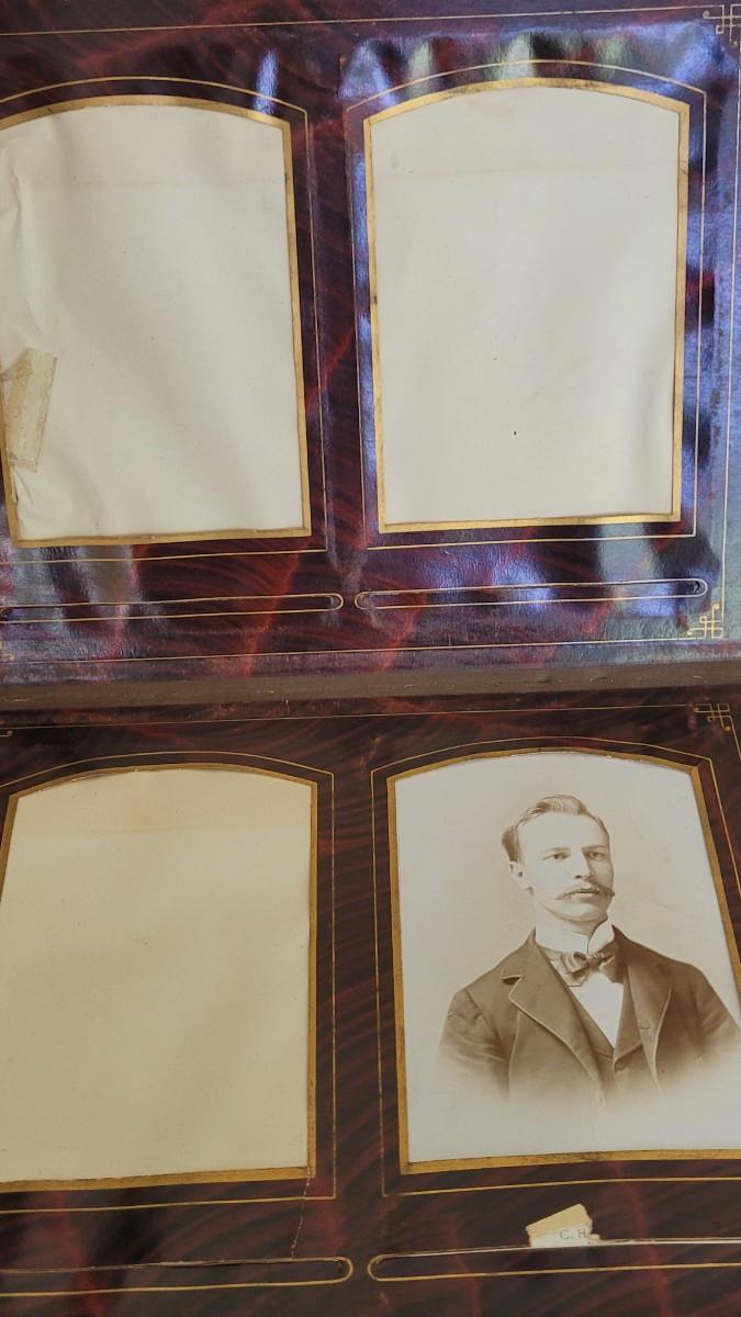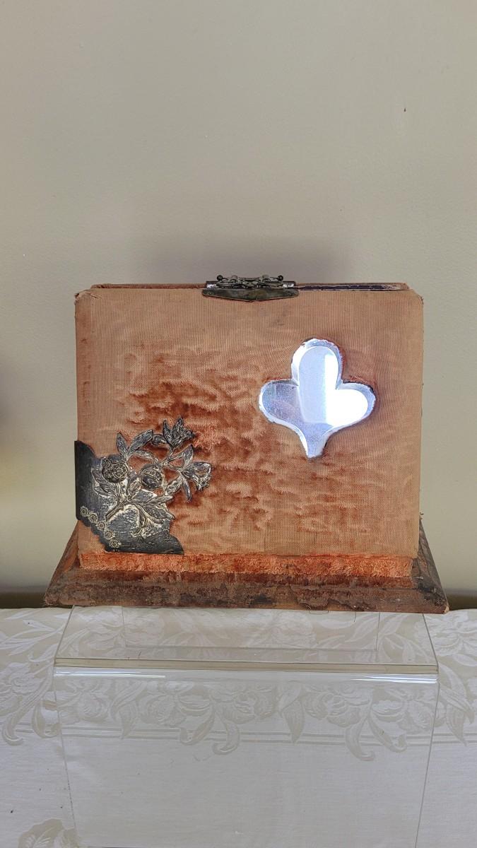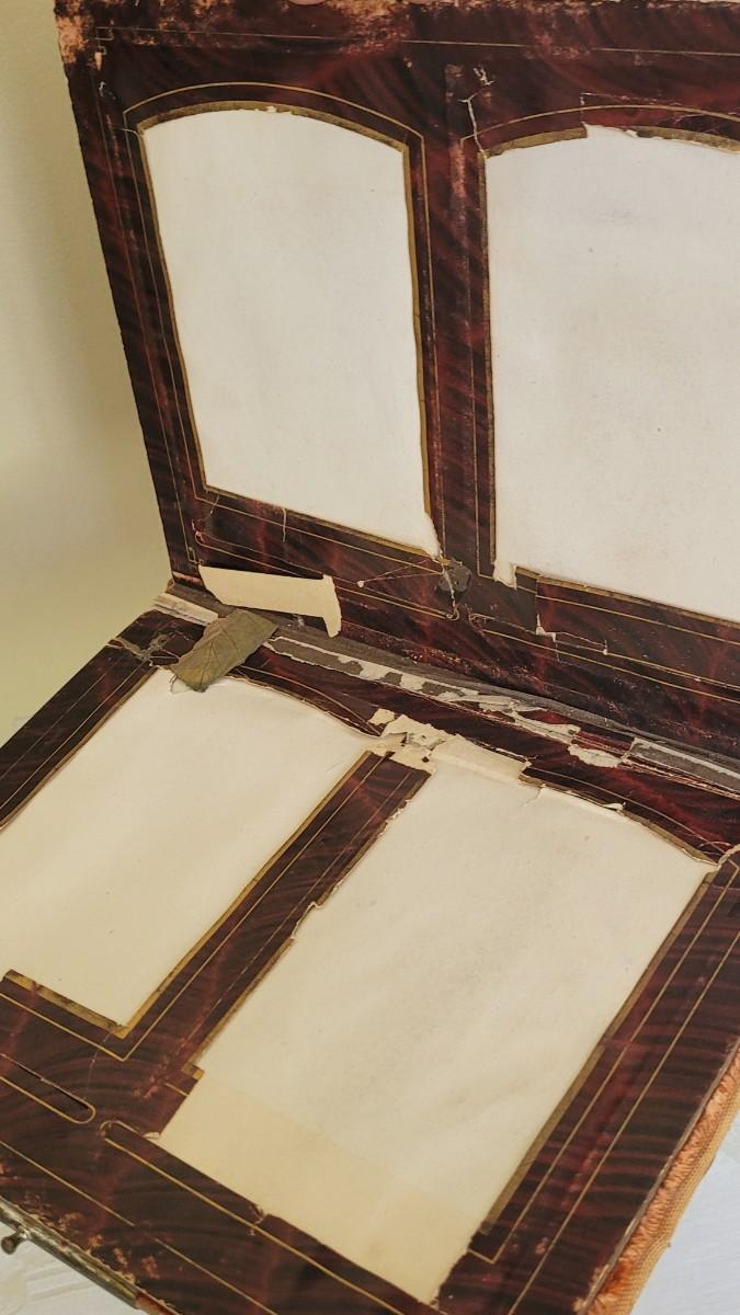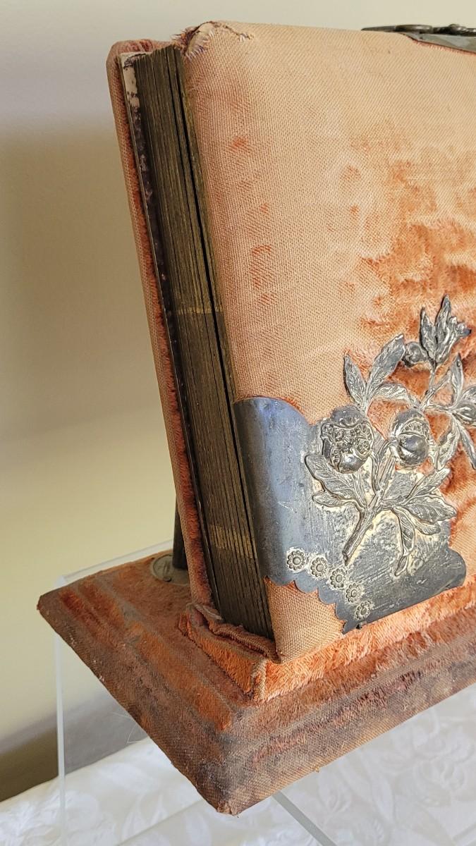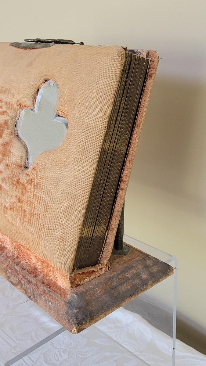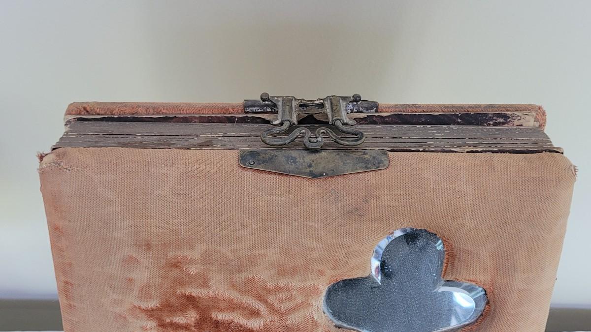 Deco on outside of album features a mirror and metal roses. Included with the album are many antique photographs. Some of the pages have damage.