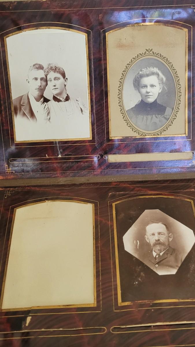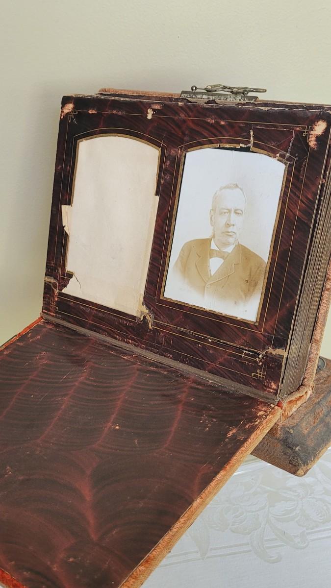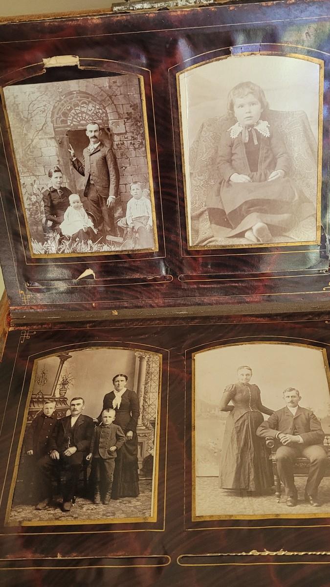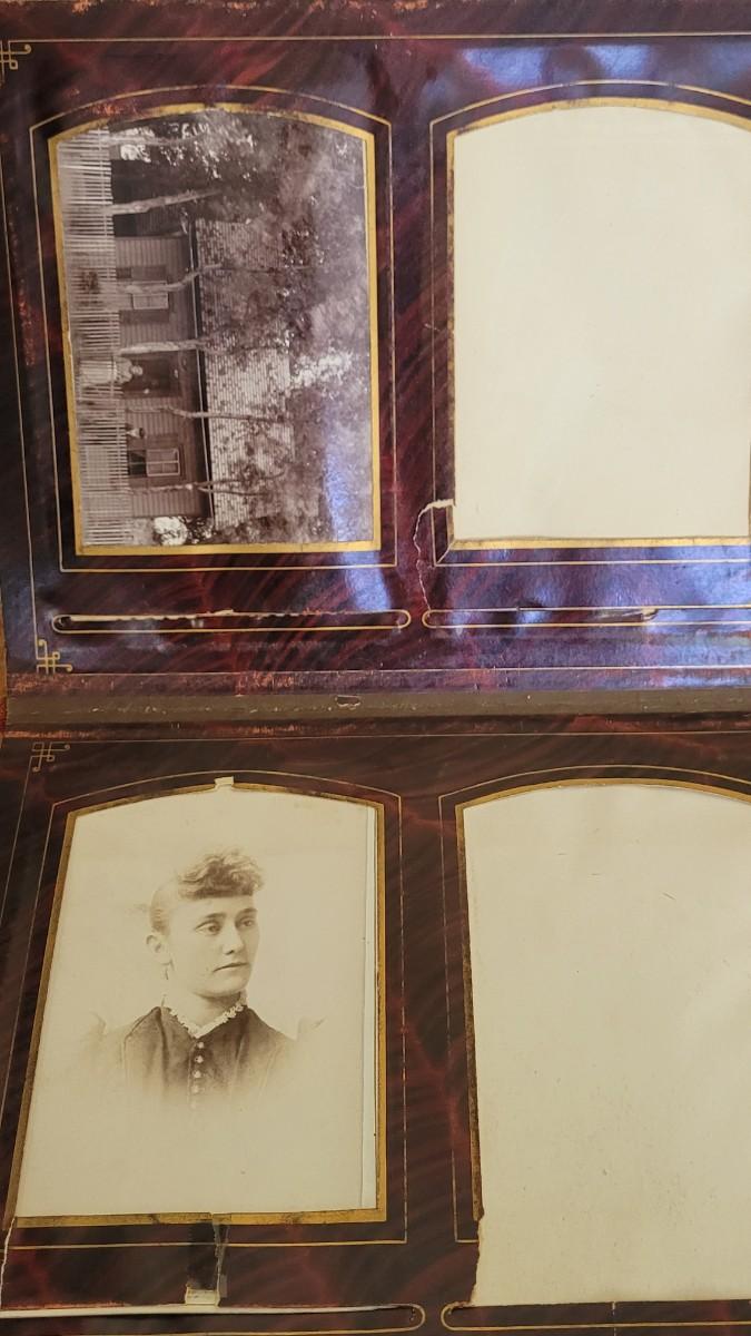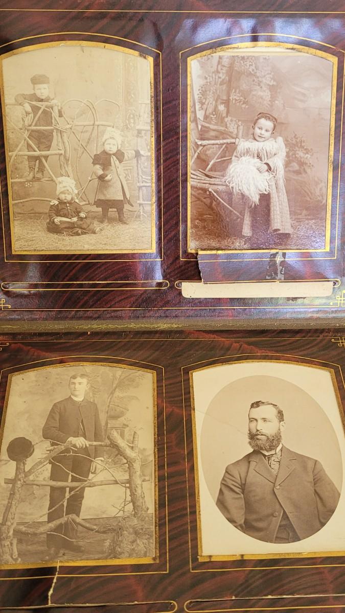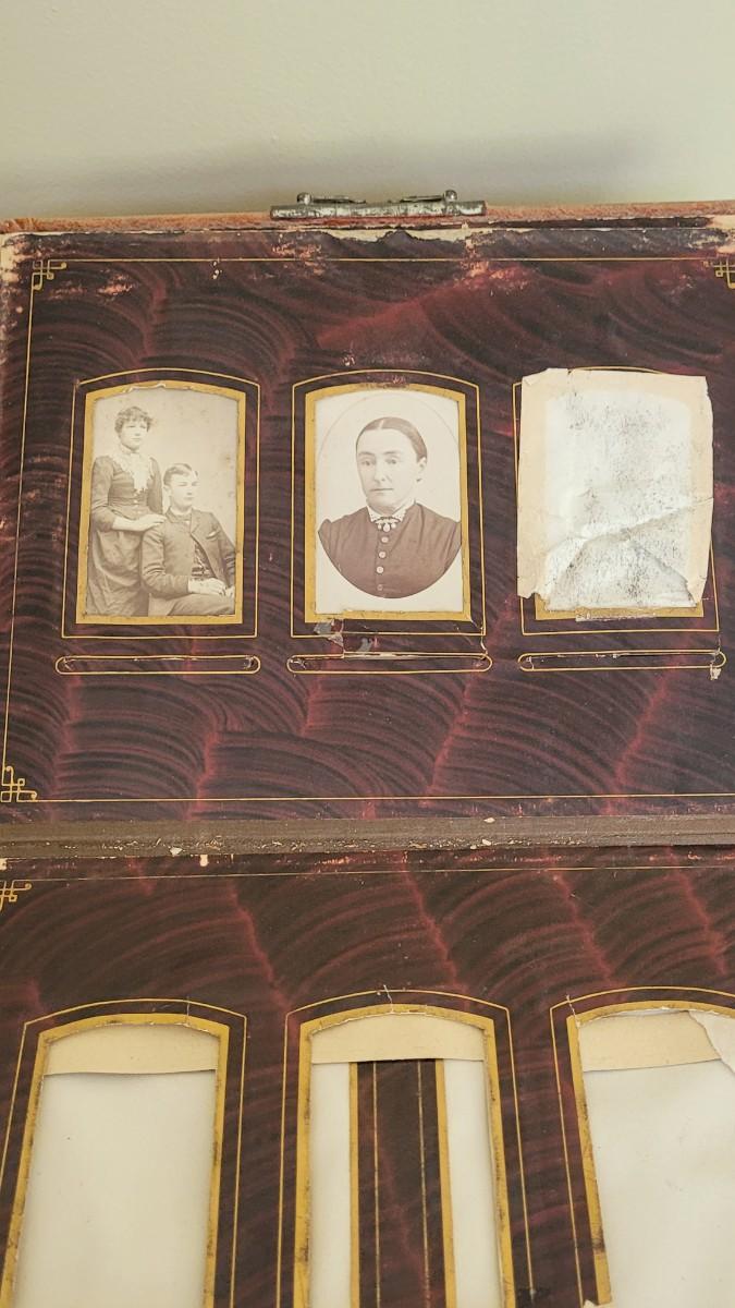 Deco on outside of album features a mirror and metal roses. Included with the album are many antique photographs. Some of the pages have damage.