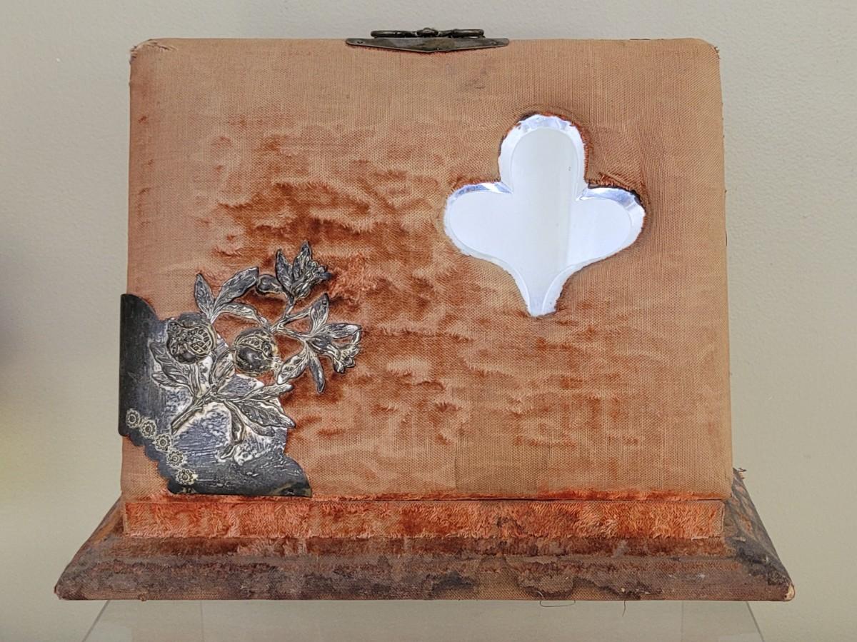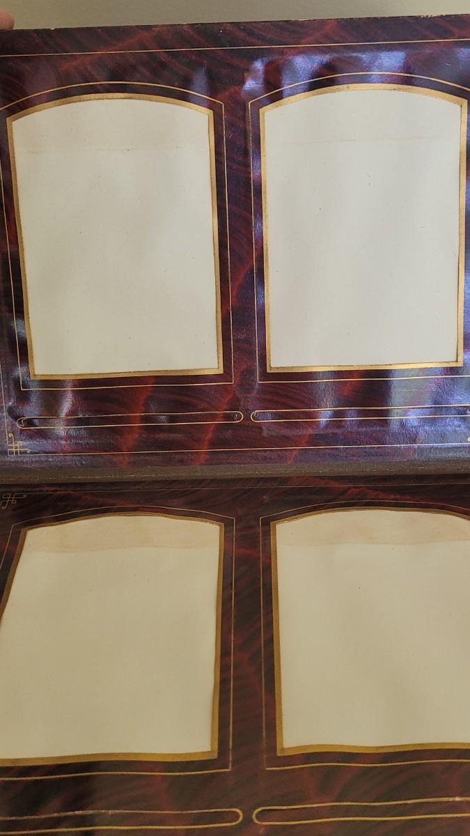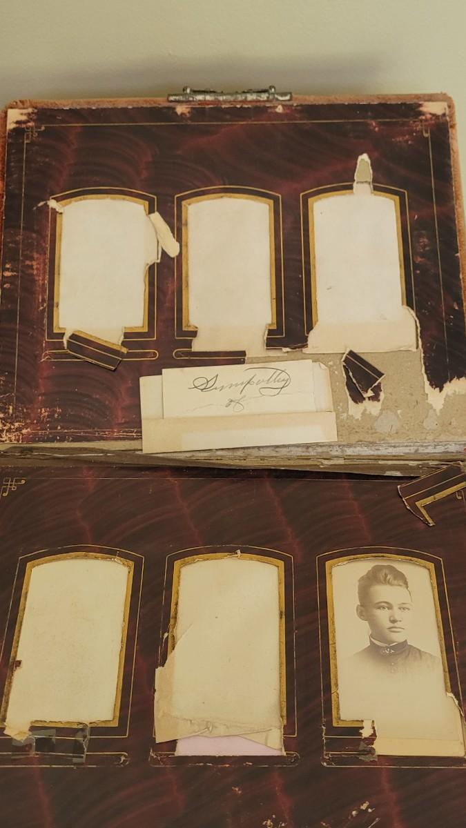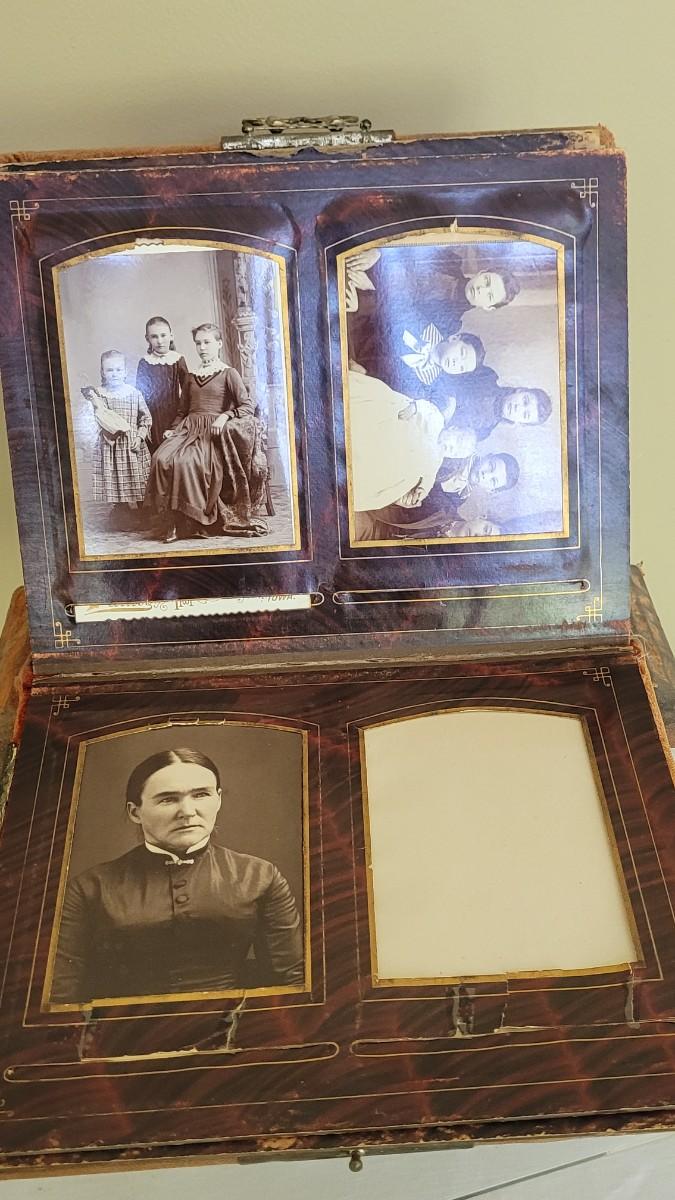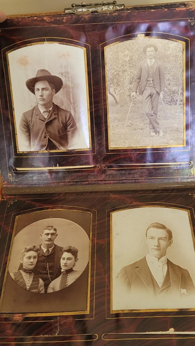 Deco on outside of album features a mirror and metal roses. Included with the album are many antique photographs. Some of the pages have damage.