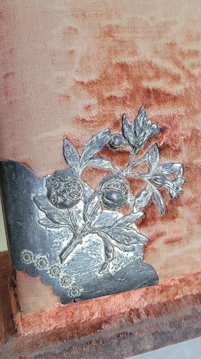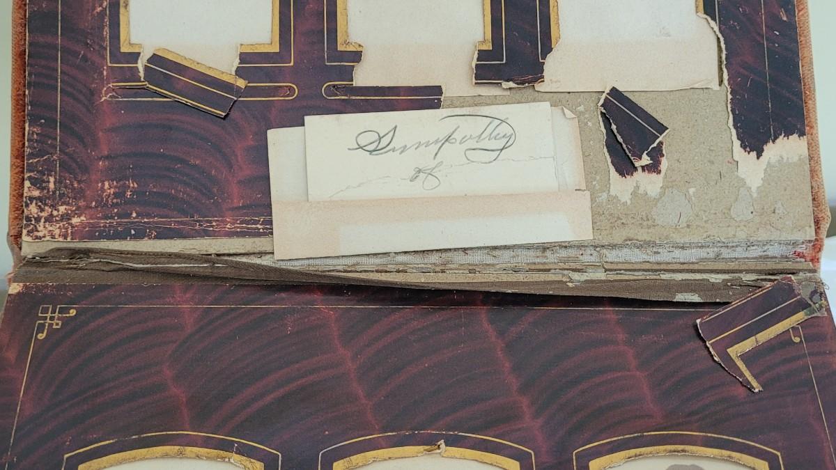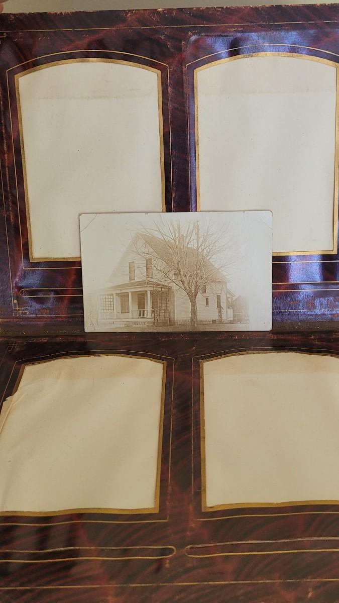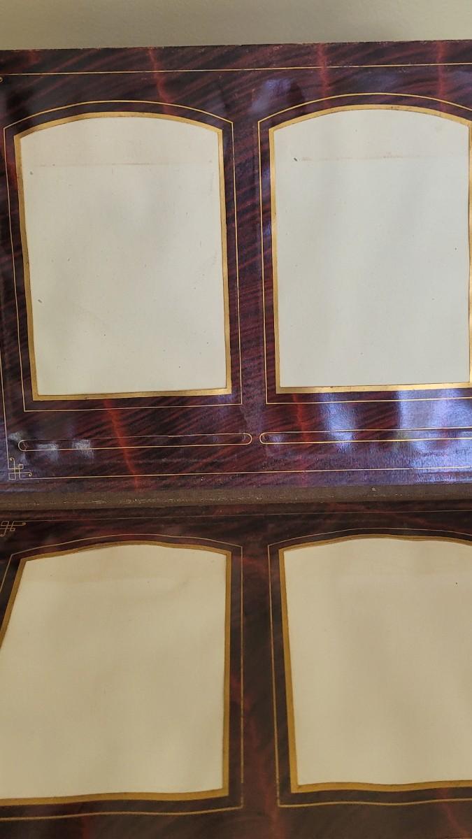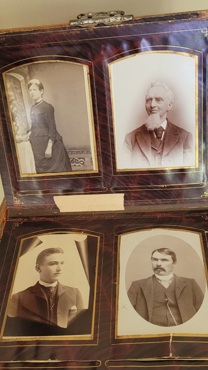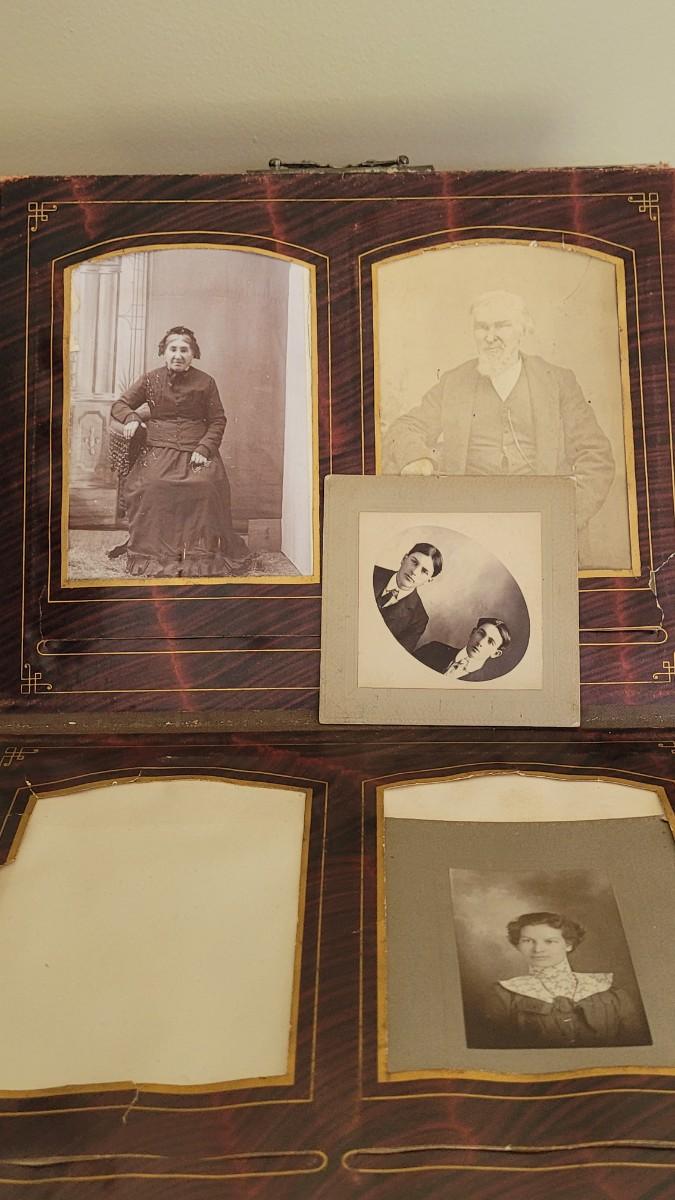 Deco on outside of album features a mirror and metal roses. Included with the album are many antique photographs. Some of the pages have damage.