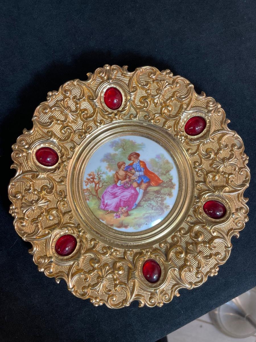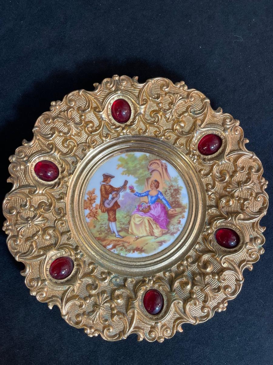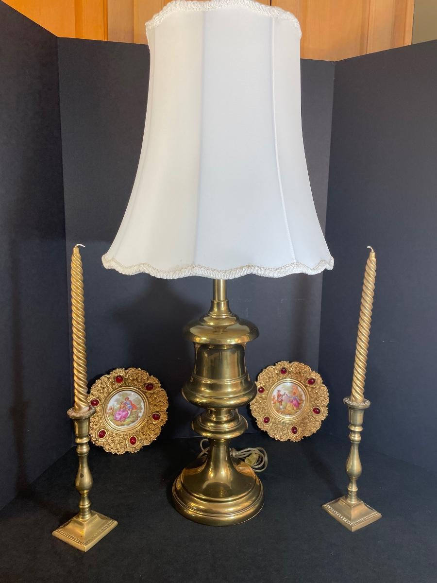 Brass 36" Lamp with shade, set of 2 brass taper candleholders with candles and set of 2 gold-plated brass 7" wall art with porcelain centers.