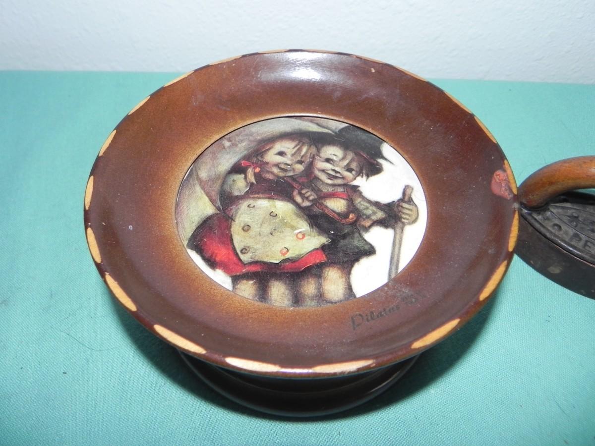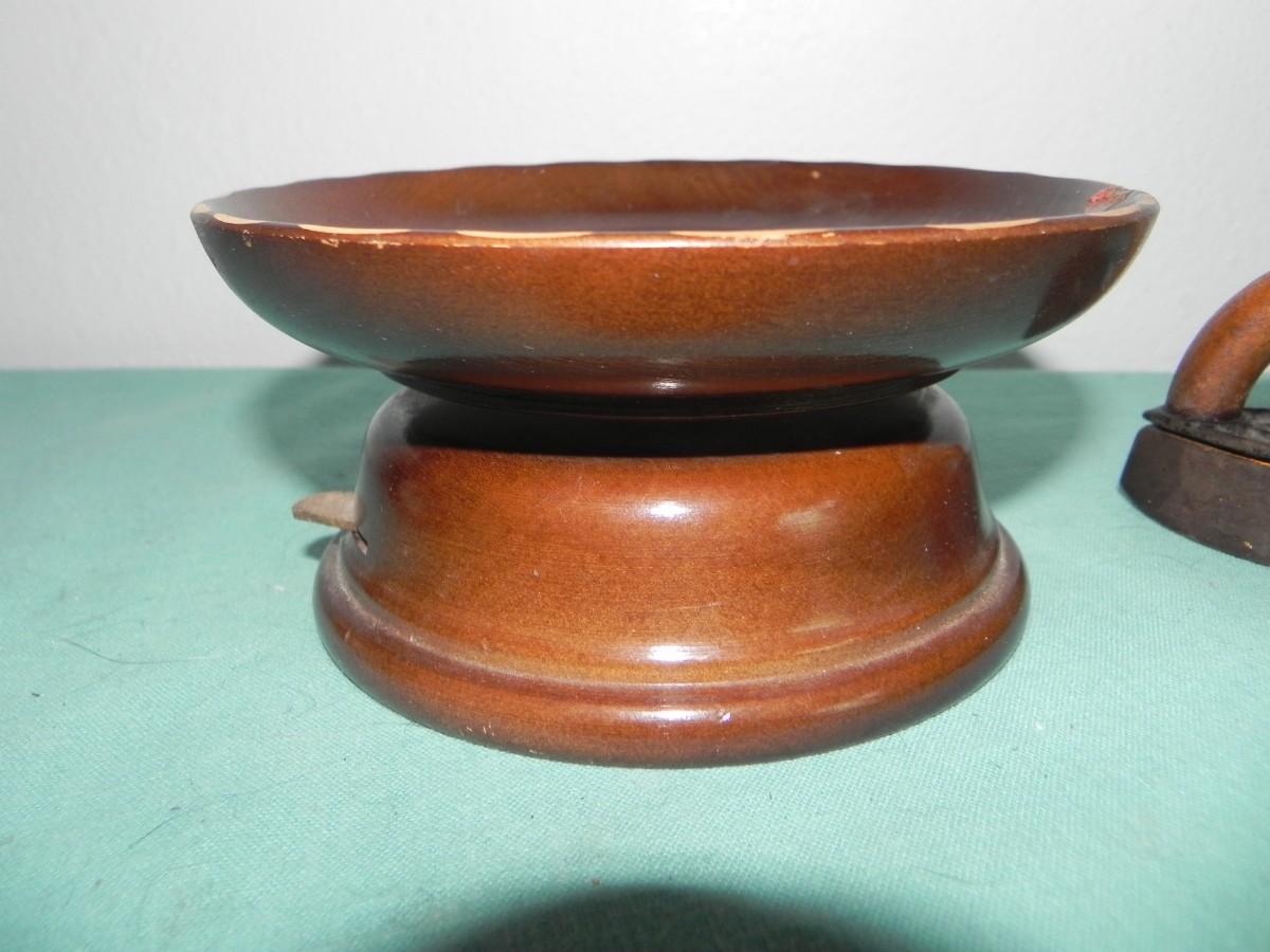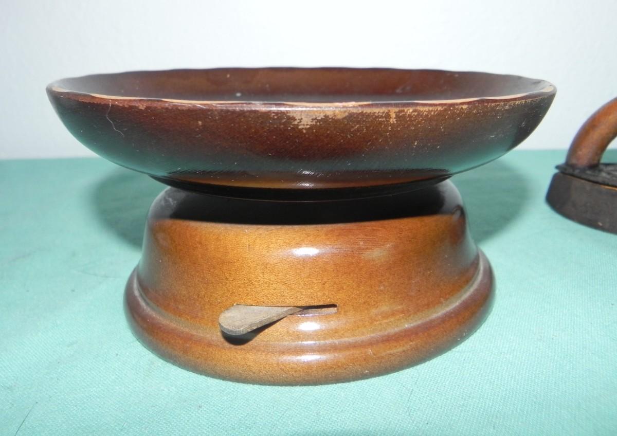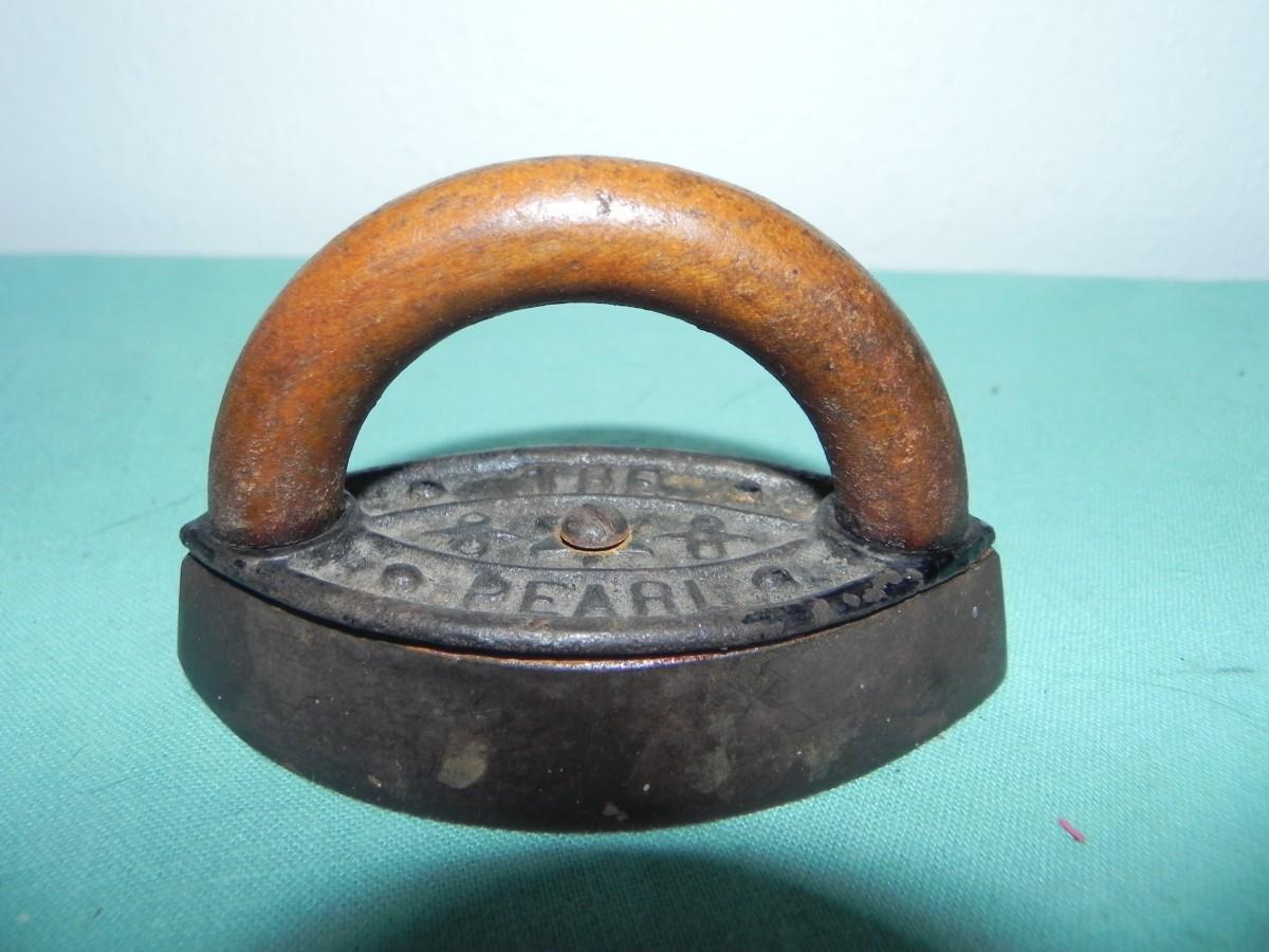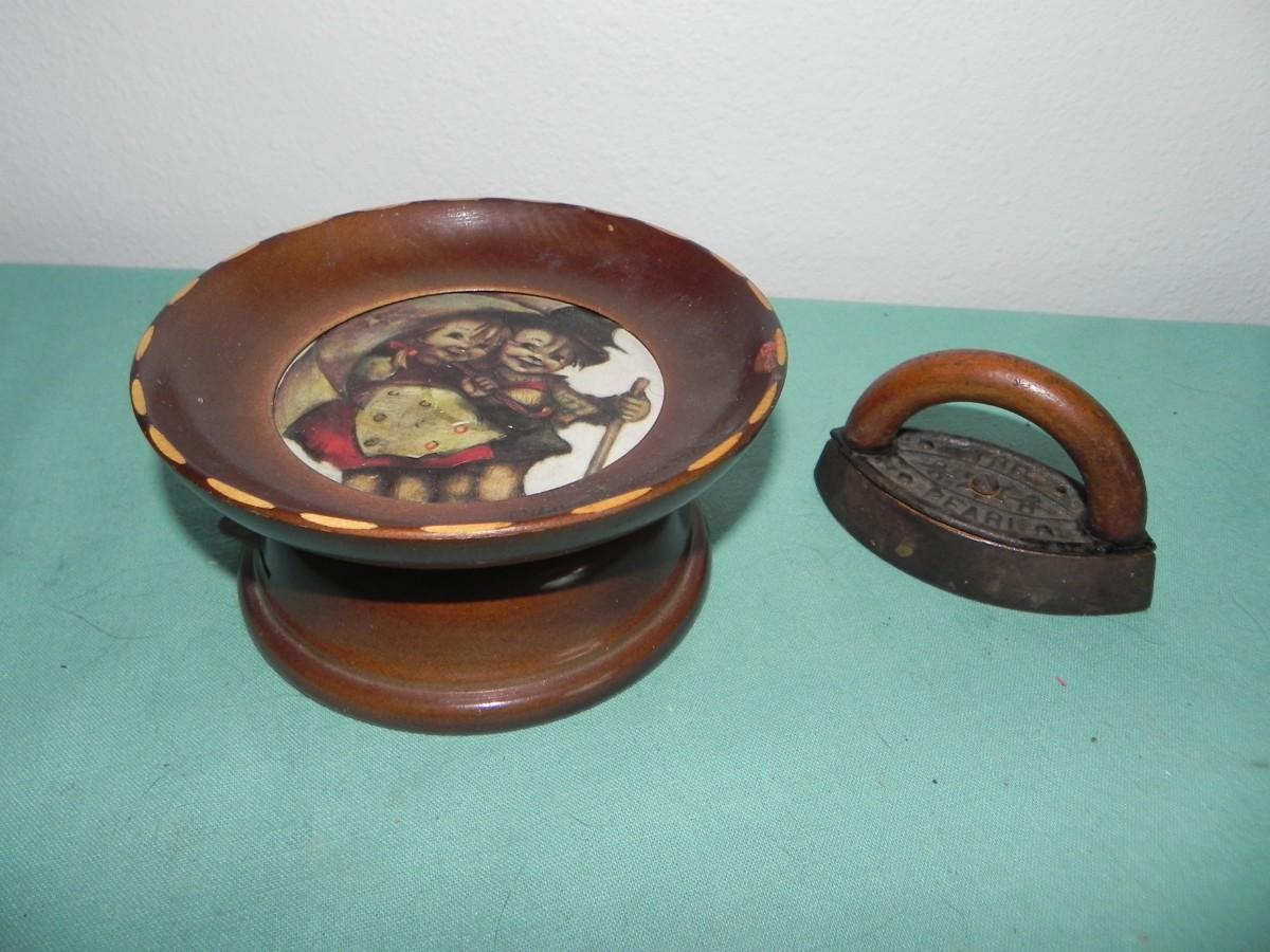 VINTAGE MUSIC PLAYER MEASURES APPROX. 5" ROUND AND CAST IRON CLOTHES IRON 3.5" WITH WOODEN HANDLE