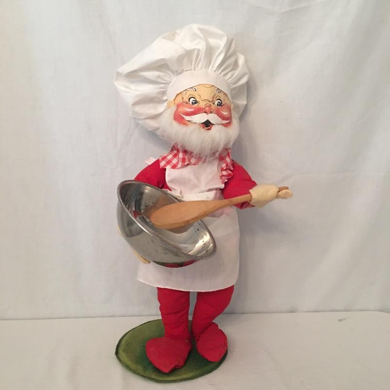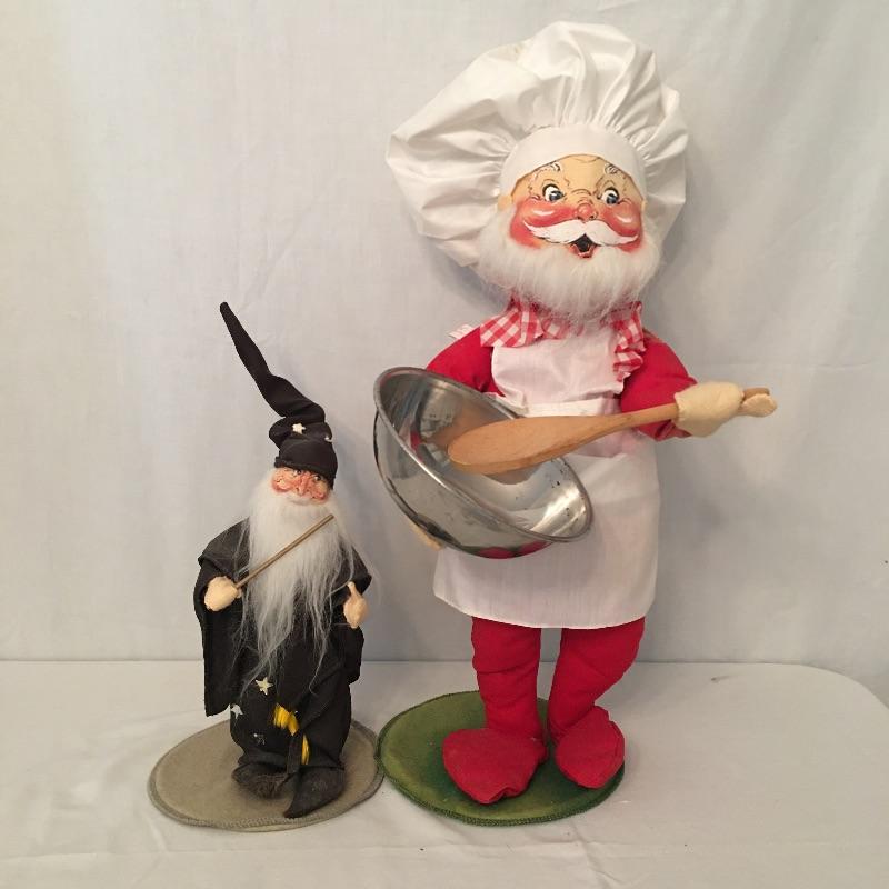 Annalee chef from 87 and a wizard from 90. Get your collection started or add to your existing collection with these whimsical dolls. Chef measures 20” tall and has what looks to be mildew on hat, see pictures.