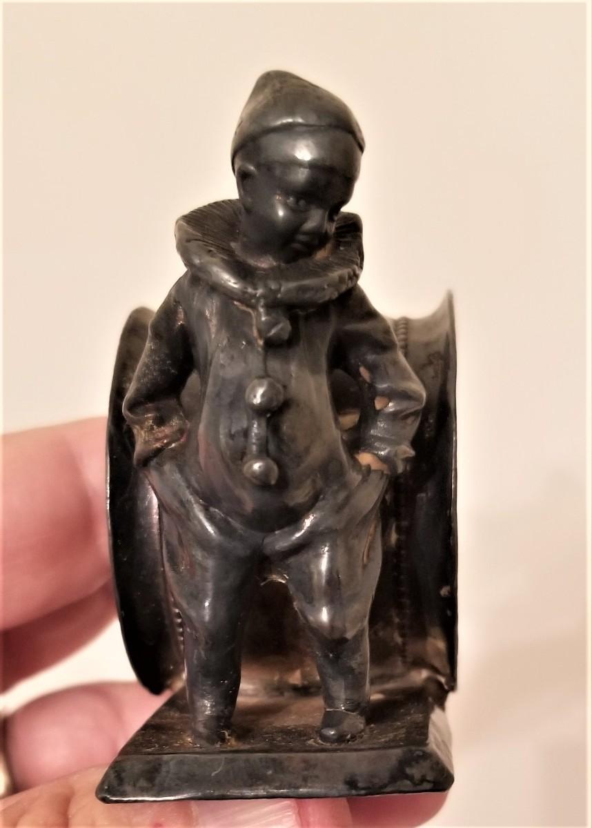 You don't see the real thing too often down here, but this is NOT a repo. Made by the Homan Silverplate Company, 3" long at the base and 2.25" tall. Depicts the "sad clown" from the opera Pagliacci. Antique condition - highly collectible.