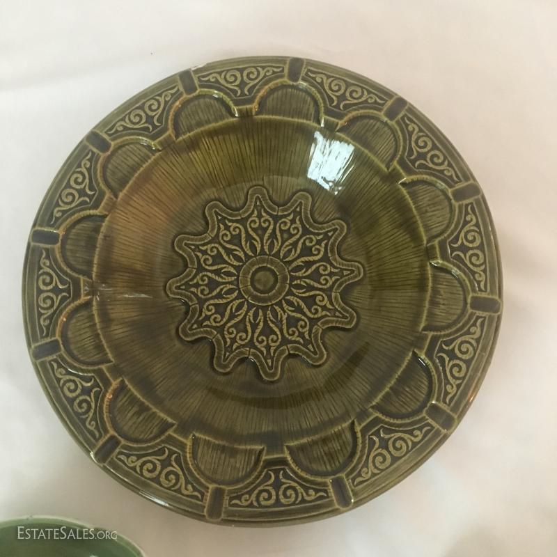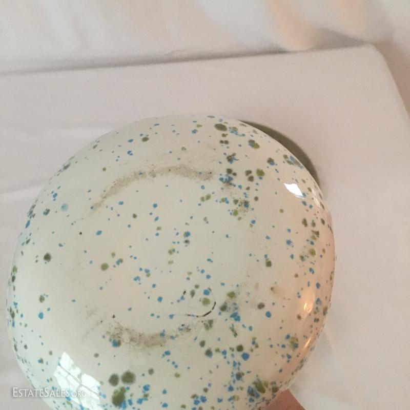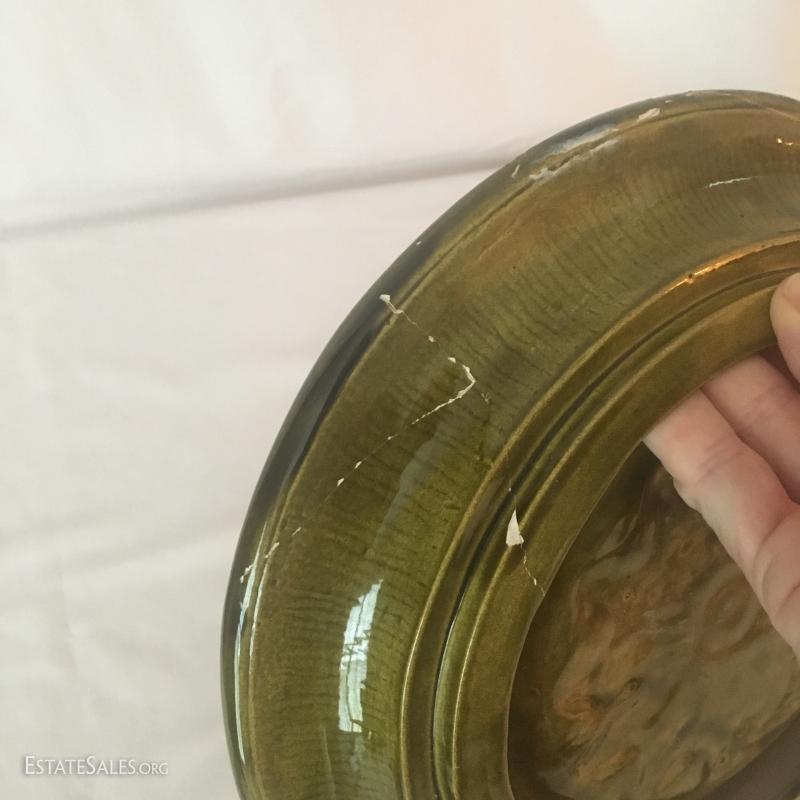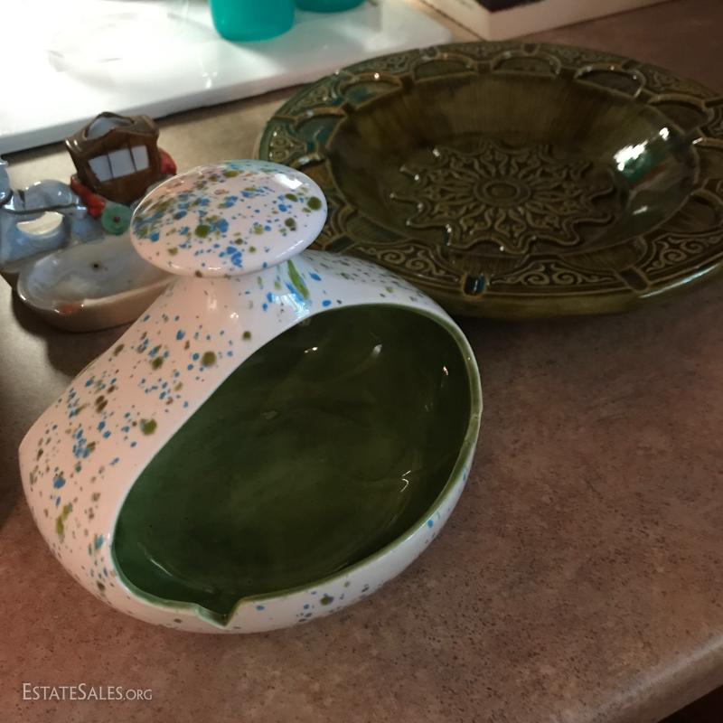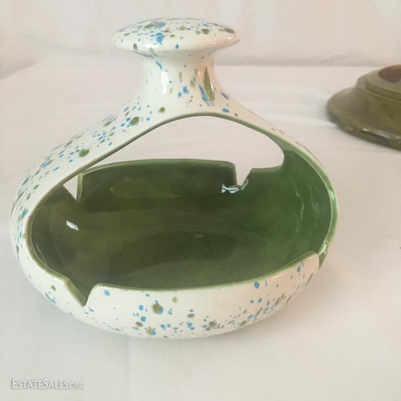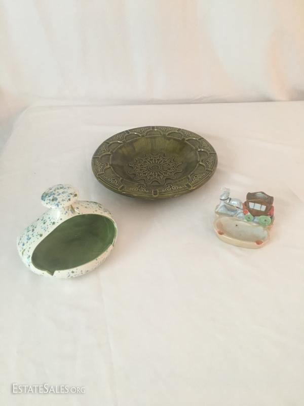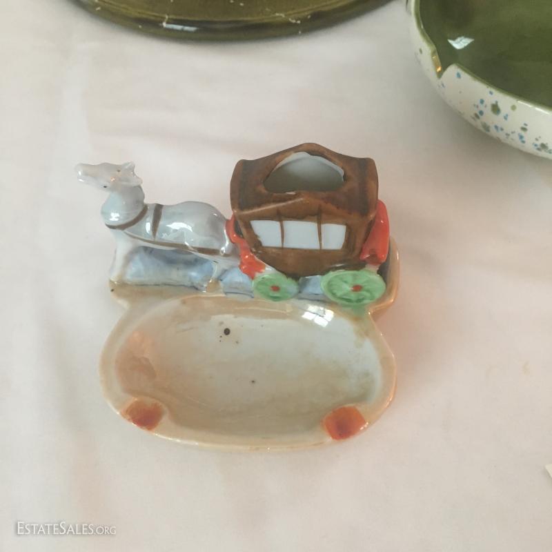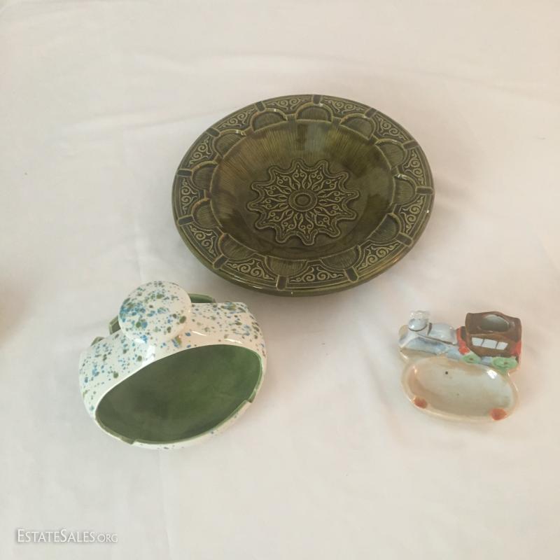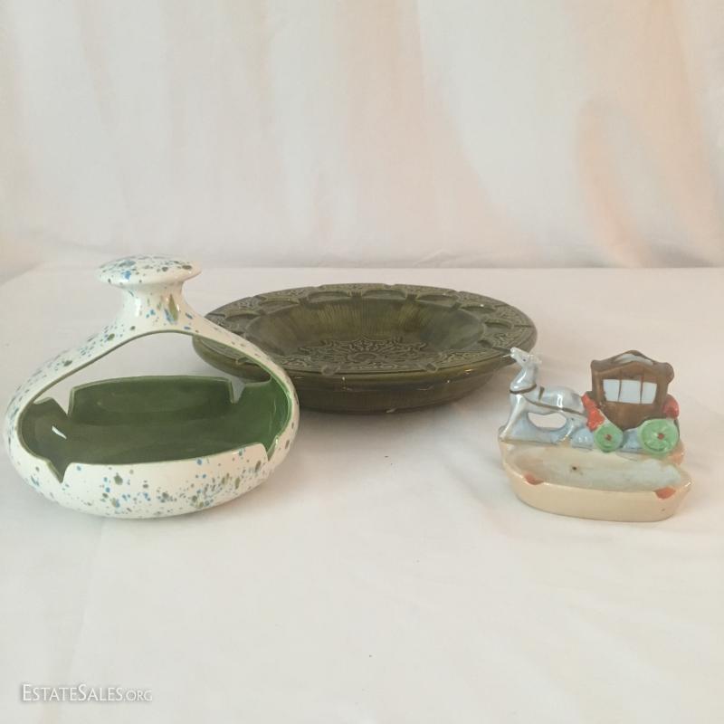 All vintage style, made from ceramics. Large green one had chips and has been repaired (see photos). Measures 10.5" diameter. Small horse and buggy ashtray is made in Japan. This lot is available for shipping or local pick up in Asheville, NC.