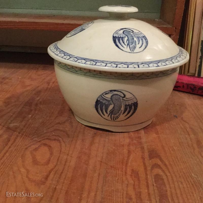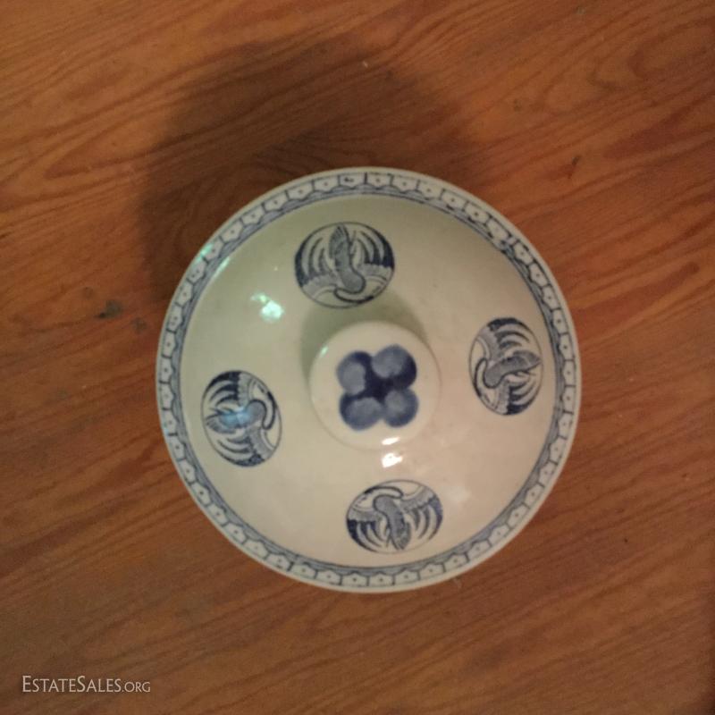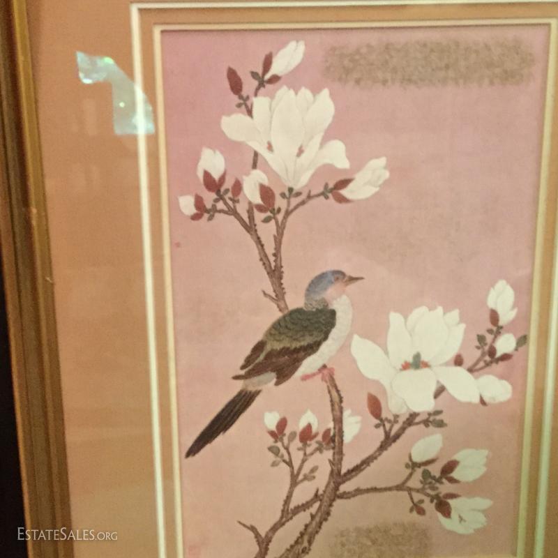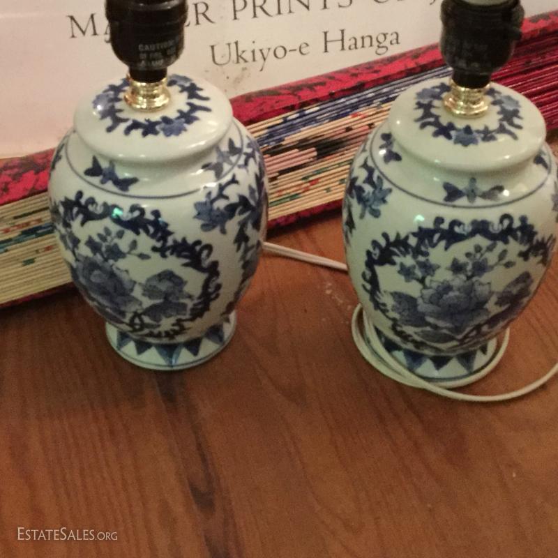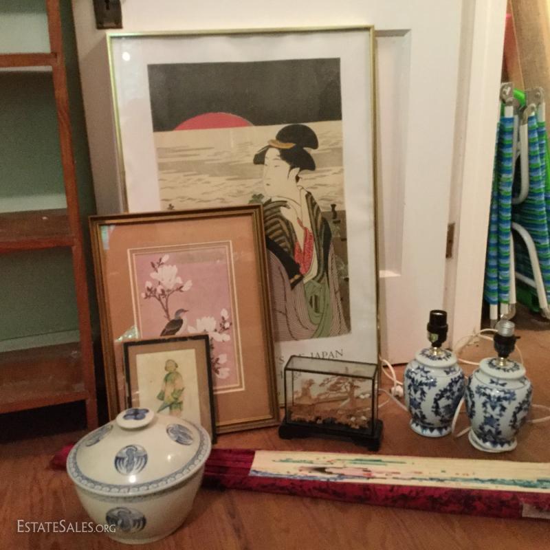 Asian items: Two blue & white lamps, large handpainted van, blue/white covered dish, framed bird print with gold gilding and more.
