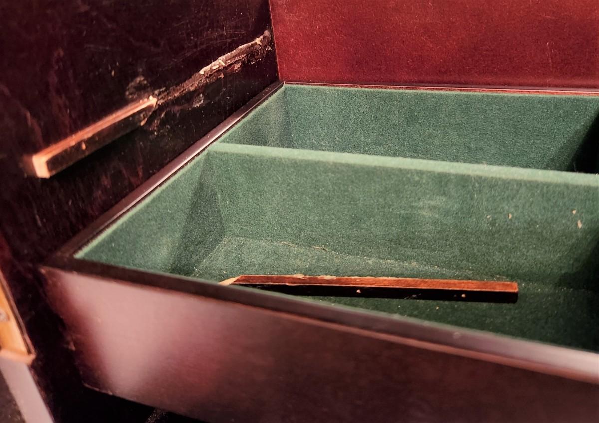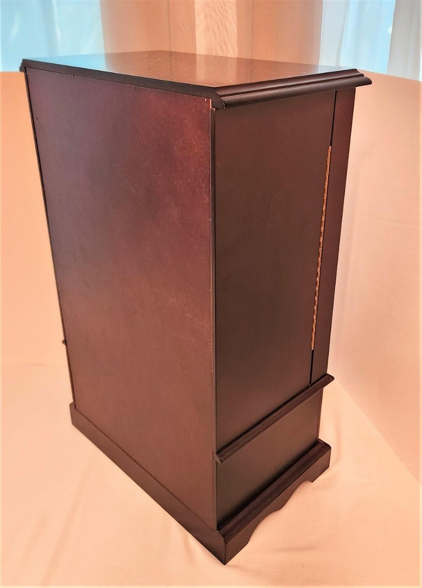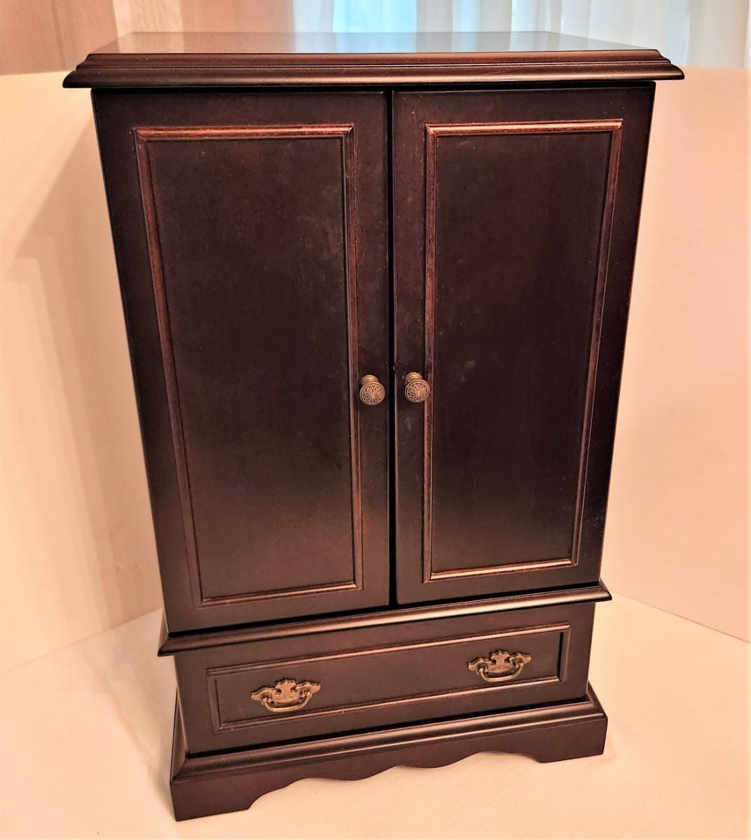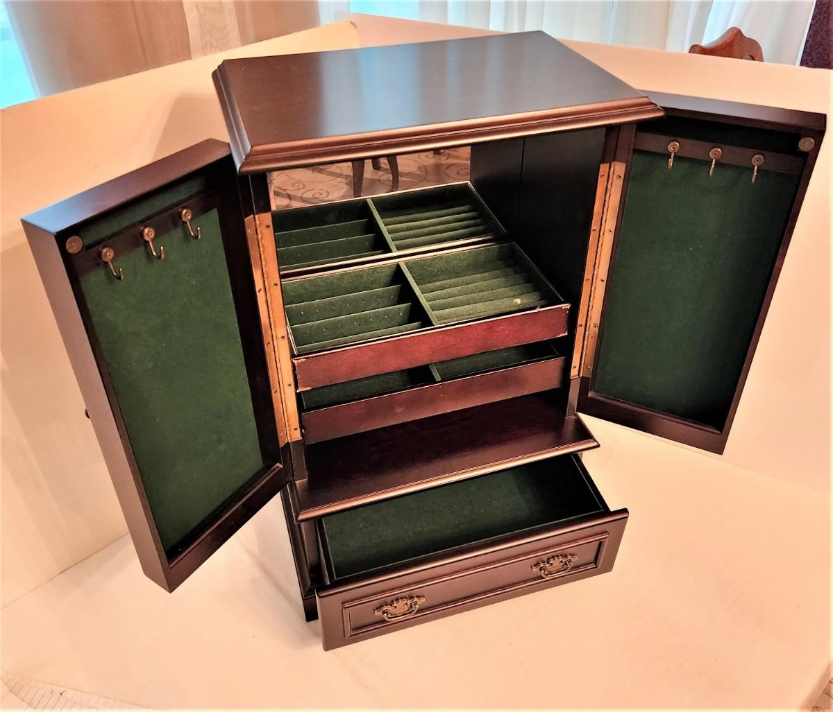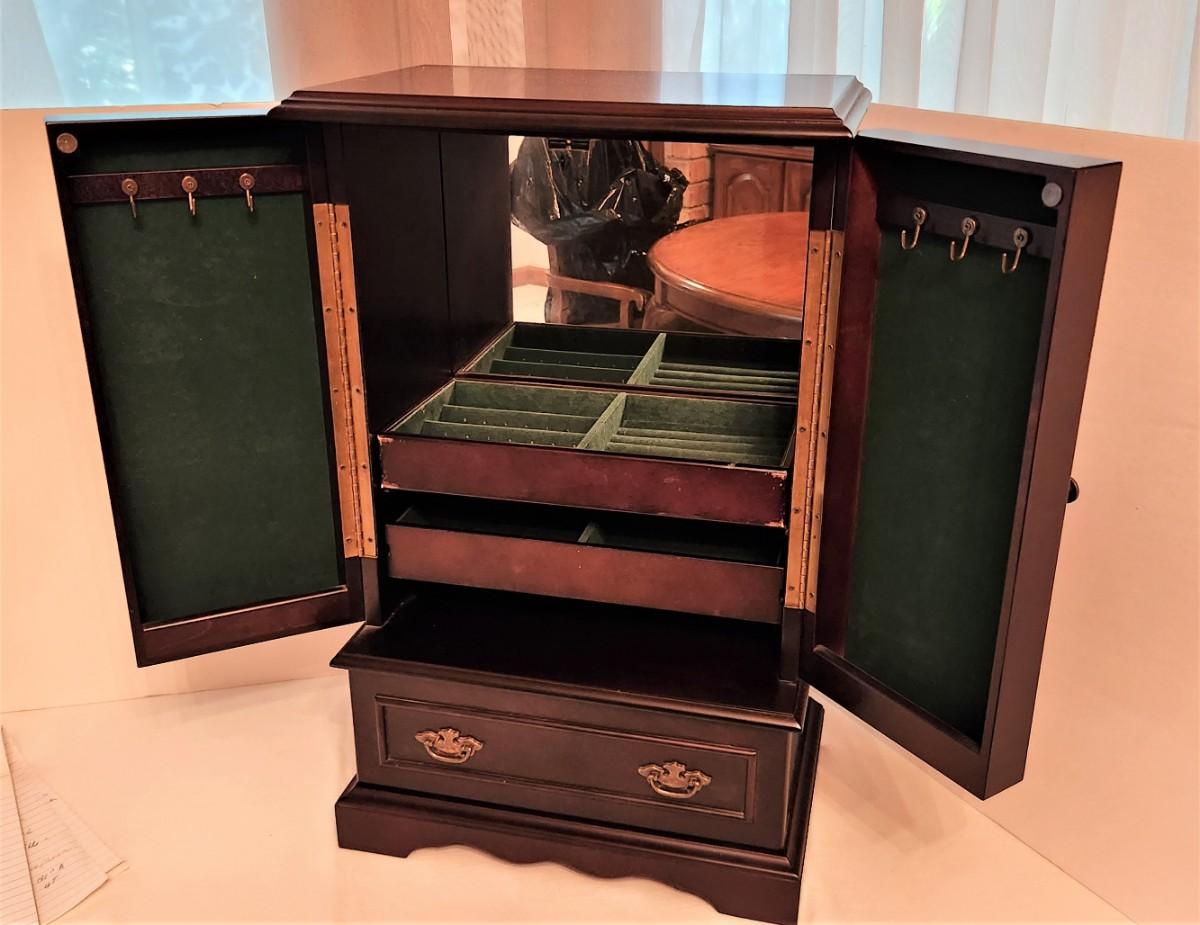 Bombay company jewelry box - drawer, mirrored back, two pull out sections. Note: top pull out brace is broken at the back - does not affect the drawer function and the piece is there if you want to glue it back. Invisible flaw - fix or not, it still works ok. 13.5" across, 21" tall, 8.5" deep.