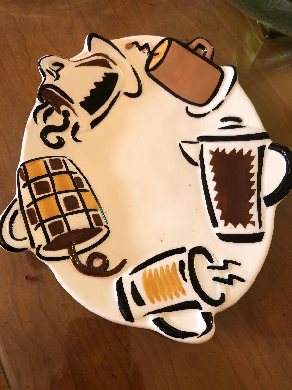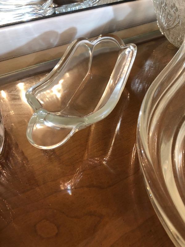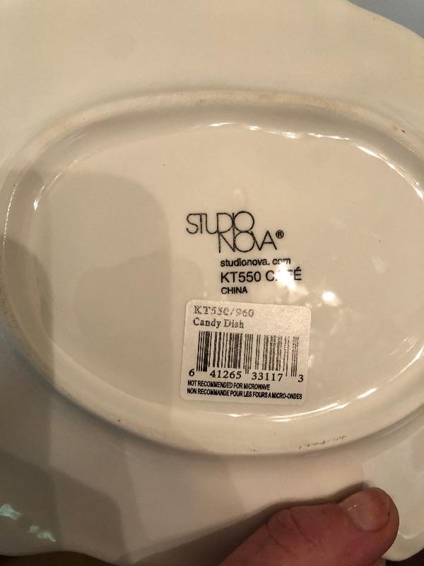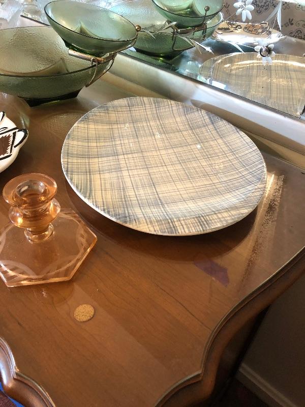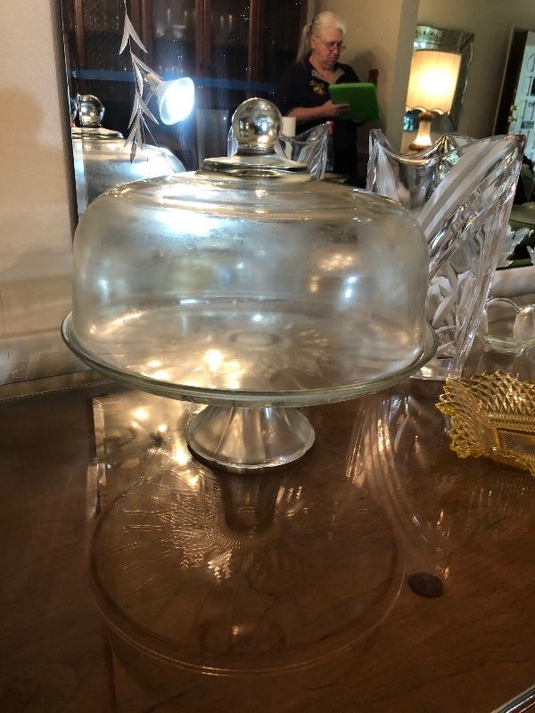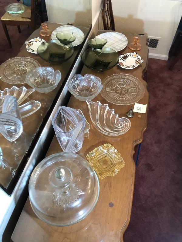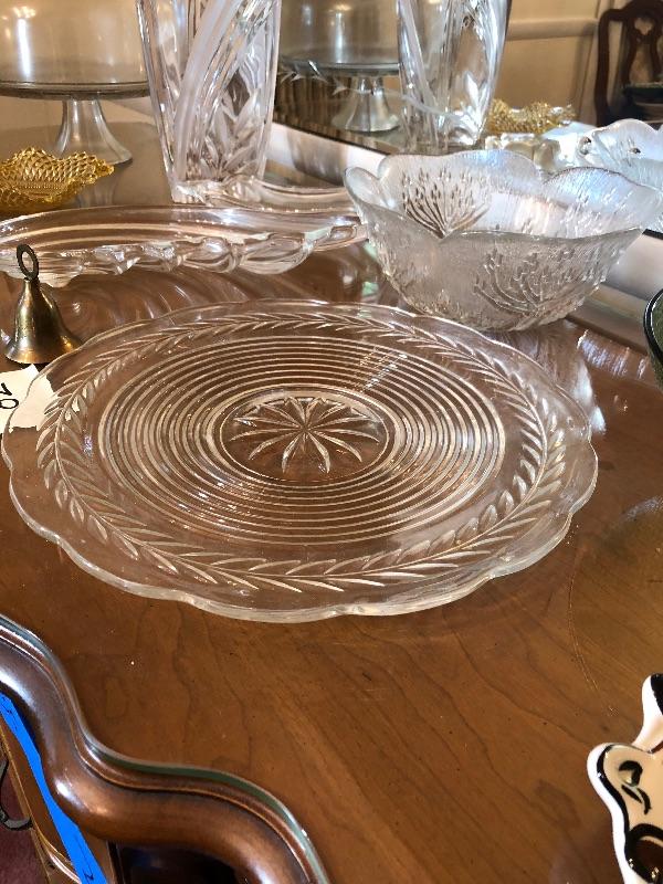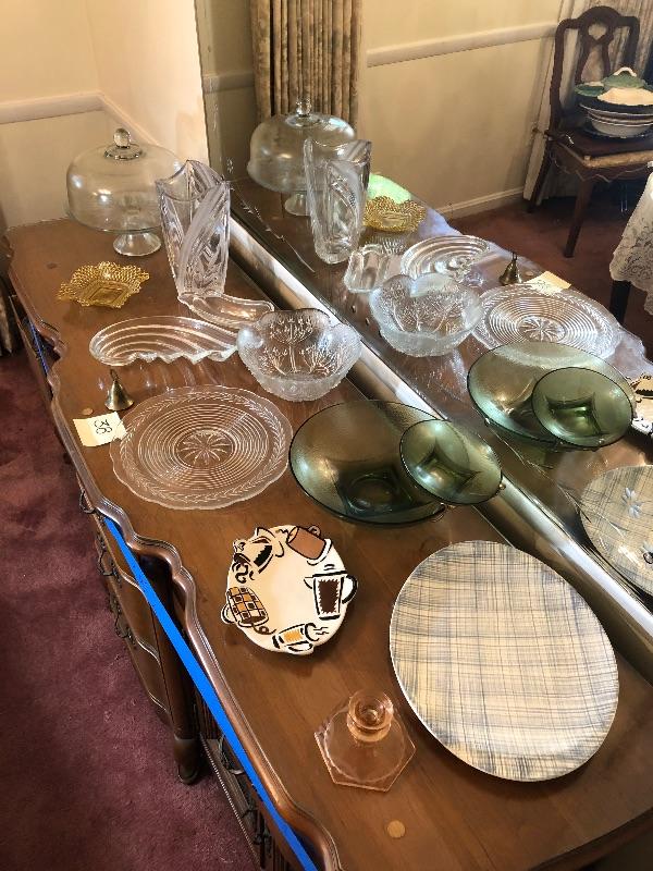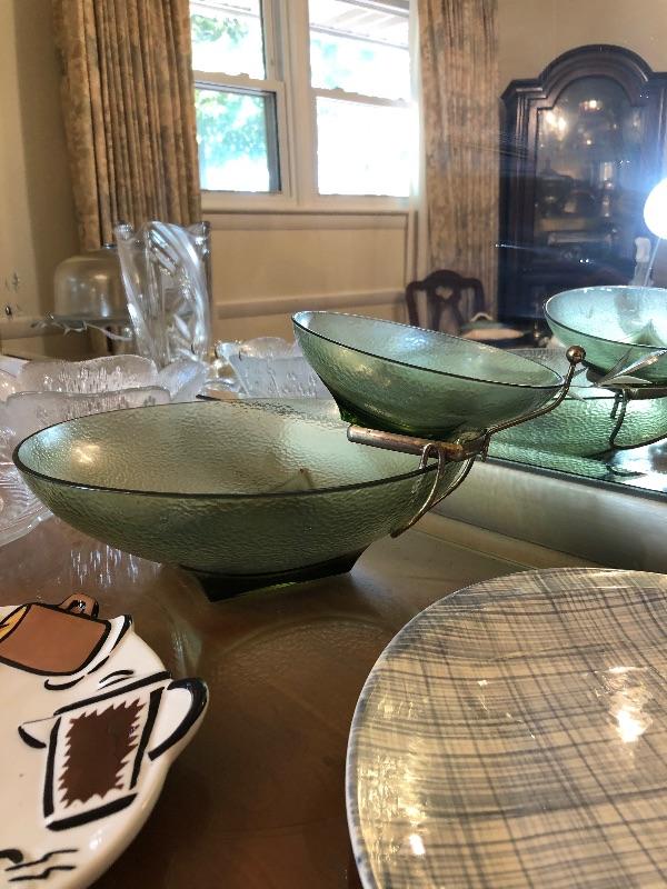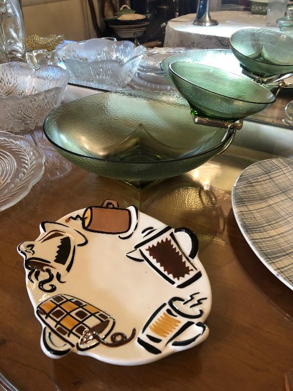 Brass Bell, Cake Plate, Vase, Candy Dish, Lg Candy Dish, Vintage Green Glass Chip & Dip Bowl, Glass Platter, Sm China candy dish "Cafe" by Studio Nova, Blue & White Platter