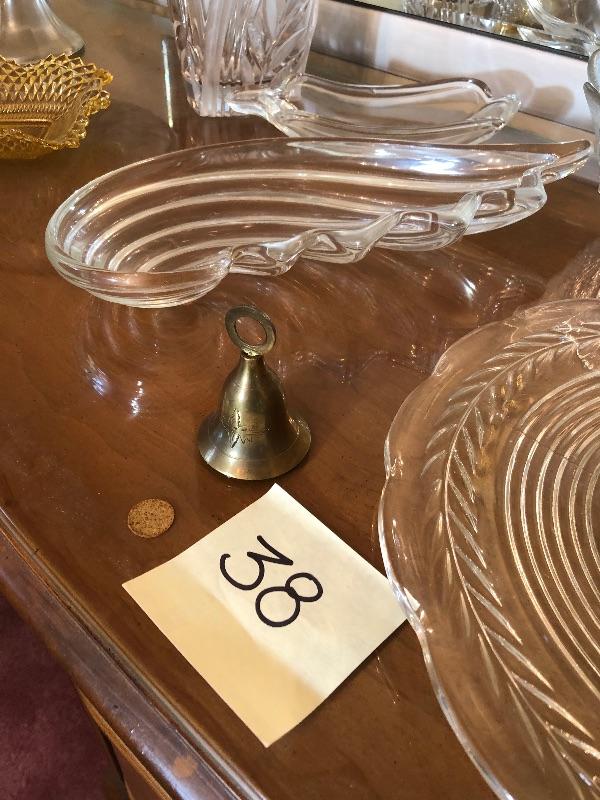 LOT 38 - Brass Bell, Vintage Green Glass Chip & Dip Bowl, Cake Plate, Vase, Candy Dish, Lg Candy Dish, Glass Platter, Sm Candy Dish "Cafe" (China by Studio Nova), Blue & White Platter