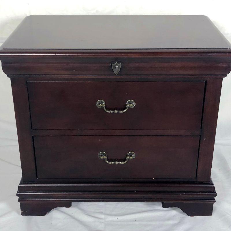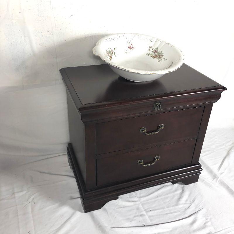 Cherry nightstand with 2 drawers and key accent. Dovetailed, 26"w x 16" deep x 23 high. Roswell vintage wash bowl 16" diameter