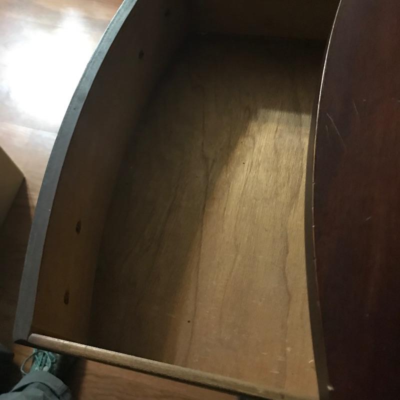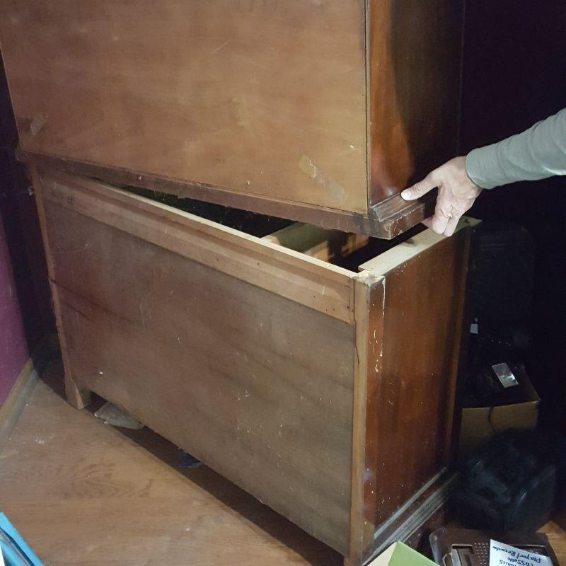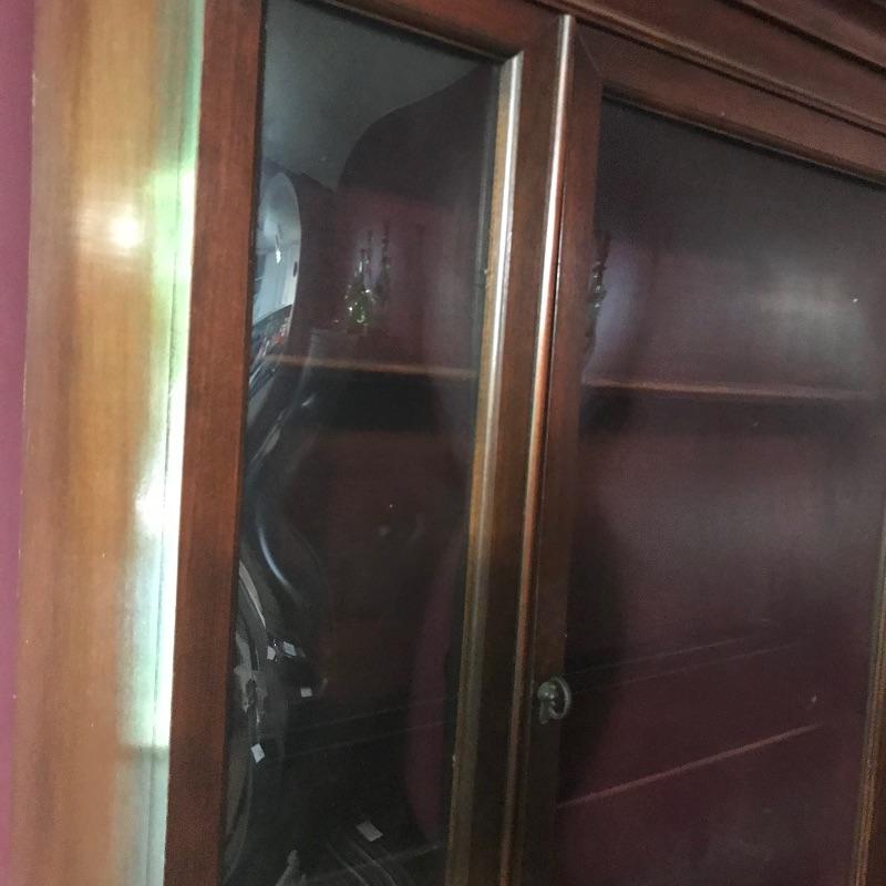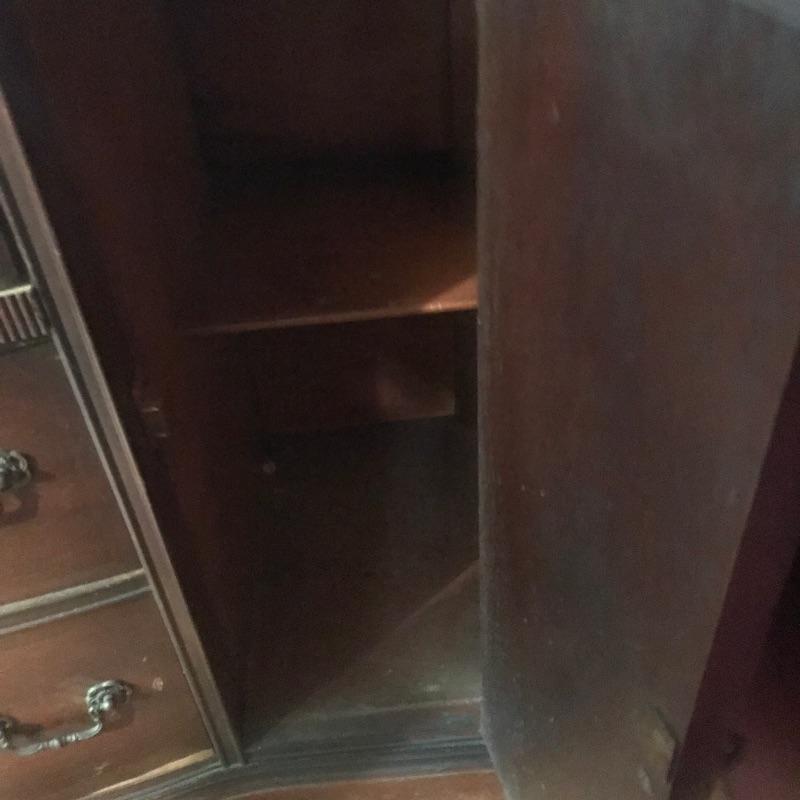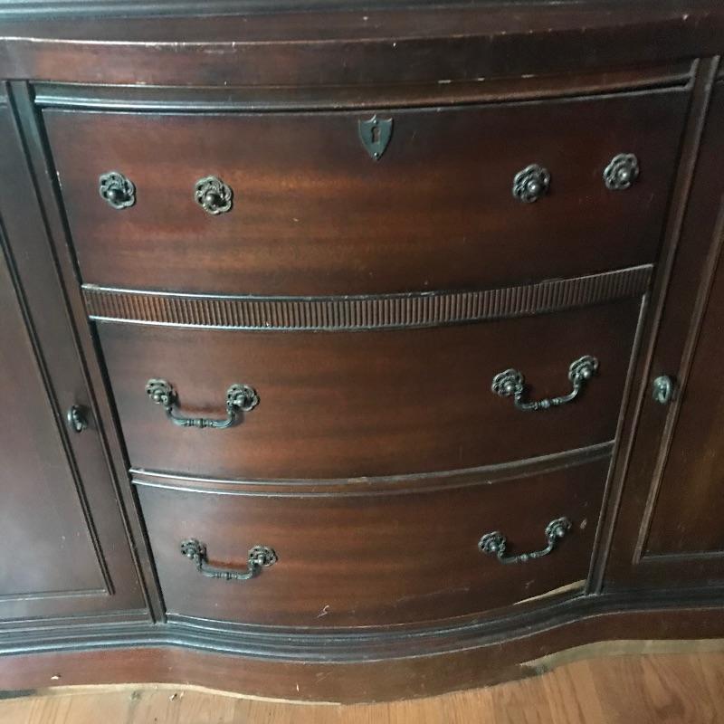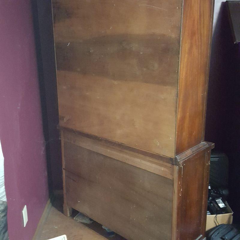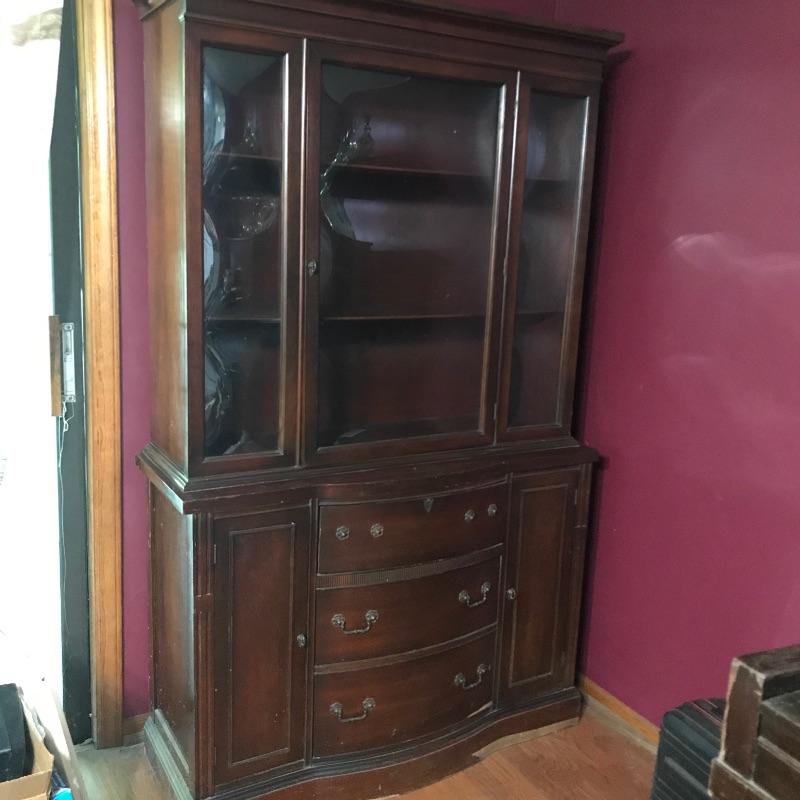 China cabinet with glass front. Top detaches from bottom, making for easier moving and transport. Missing two handles on top drawer. Glass is slightly warped. Some chipped wood veneer at the bottom. See pics. Approx. 70” tall. Top is approx. 41” x 14” x 40”h. Bottom is approx. 44” x 16” x 30”. Local pickup only. Please bring help for moving and loading.