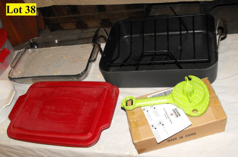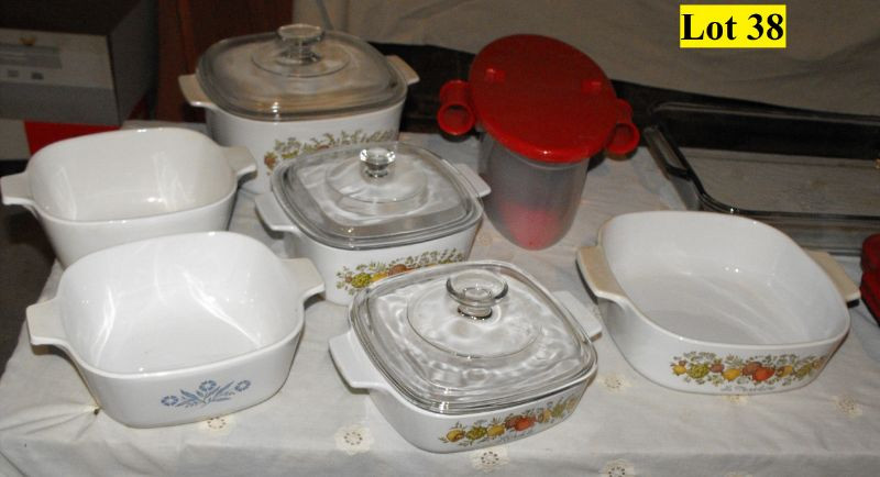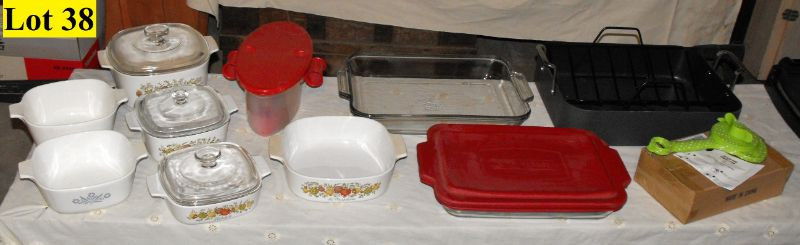 “Cornflower Blue” and “Spice of Life” Corning Ware Casserole Dishes. Anchor w/ Lid and Pyrex Glass Lasagna Pans, Teflon Roasting Pan and New Kuhn Rikon Polka Dot Jar Opener. All in New or Like New Condition