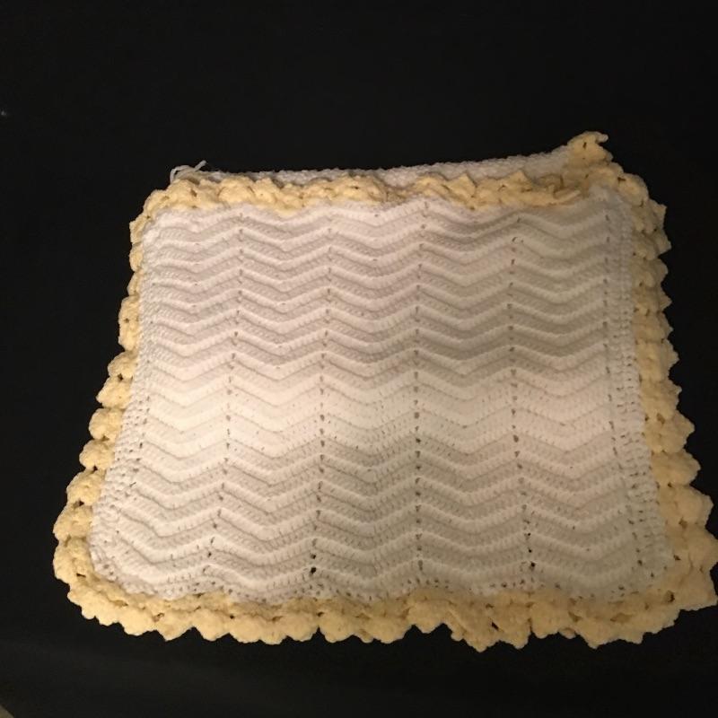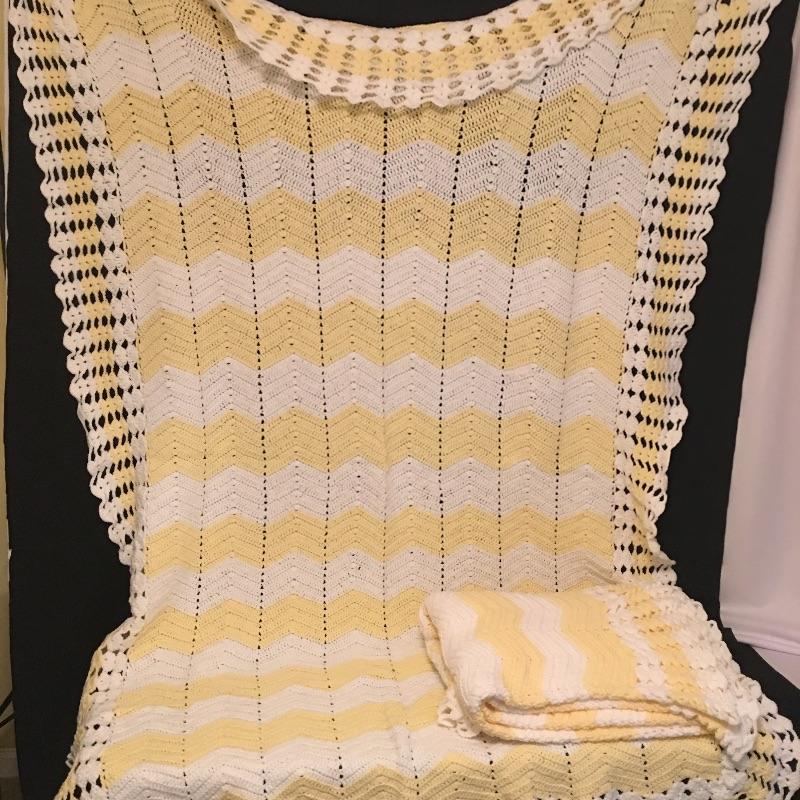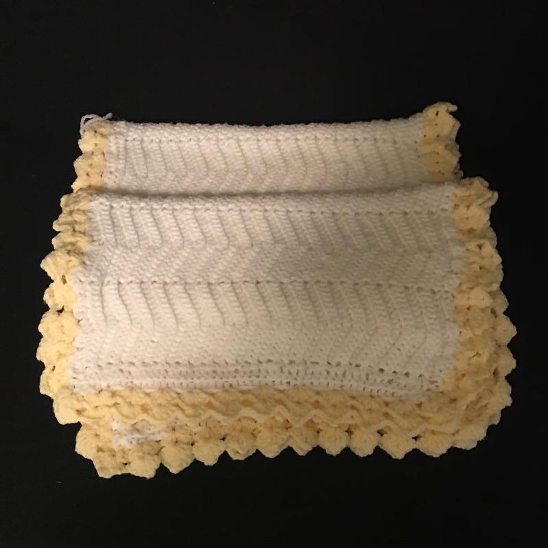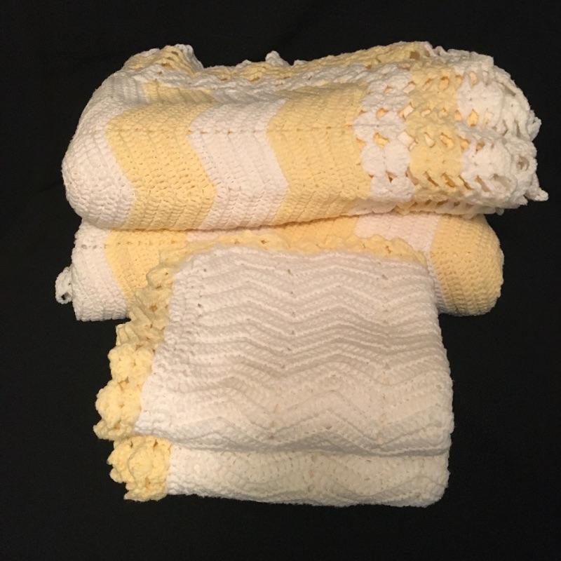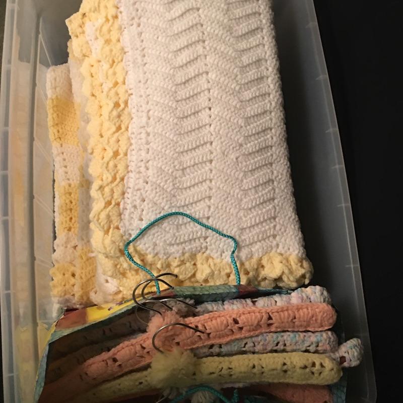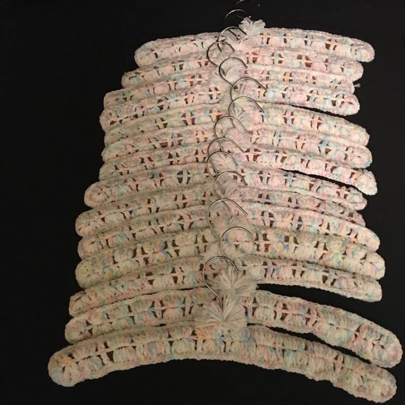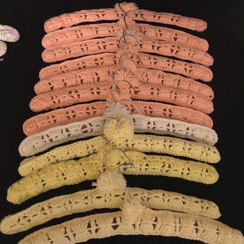 Pair of crochet twin coverlets, two matching shams and twenty six wooden hangers with crochet covers in a variety of colors. Coverlets are a gentle yellow and cream color.