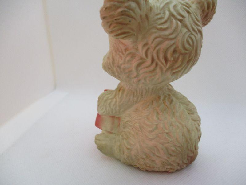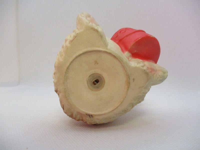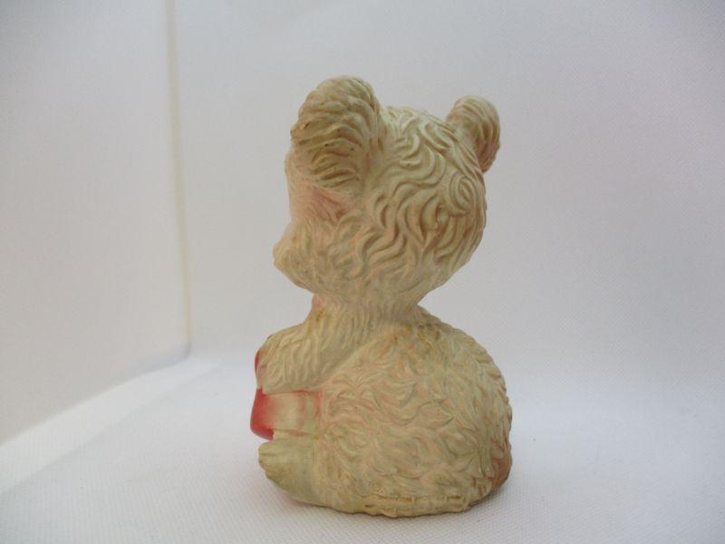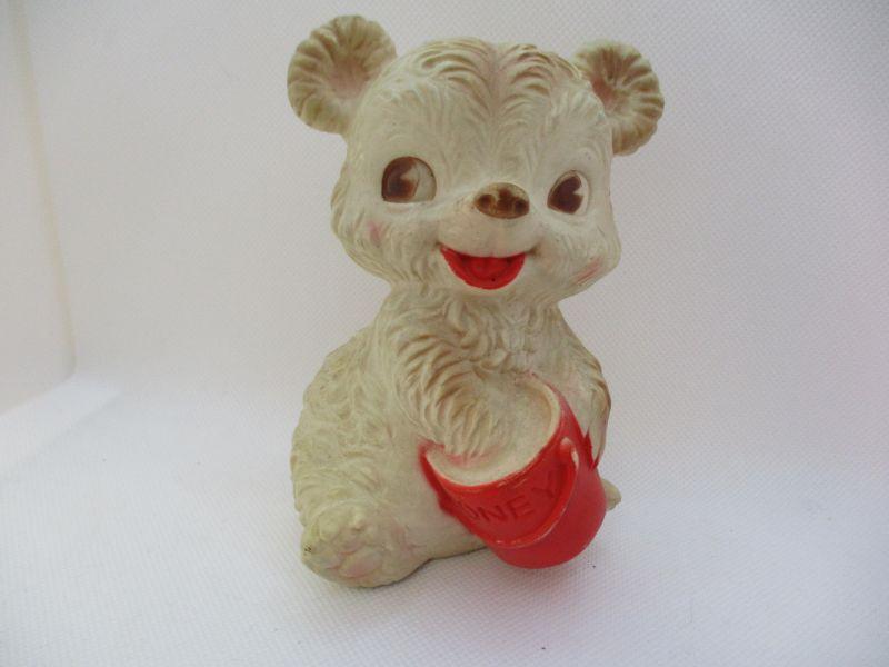 Super cute bear who just wants a little honey (make your own comments). His rubber is still soft and he still squeaks when squeezed. Near the bottom of his backside is embossed "The Edward Mobley Co Mfg by Arrow Rubber & Plastic He is 5.25" tall. There isn't a year that I could find.