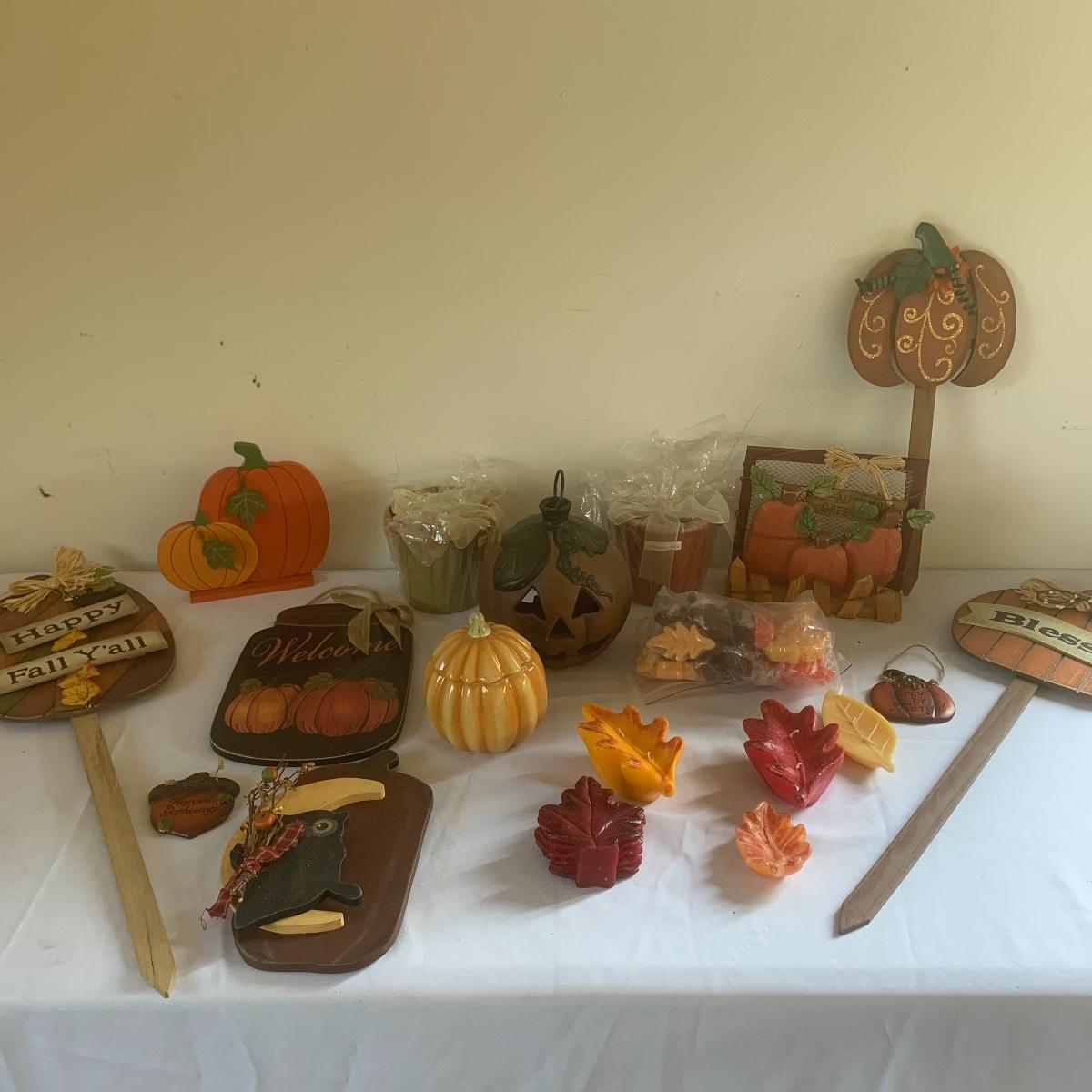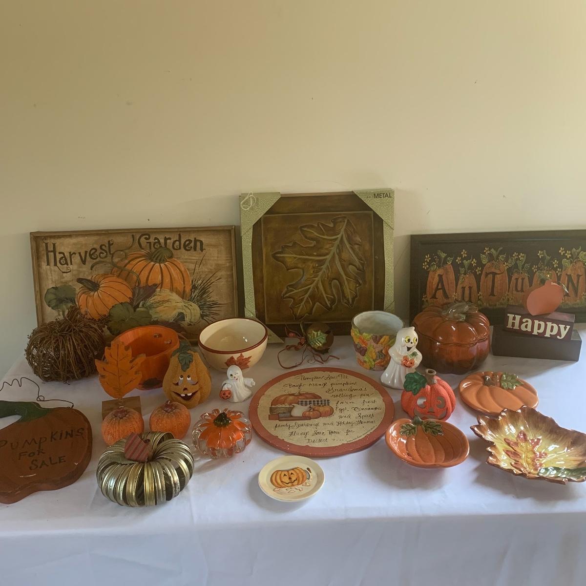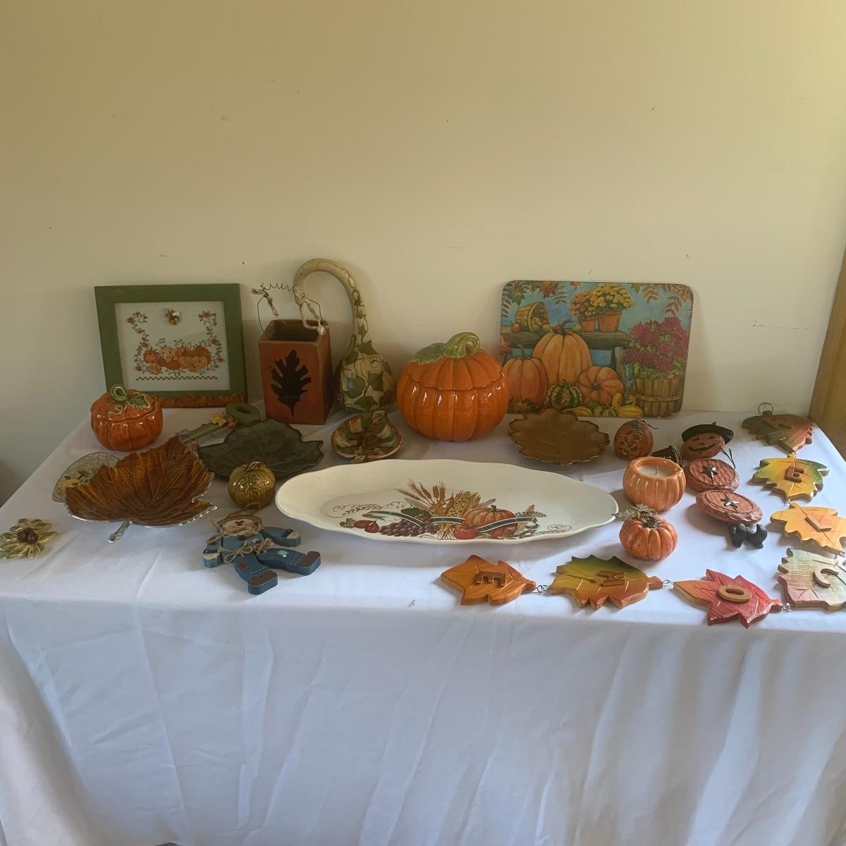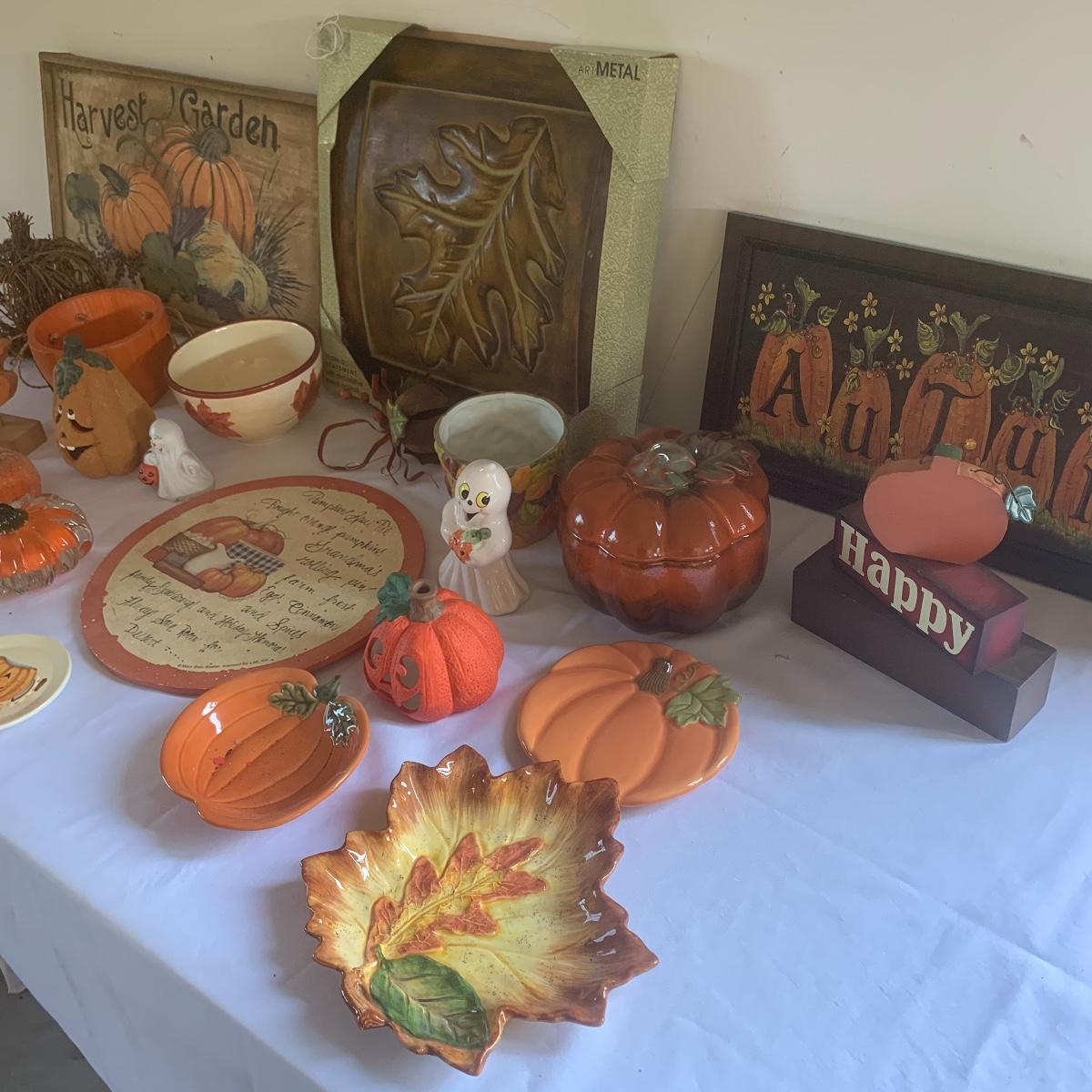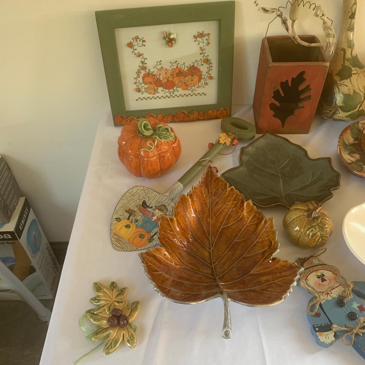 It’s Fall Y’all!! This group features all kinds of fall decorations. Included are ceramic pumpkins, wooded pumpkins, fall themed plates and trays, wall hanging, decorative yard art, leaf shaped candles, several ceramic leaf shaped bowls, and much more. If you love to celebrate the fall season, you’ve come to the right place. Local pick up only.