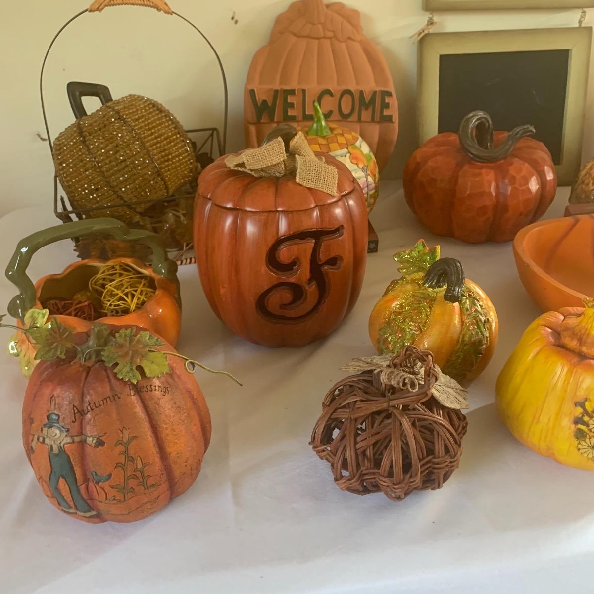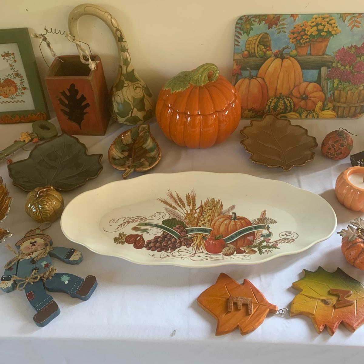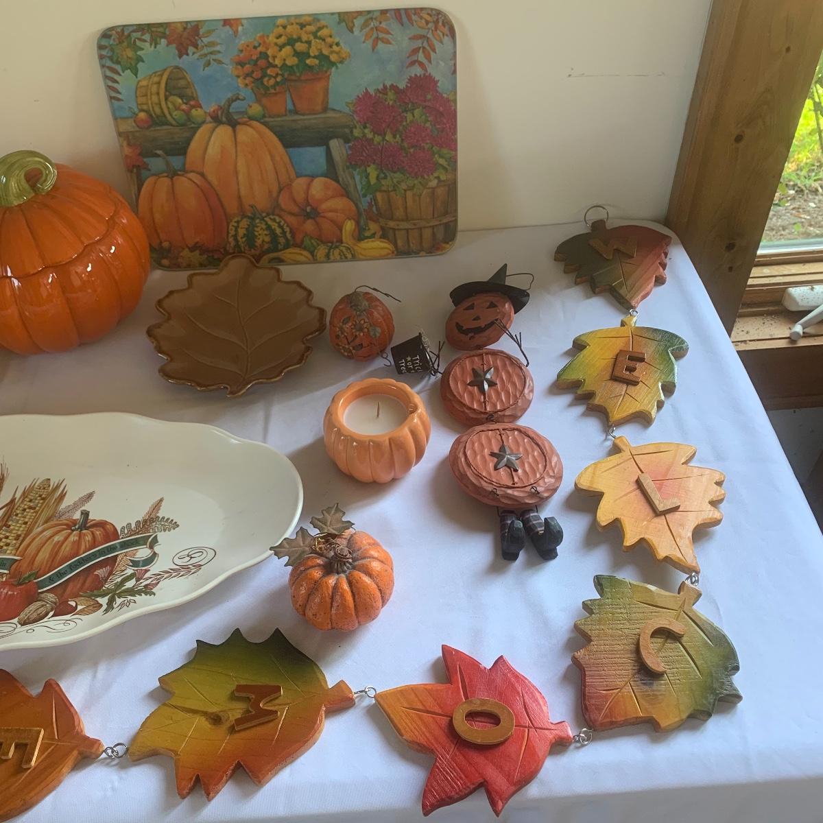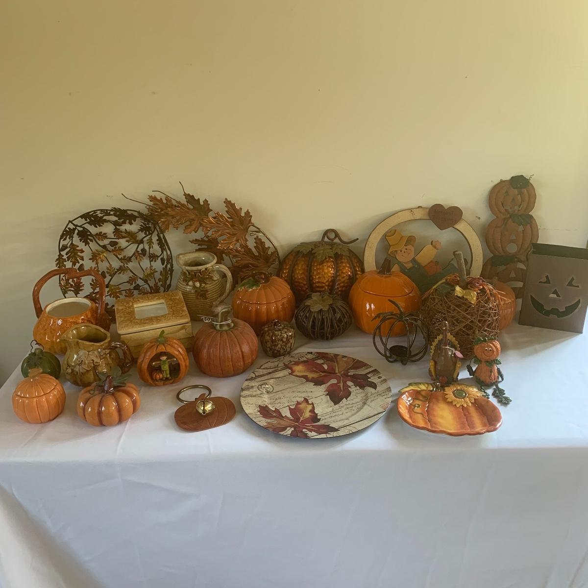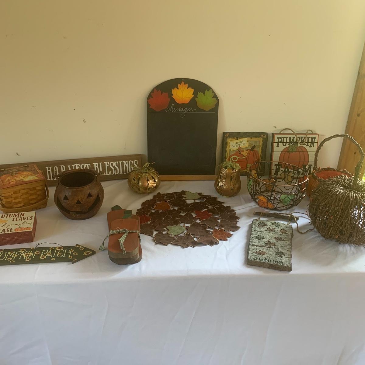It’s Fall Y’all!! This group features all kinds of fall decorations. Included are ceramic pumpkins, wooded pumpkins, fall themed plates and trays, wall hanging, decorative yard art, leaf shaped candles, several ceramic leaf shaped bowls, and much more. If you love to celebrate the fall season, you’ve come to the right place. Local pick up only.