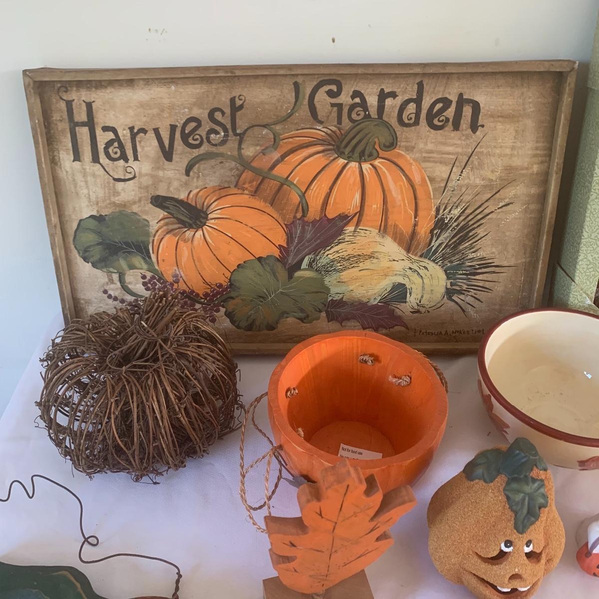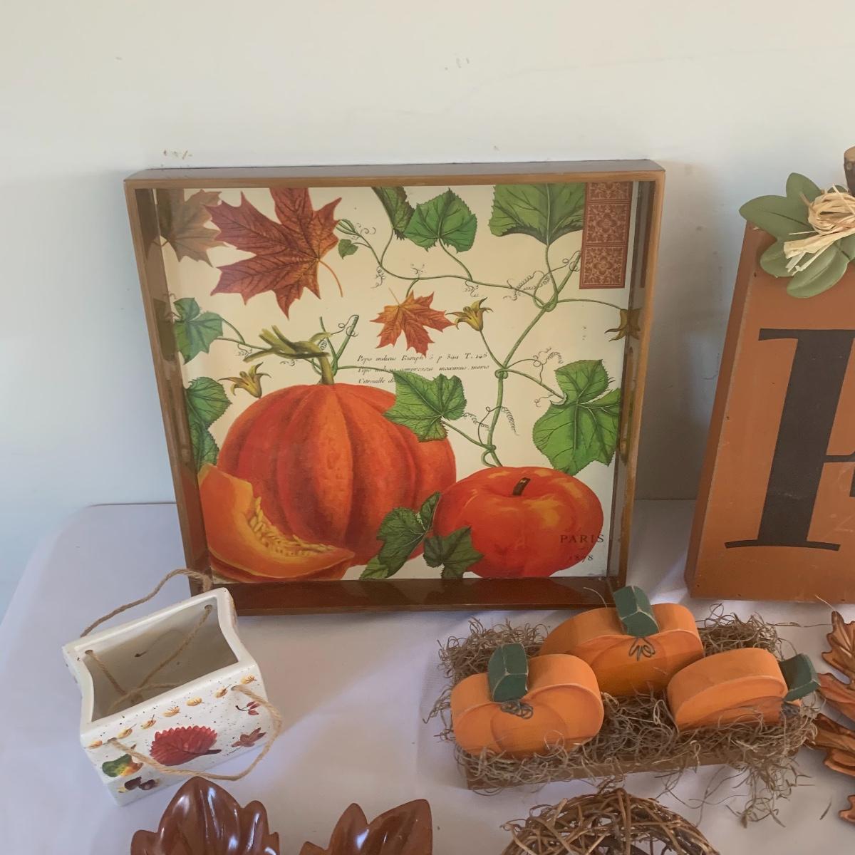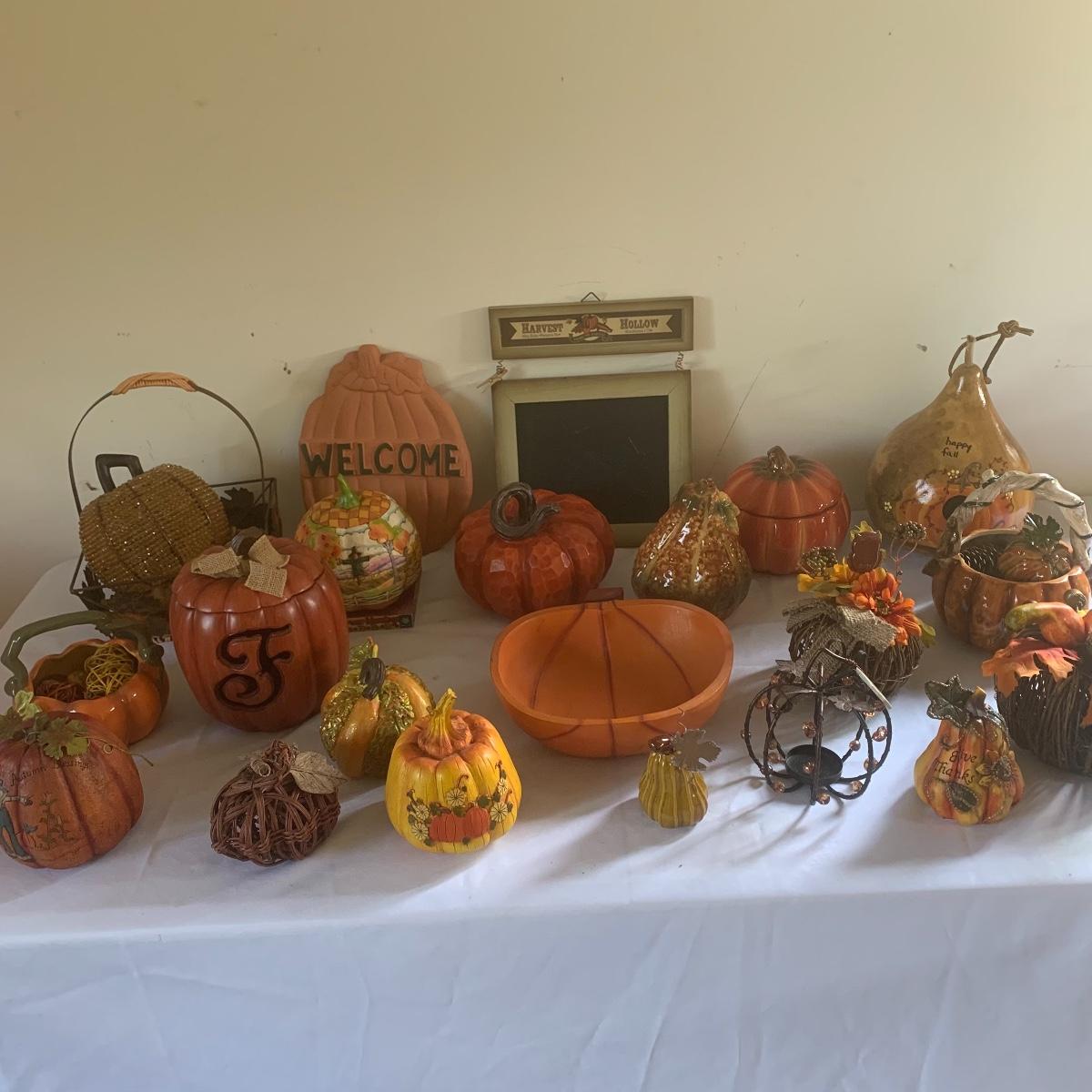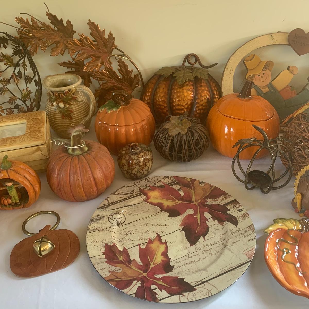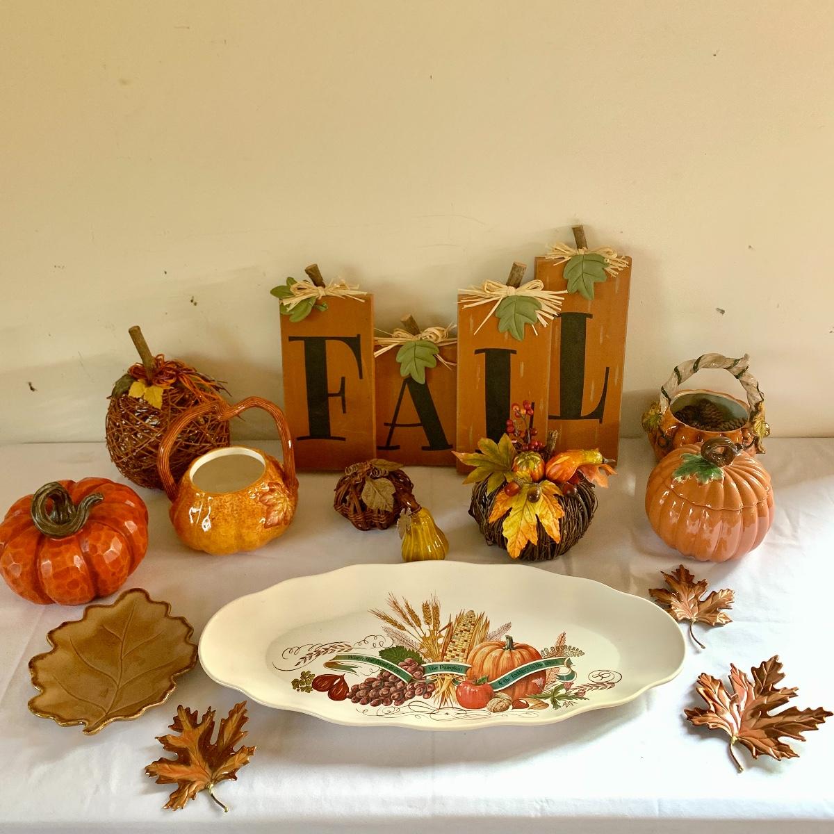 It’s Fall Y’all!! This group features all kinds of fall decorations. Included are ceramic pumpkins, wooded pumpkins, fall themed plates and trays, wall hanging, decorative yard art, leaf shaped candles, several ceramic leaf shaped bowls, and much more. If you love to celebrate the fall season, you’ve come to the right place. Local pick up only.
