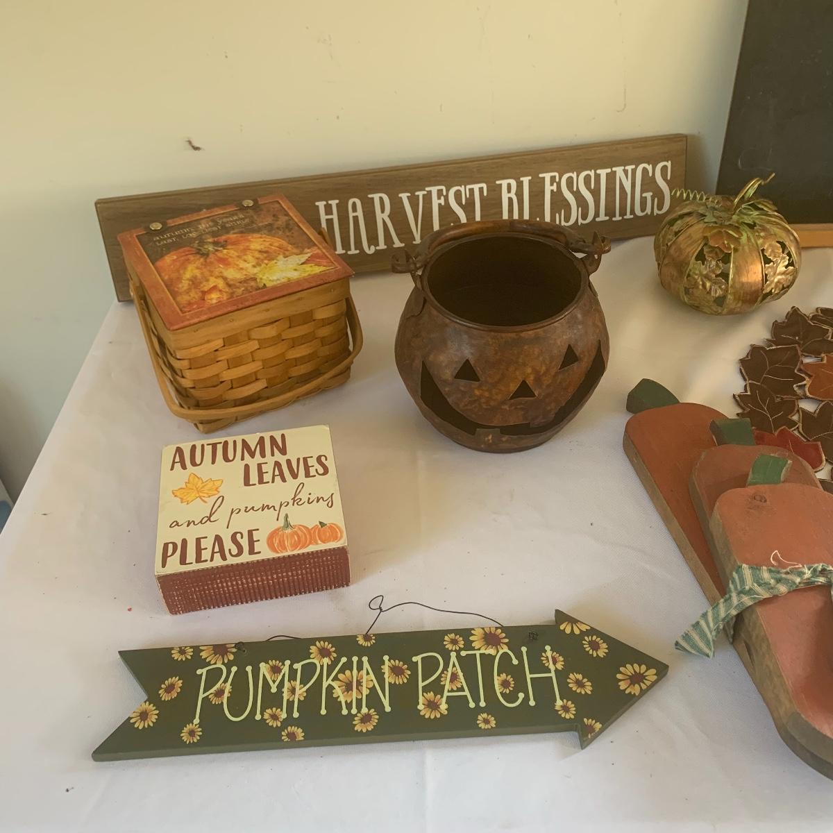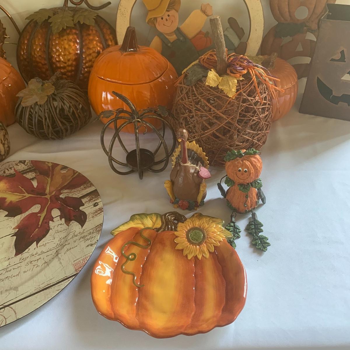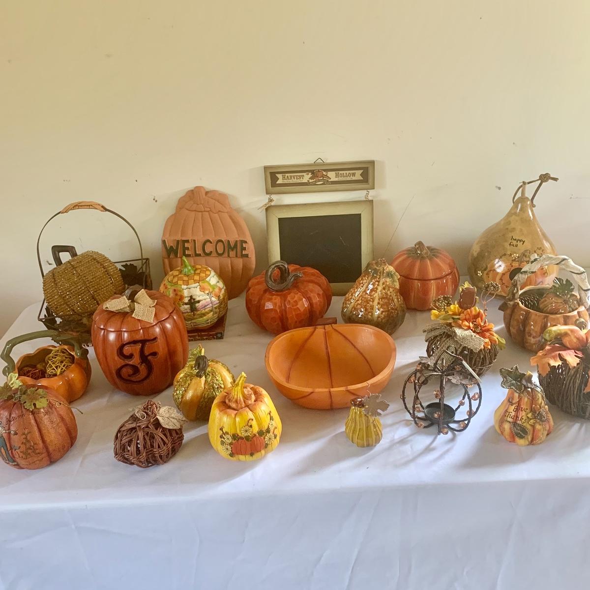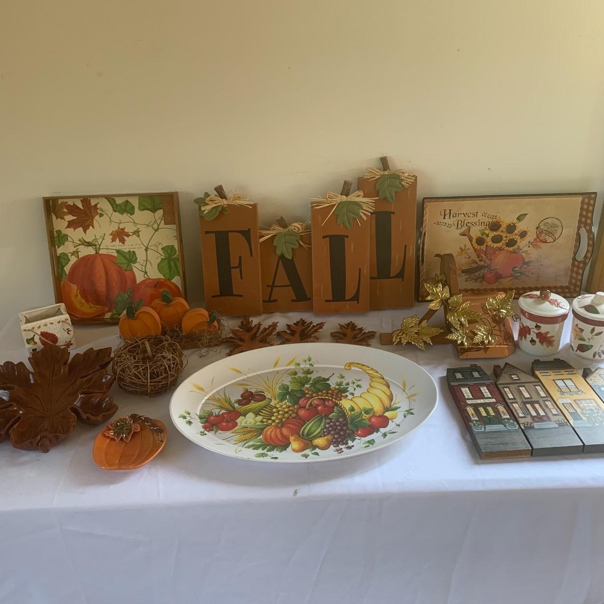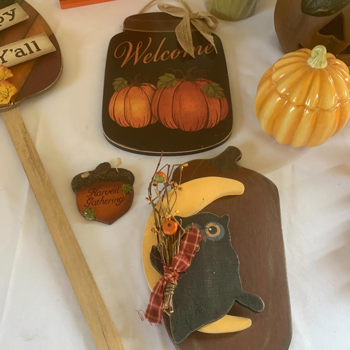 It’s Fall Y’all!! This group features all kinds of fall decorations. Included are ceramic pumpkins, wooded pumpkins, fall themed plates and trays, wall hanging, decorative yard art, leaf shaped candles, several ceramic leaf shaped bowls, and much more. If you love to celebrate the fall season, you’ve come to the right place. Local pick up only.