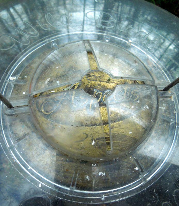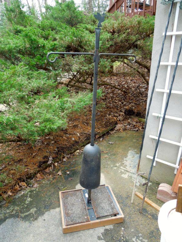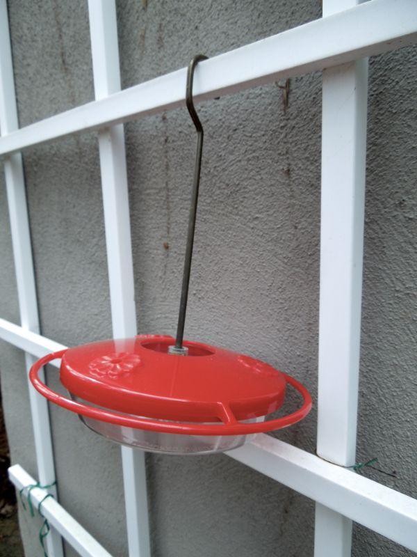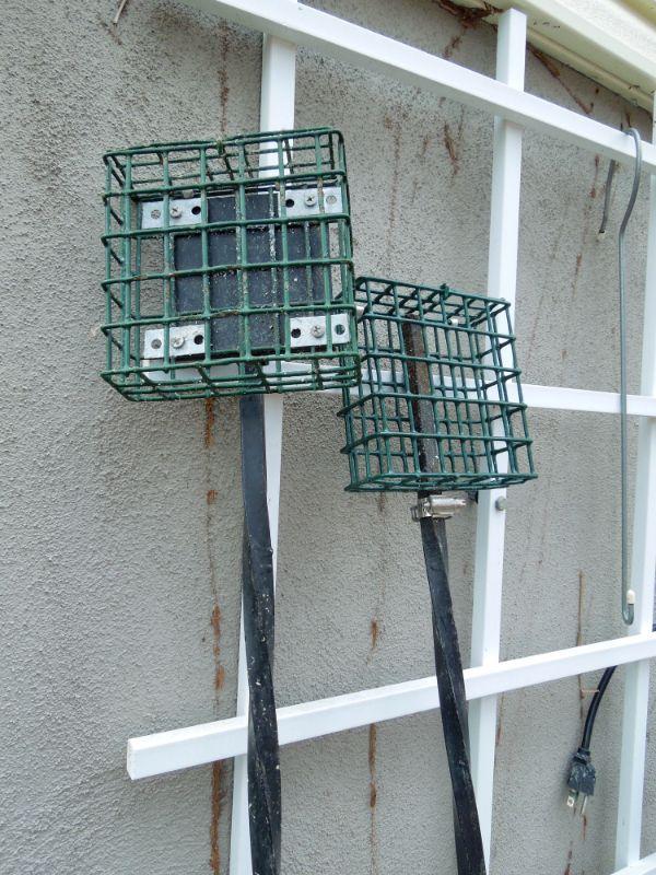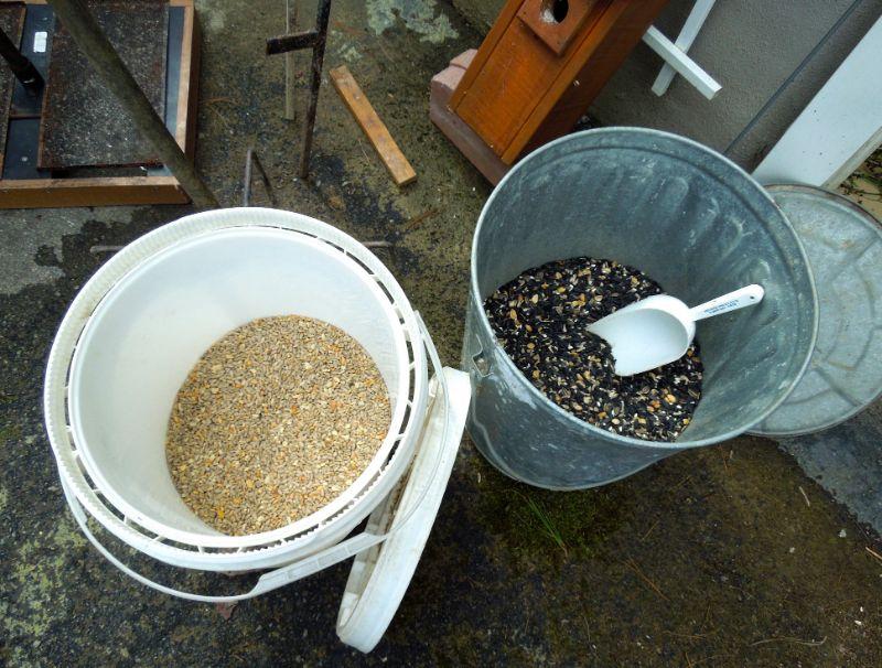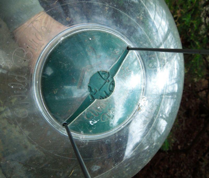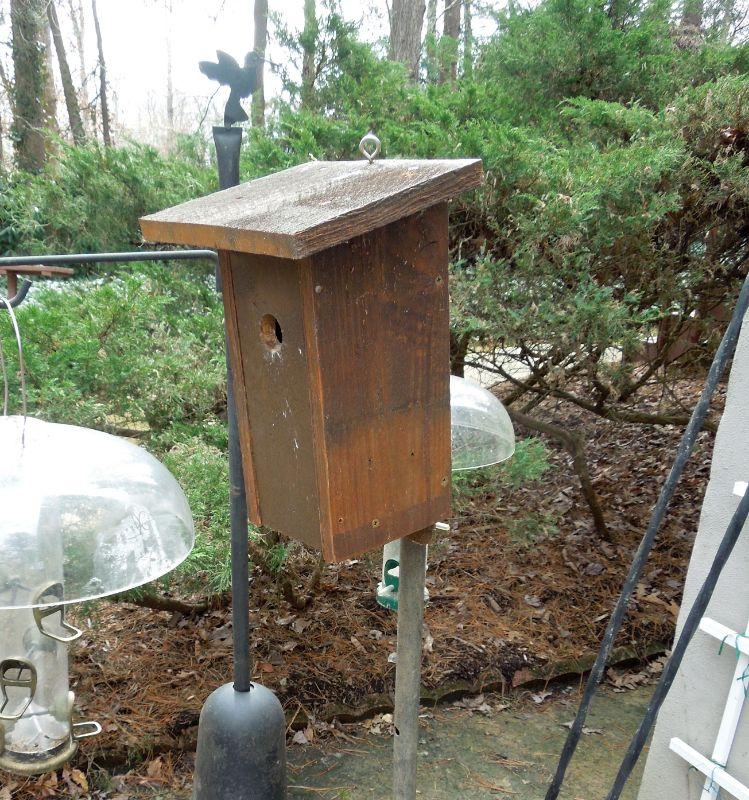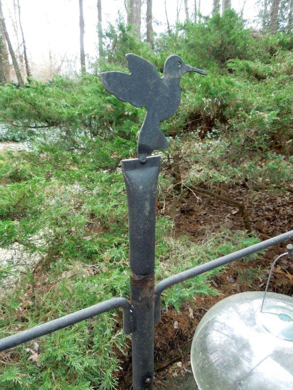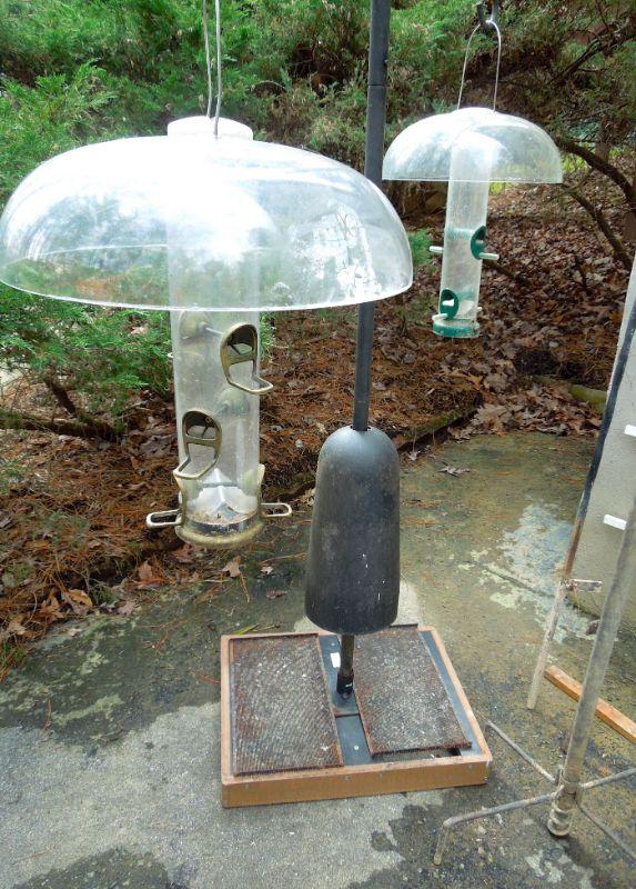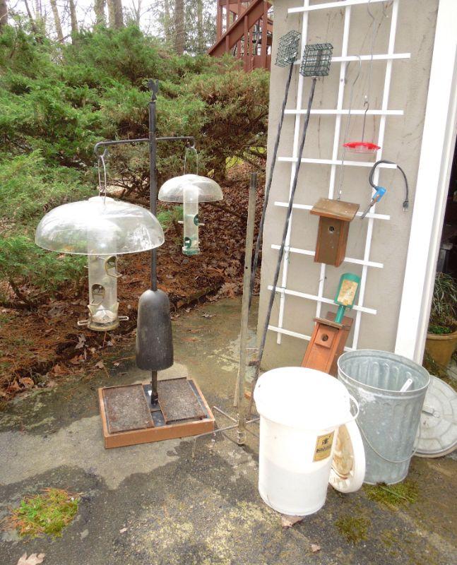 A Wild Birds Unlimited double Standard squirrel proof mounted black metal pole with two hooks for holding bird feeders and base and hummingbird finial; wild birds Unlimited "Aspects" brass and plastic feeder with 6 perches; a second Wild Birds Unlimited 4 perch plastic feeder; a metal stand with wood bird house; a wood bird house with door; two buckets of Wild Birds Unlimited bird seed; a plastic hummingbird feeder; a plug in bird bath warmer; 2 iron poles with mounted suet baskets. Bird feeders have no cracks or damage or cracks other than exposure to weather and scratches in plastic.