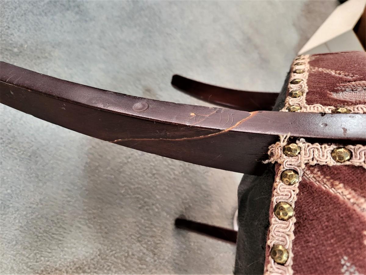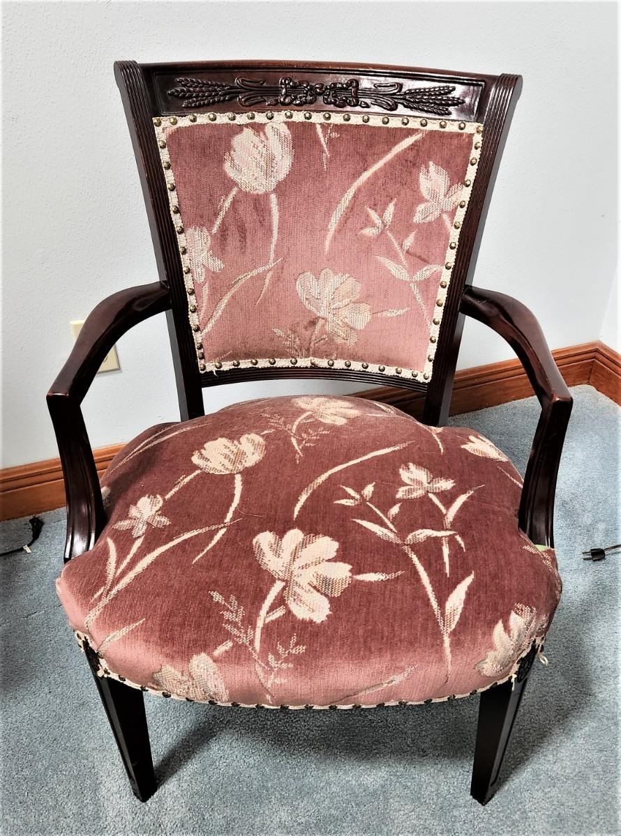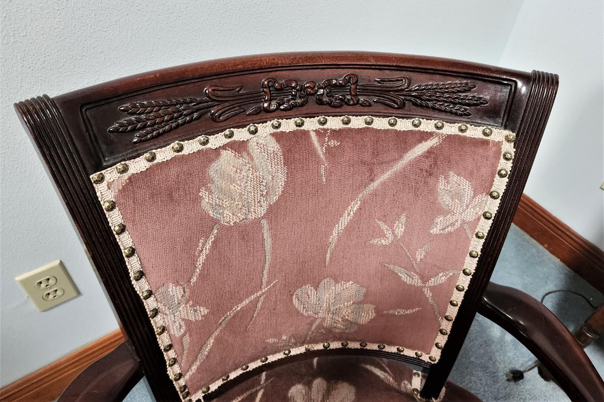 This Handsome antique armchair is clean and comfy. Carved Wheat design across back. Plum fabric upholstery. We noted an old repair to the back right leg (see photo). 33" tall, 23" wide. This is a good looking chair.