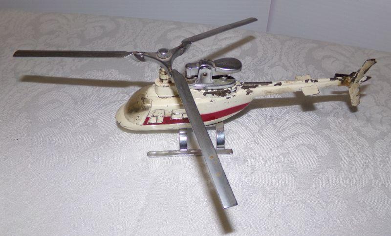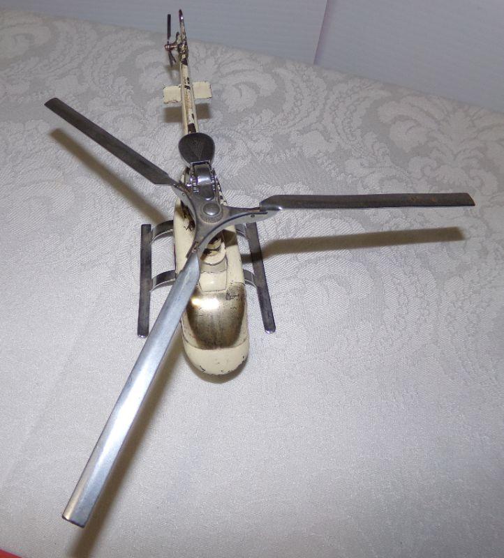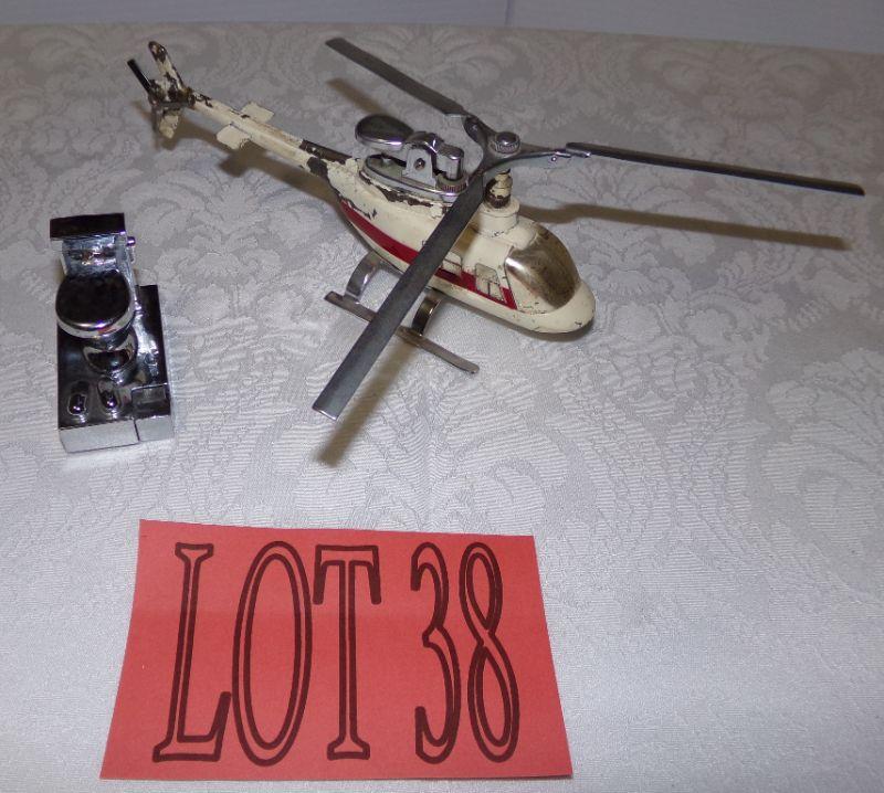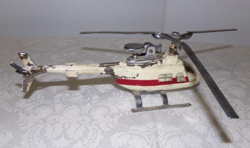 HELICOPTER TABLE LIGHTER HAS LOSS OF PAINT AND PROBABLY NEEDS FLUID AND FLINT IN ORDER TO WORK