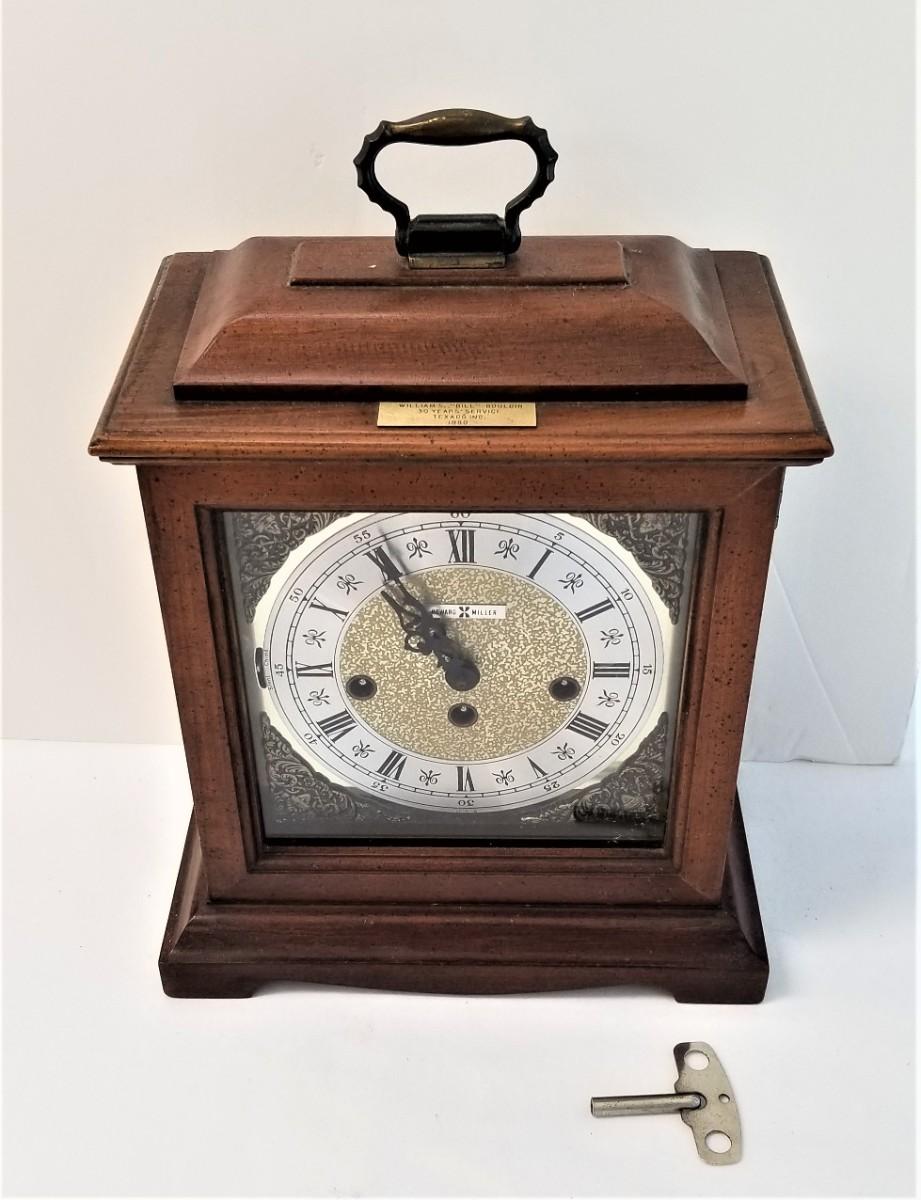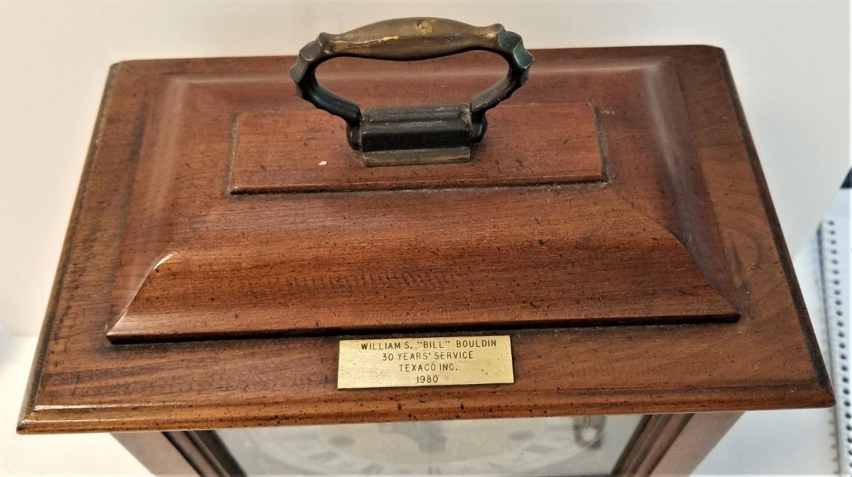 Quality Howard Miller Mantle/table clock - has key - good working condition. Strikes the hour, quarter hour, half hour. 14" tall, 10" across. Has a small plaque on the top commemorating my client's 30 years of service to Texaco, dated 1980. Plaque can be popped off.