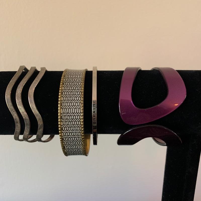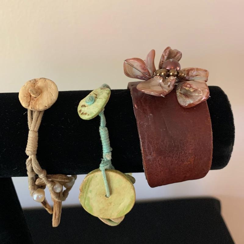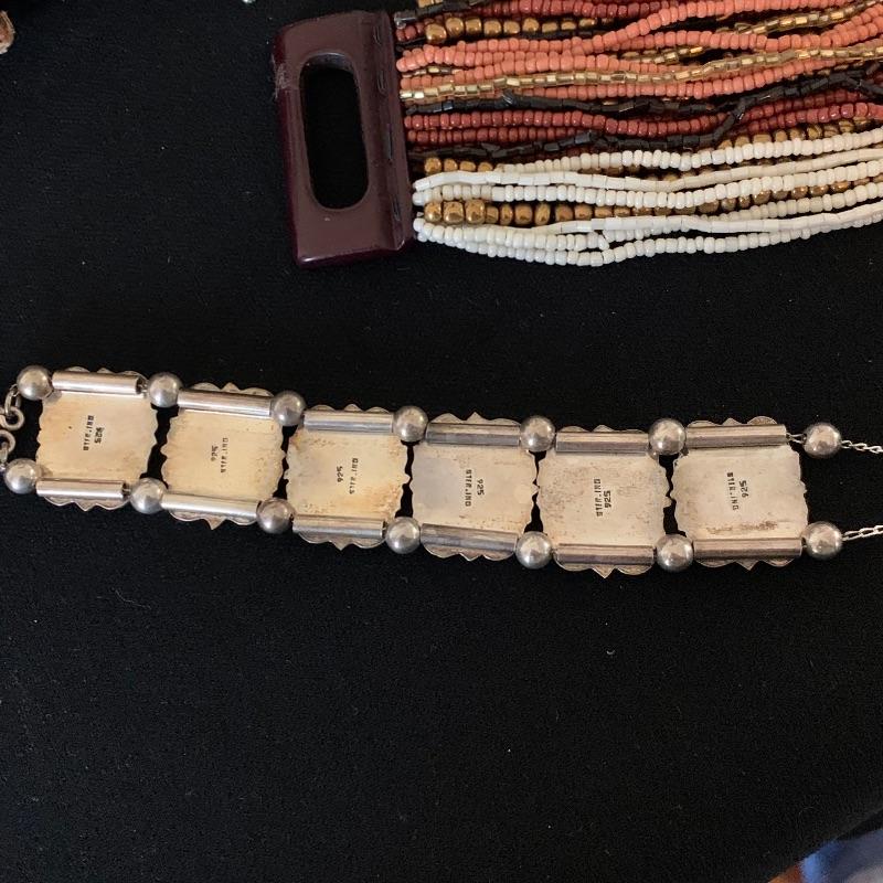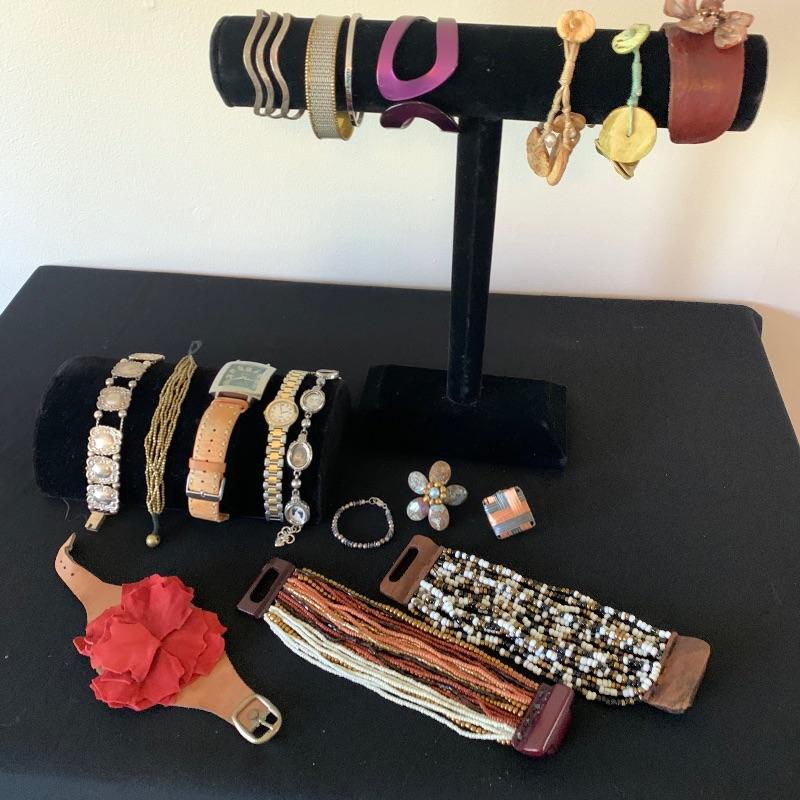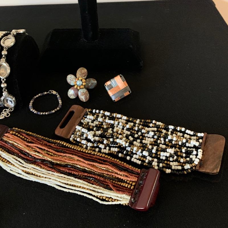 Fun lot of beaded, leather, and even a lovely 925 bracelet. One nice Brighton locket style (you can add pics) bracelet. Two watches(with one missing the strap pin.) Both need batteries. One is a Tokyobay and the other is a classic Quartz. Two big, funky adjustable rings finish the fun lot out. Shipping available.