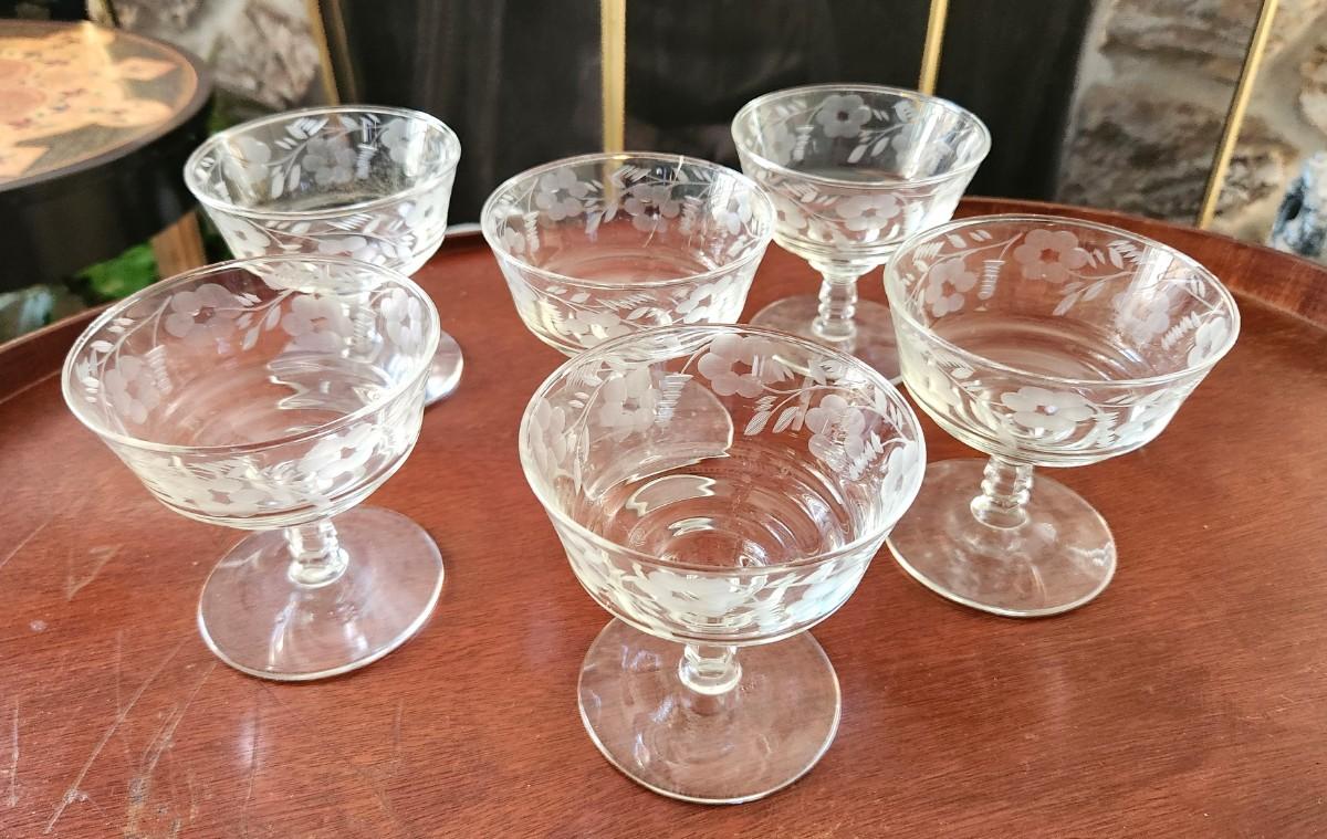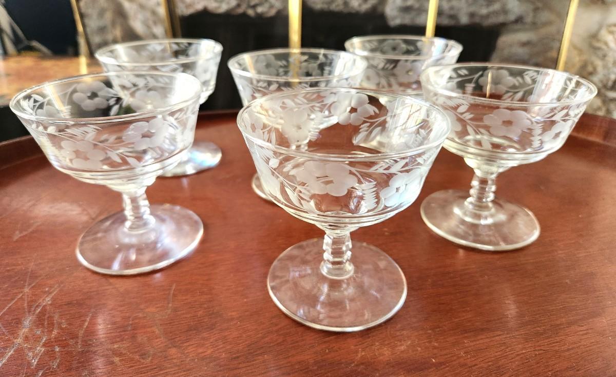 Nice lot of 6 matched vintage crystal sherbet glasses, etched floral pattern. Each about 4" tall. Note: 1 has a small "V" shaped crack. We're just throwing it in.