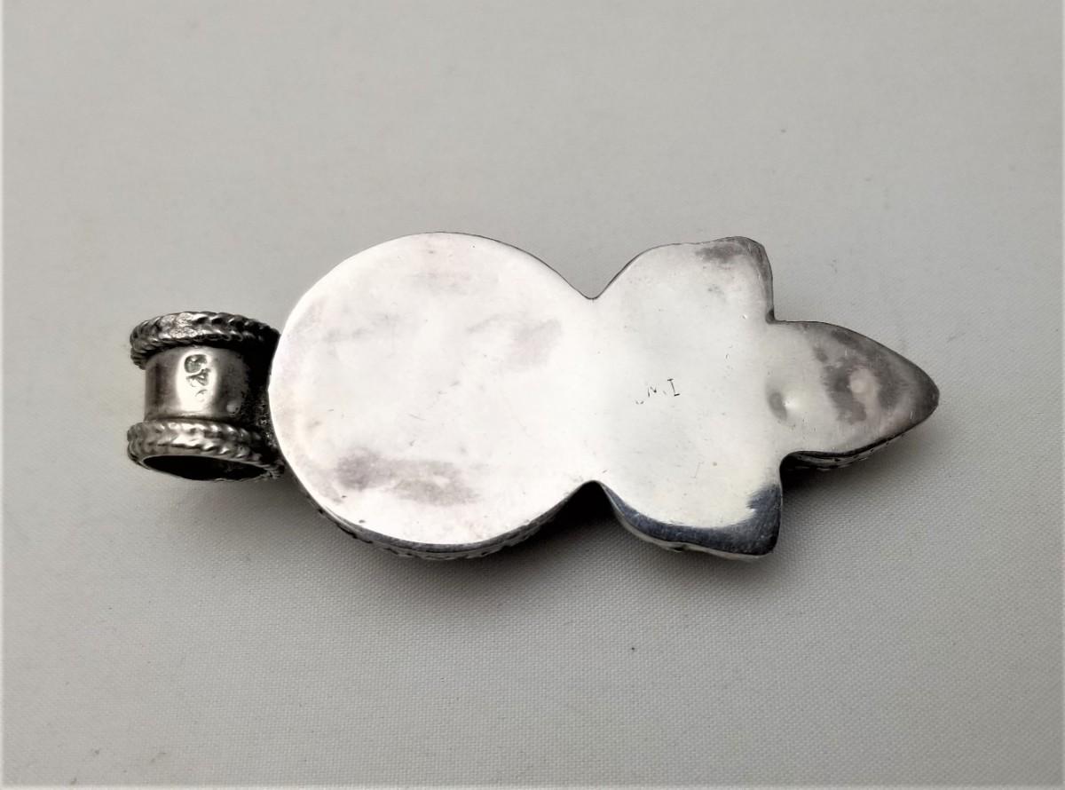 What a beauty! Definitely a signature piece - vintage Artisan Sterling Silver (marked) pendant set with Southwest US Turquoise. A substantial piece - measures 2 inches long - nice large bail - use on a thick silver cable chain or leather lariet. Excellent condition. Probably one of a kind. In my Magazine Street shop this piece would be at least $150.00.