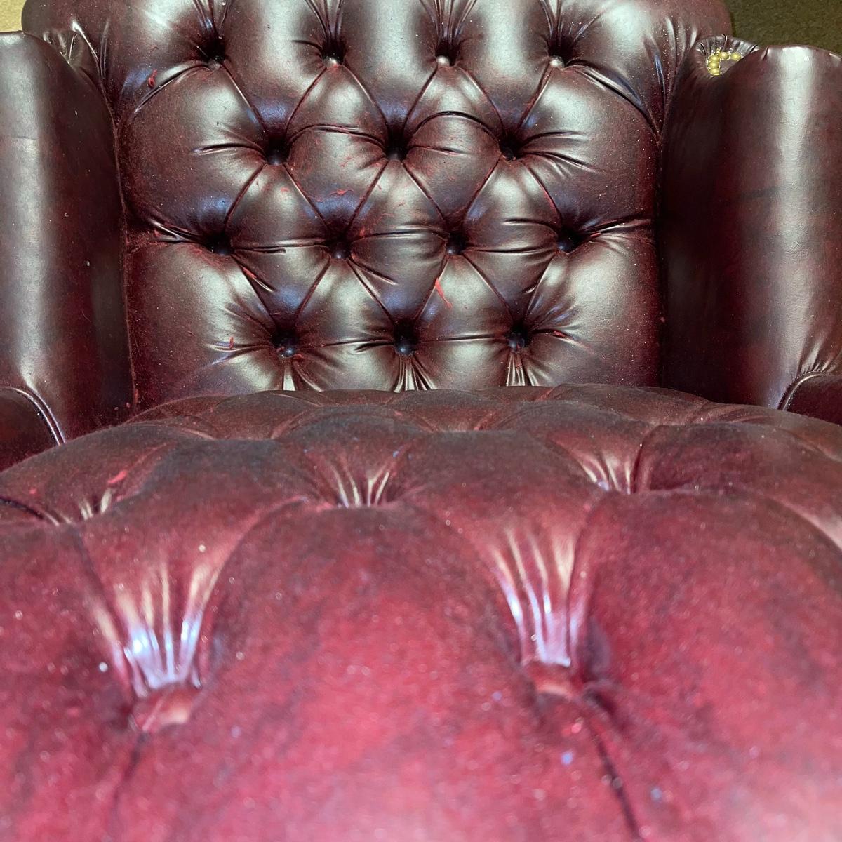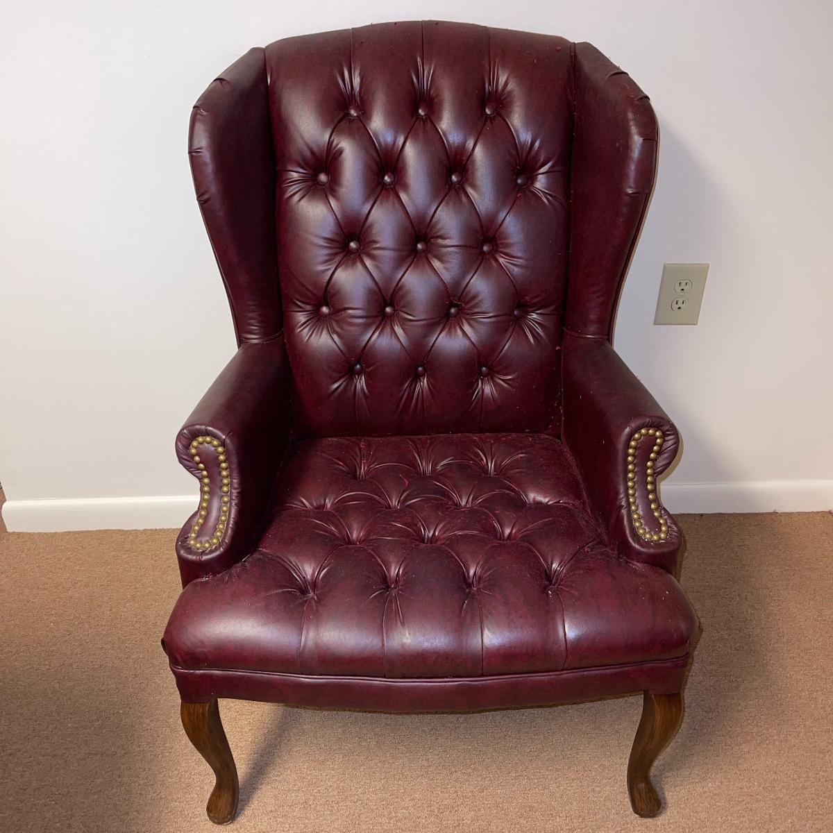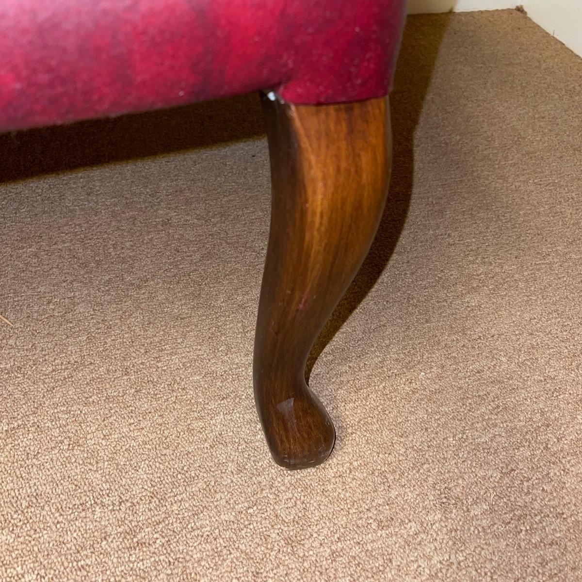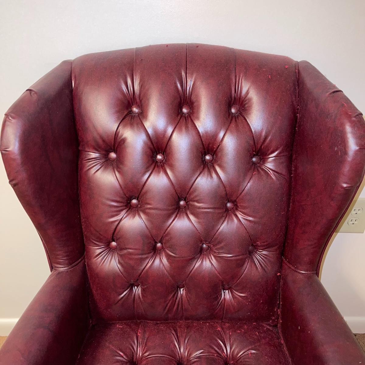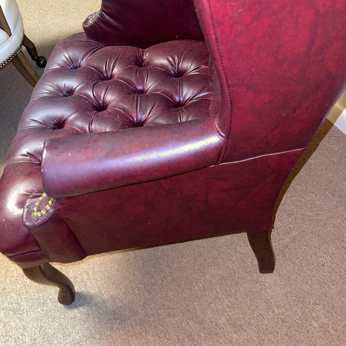 This chair has wooden legs and is covered in maroon vinyl. Some of the vinyl is wearing and there are remnants of a red blanket that used to cover the chair, vacuuming and wiping it down would most likely solve that. With its dark maroon color and it’s decorative tufting, it would serve as a lovely accent piece of furniture. Chair measures approximately 29” x 29” x 41” with a seat height at 16”. Local pickup only.