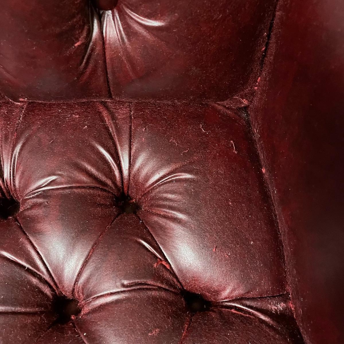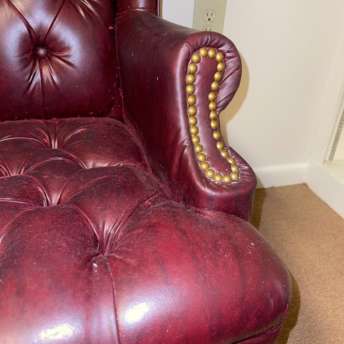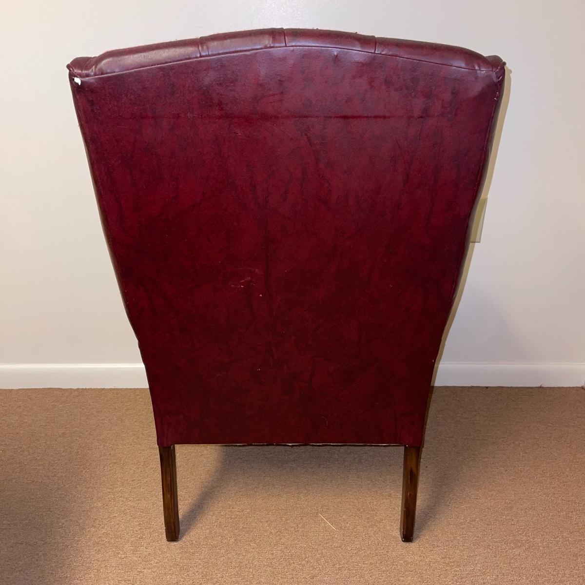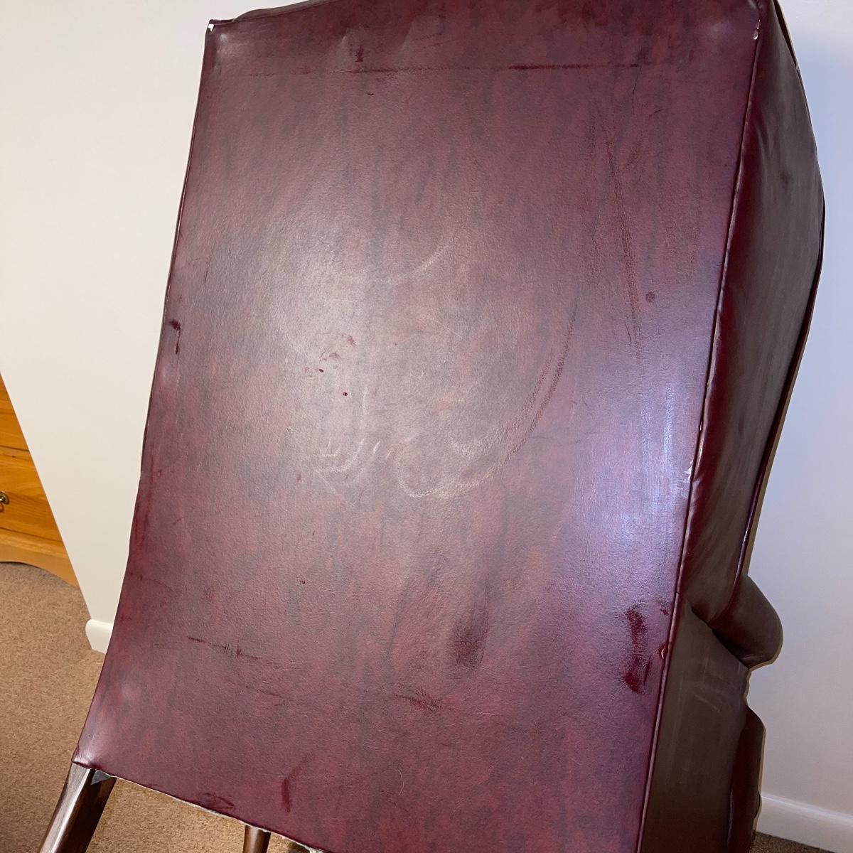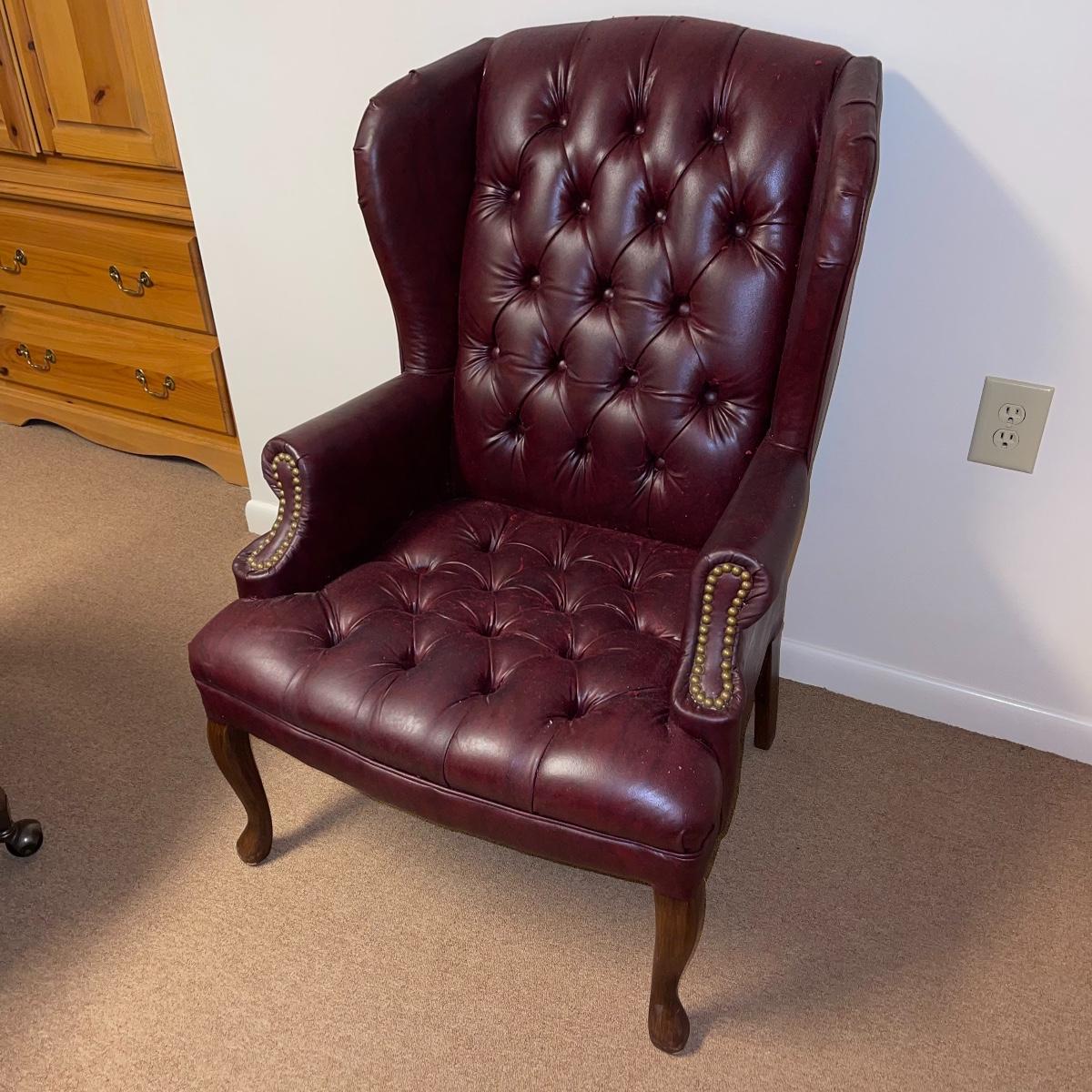 This chair has wooden legs and is covered in maroon vinyl. Some of the vinyl is wearing and there are remnants of a red blanket that used to cover the chair, vacuuming and wiping it down would most likely solve that. With its dark maroon color and it’s decorative tufting, it would serve as a lovely accent piece of furniture. Chair measures approximately 29” x 29” x 41” with a seat height at 16”. Local pickup only.