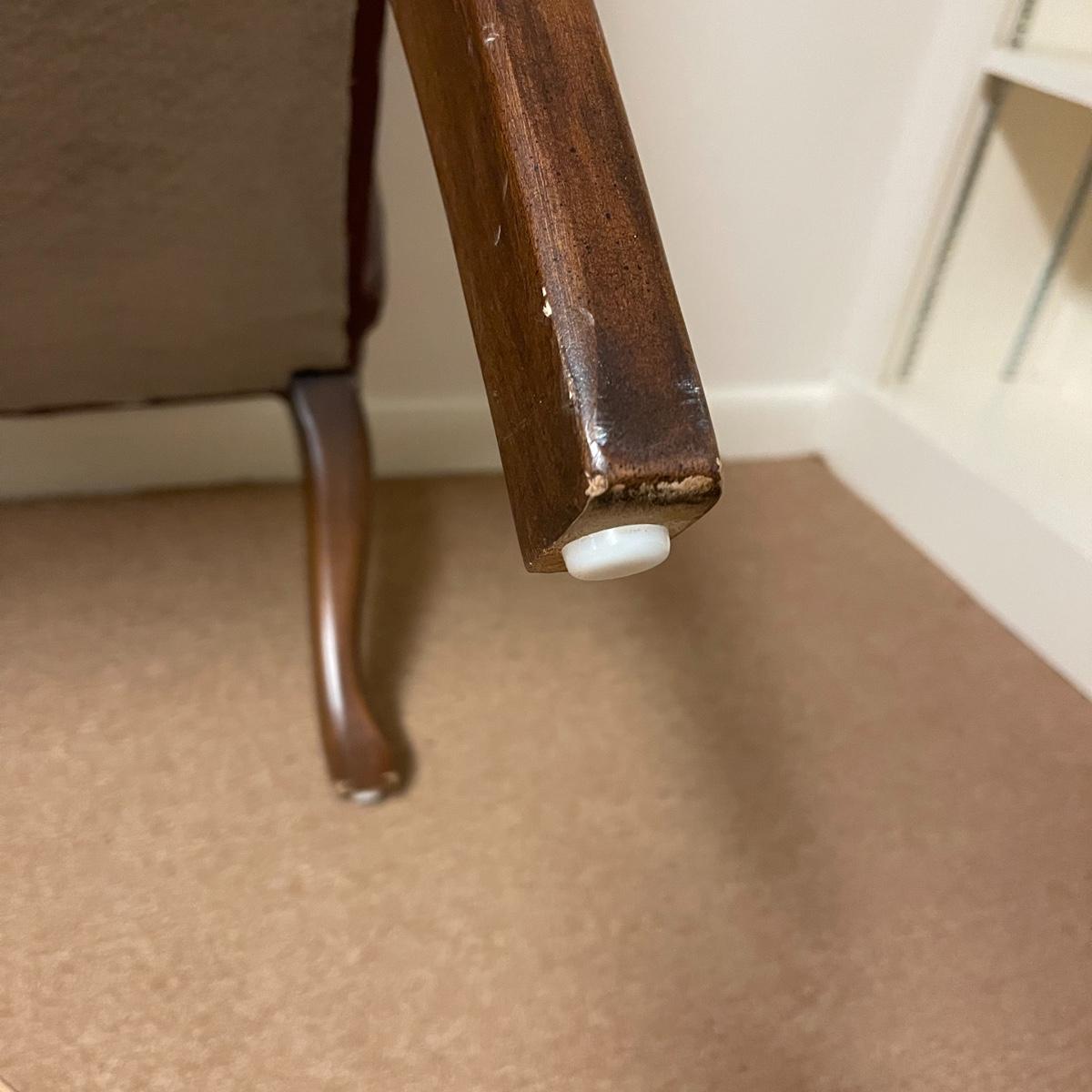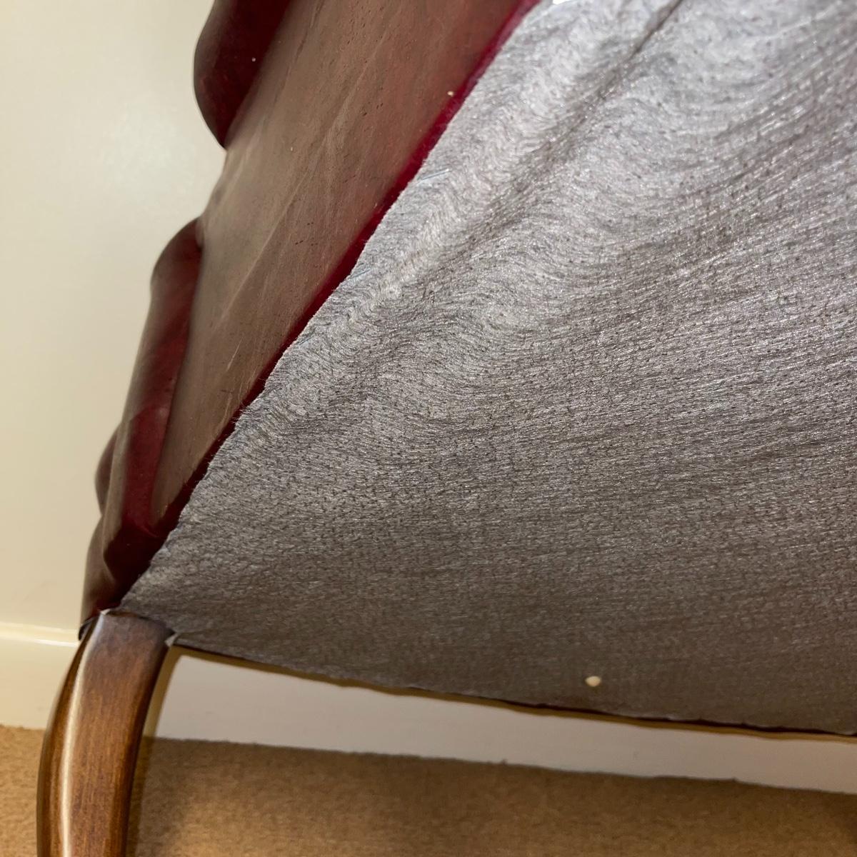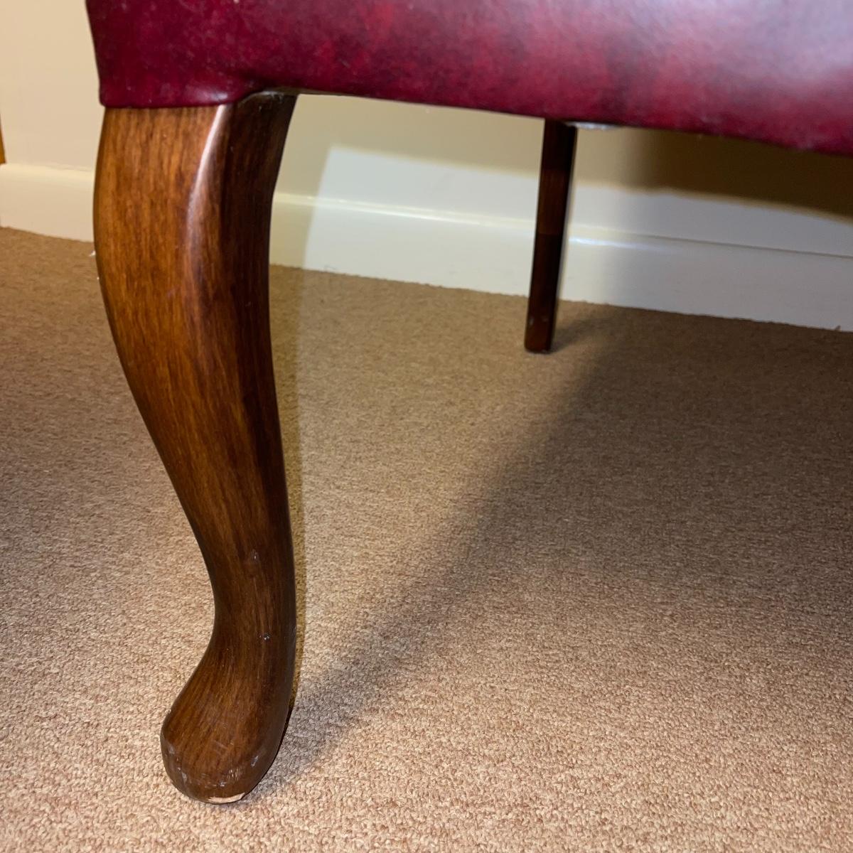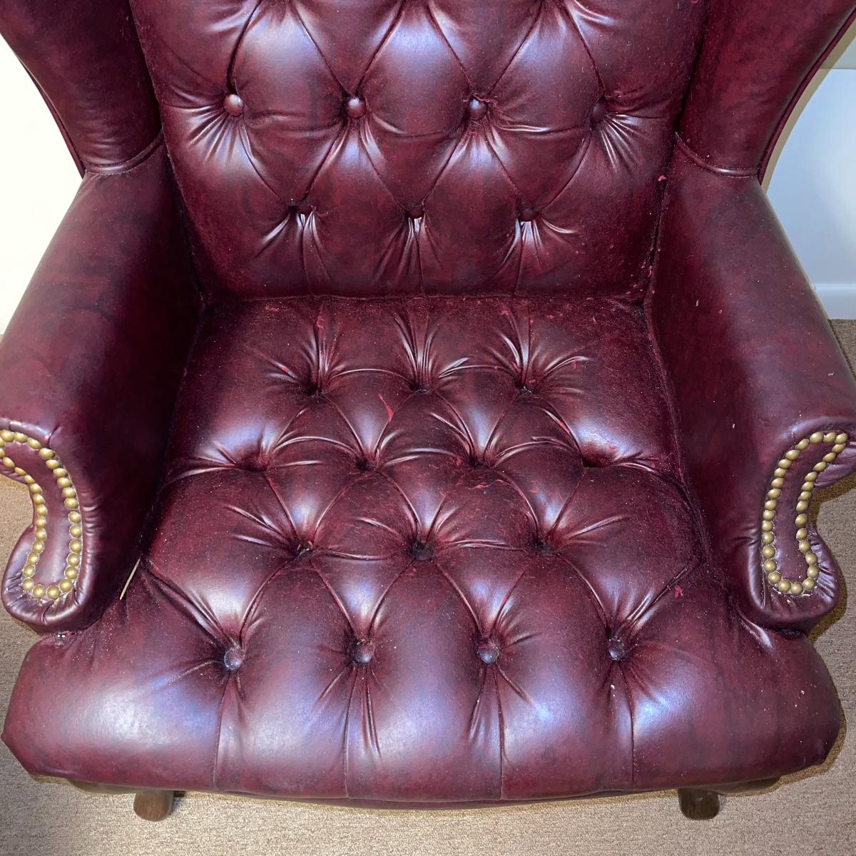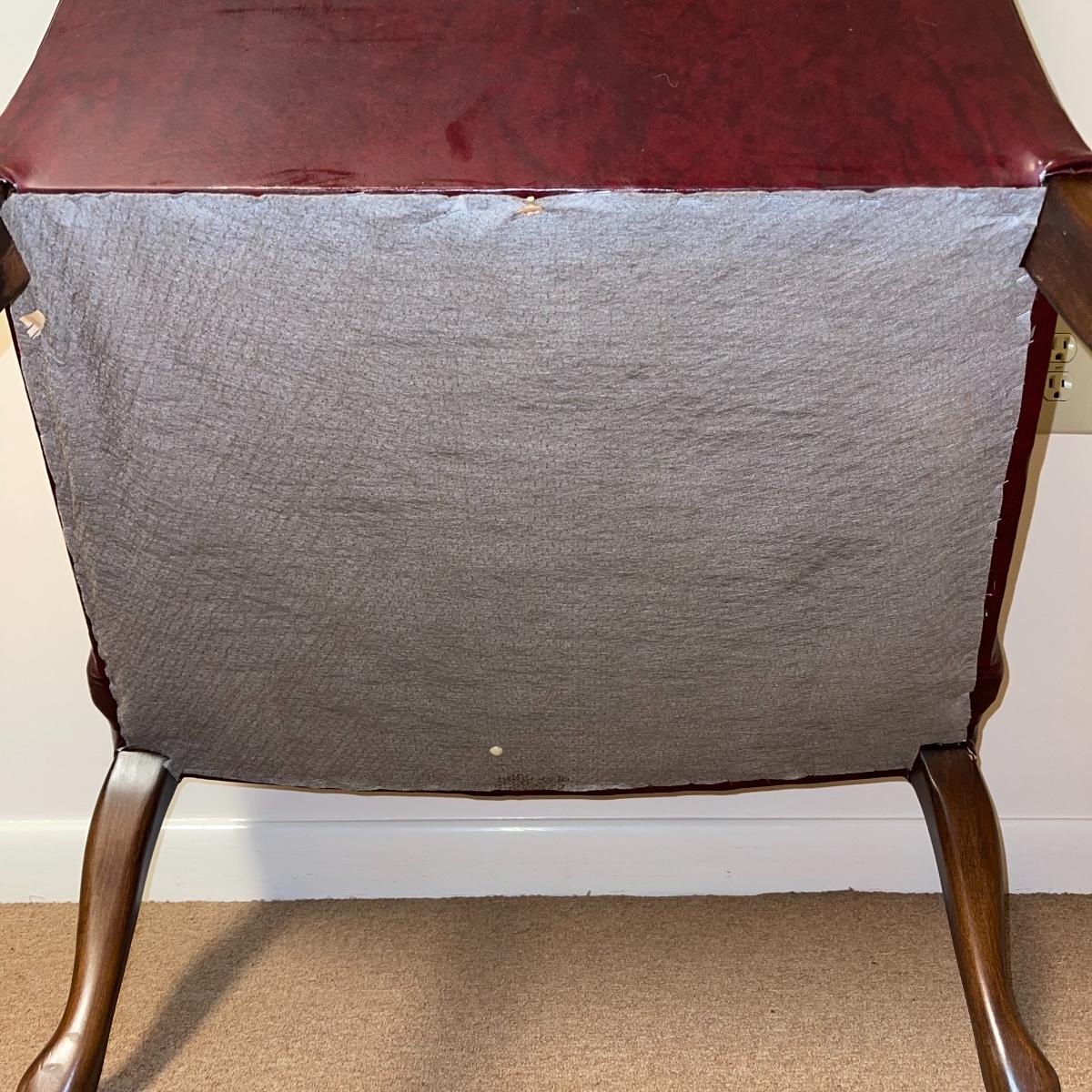 This chair has wooden legs and is covered in maroon vinyl. Some of the vinyl is wearing and there are remnants of a red blanket that used to cover the chair, vacuuming and wiping it down would most likely solve that. With its dark maroon color and it’s decorative tufting, it would serve as a lovely accent piece of furniture. Chair measures approximately 29” x 29” x 41” with a seat height at 16”. Local pickup only.