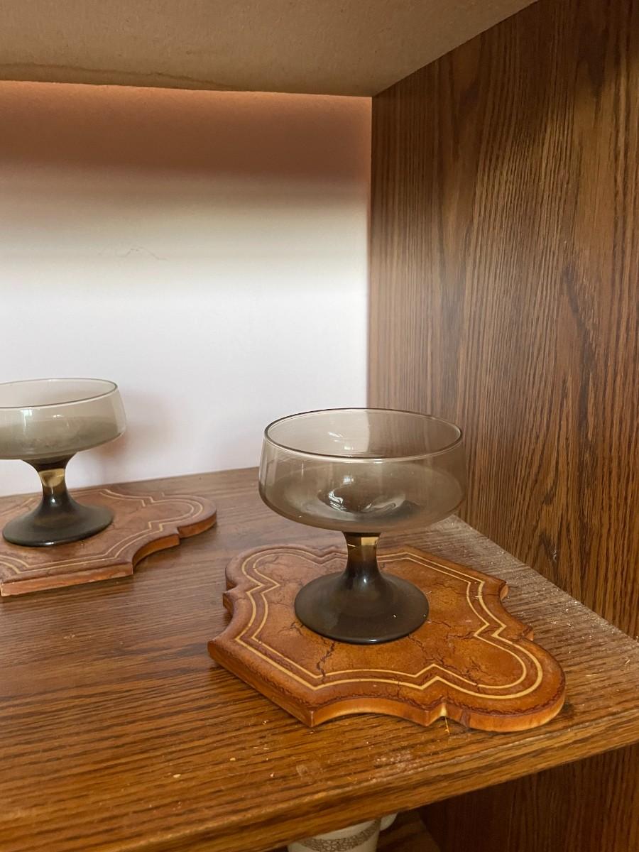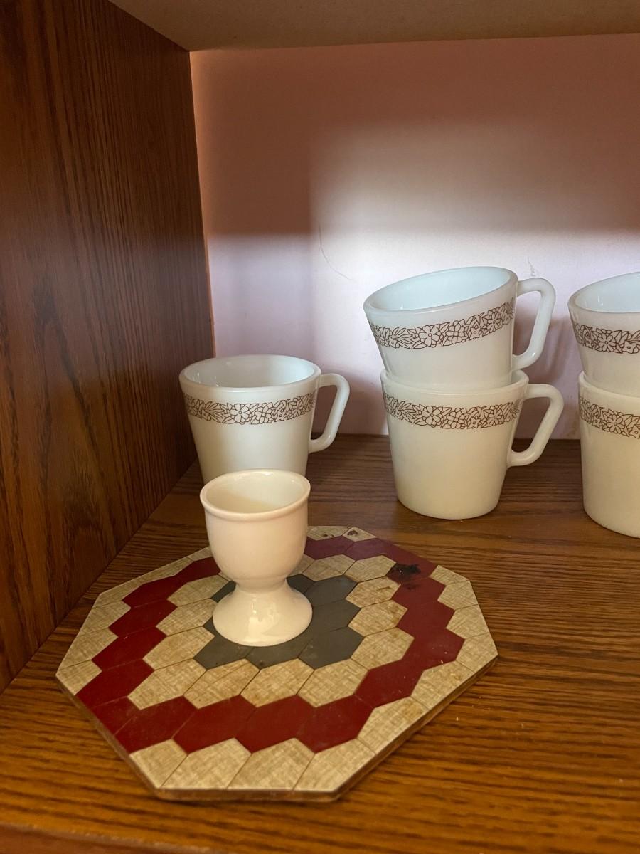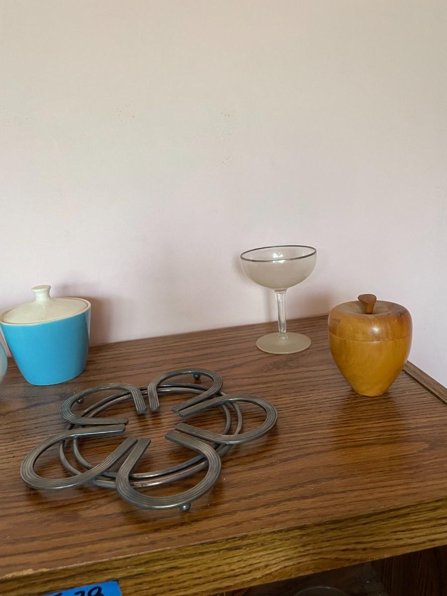 mid century modern rolling cart, glasses, plate stands, signed wooden apple, misc. glassware, set of (6) pyrex mugs.