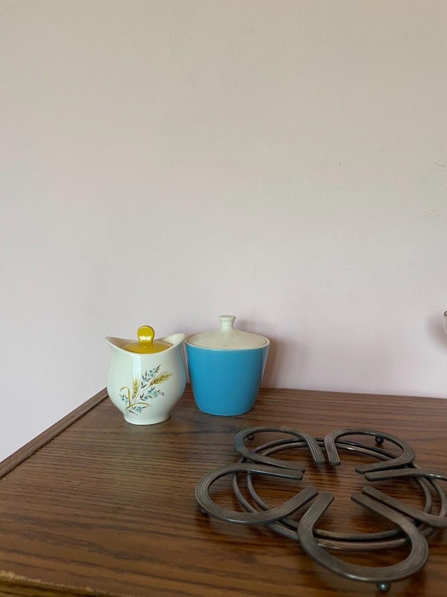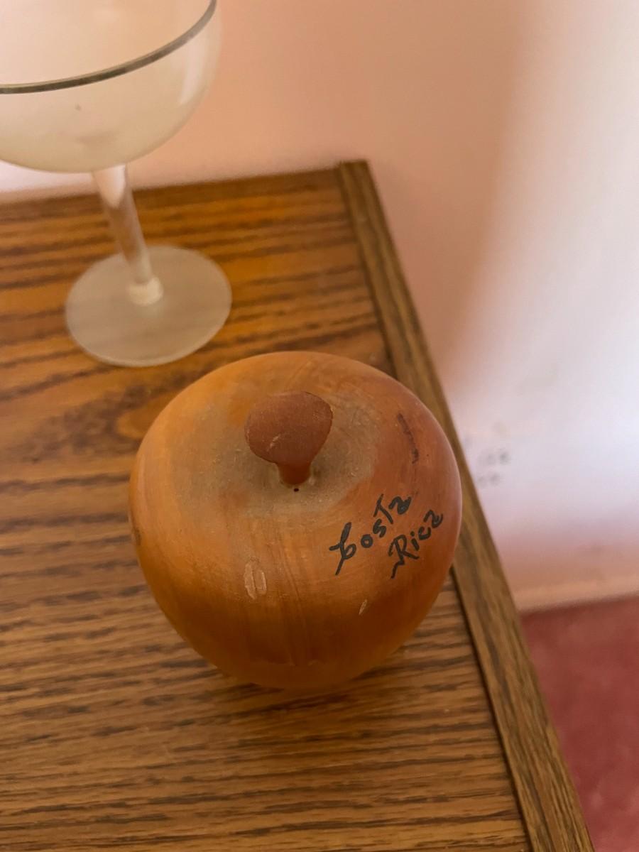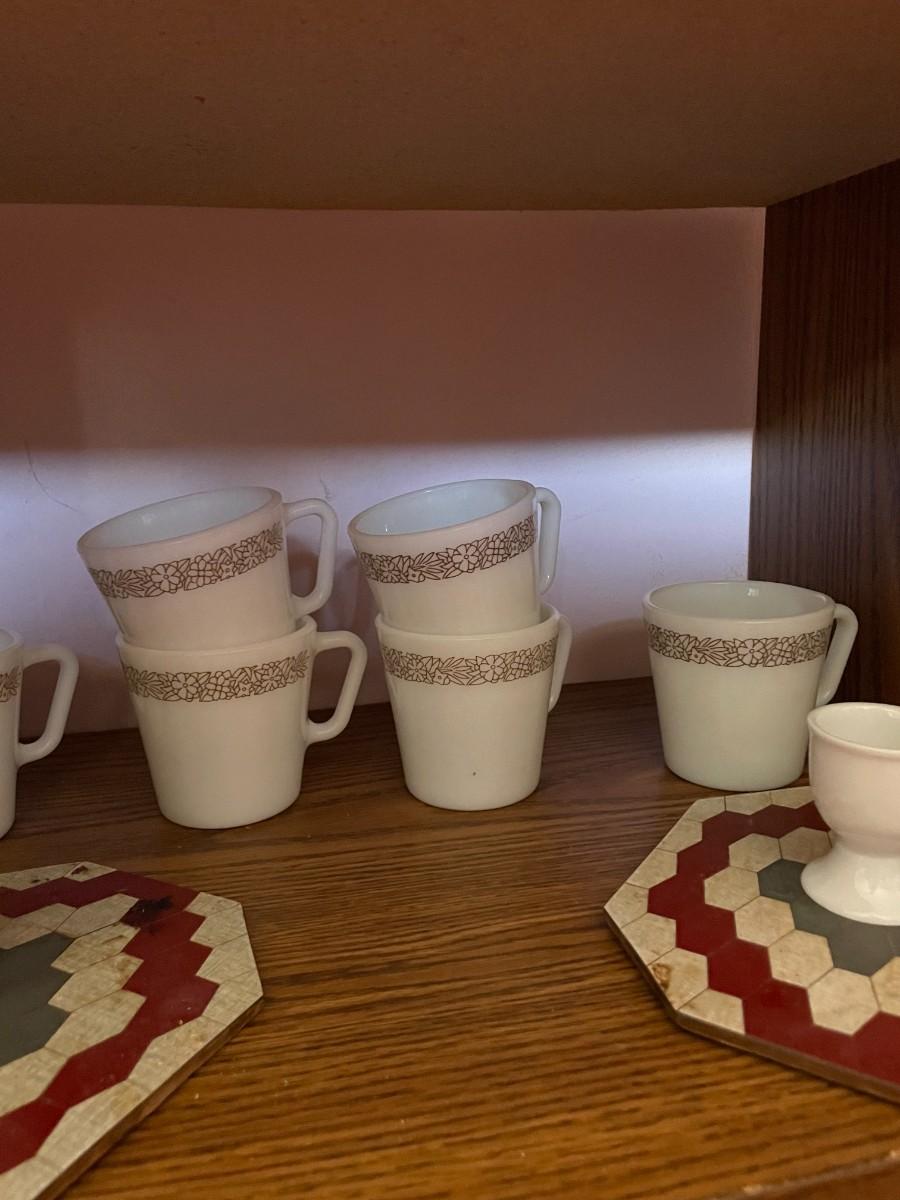 mid century modern rolling cart, glasses, plate stands, signed wooden apple, misc. glassware, set of (6) pyrex mugs.