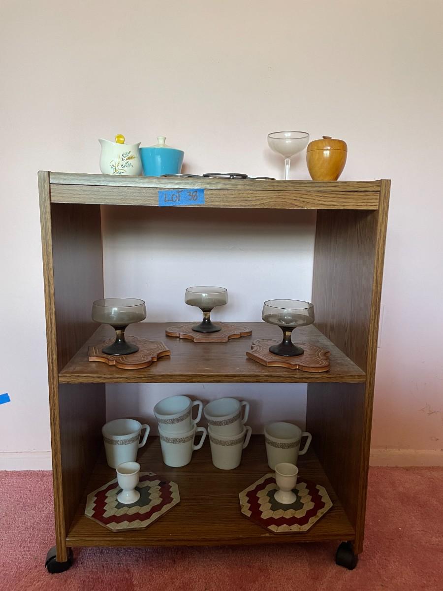 lot 38- mid century modern rolling cart, glasses, plate stands, signed wooden apple, misc. glassware, set of (6) pyrex mugs