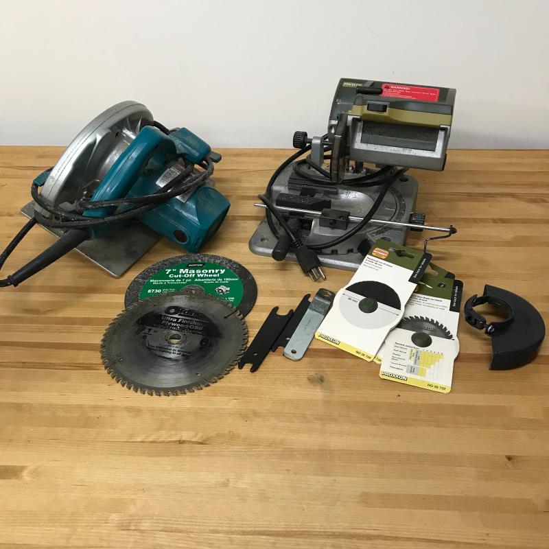 Mikita Saw and Proxxon Table Saw. Both are is working order with attachments and extra saws and cutters. Lot is available for local pick up in Asheville, NC only.