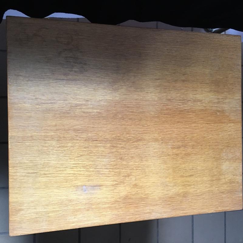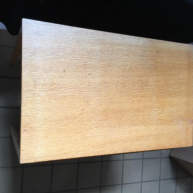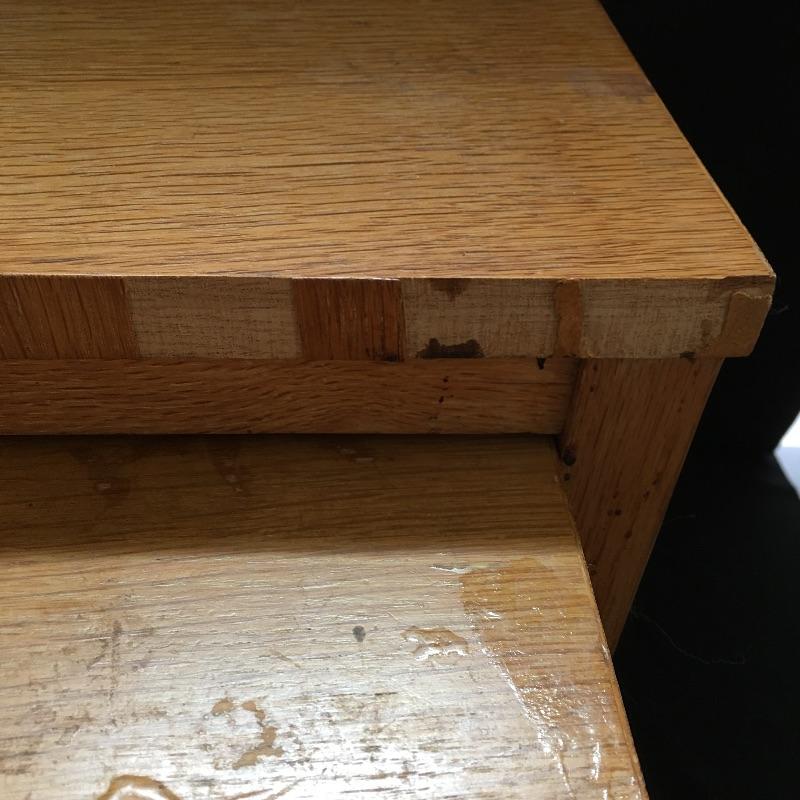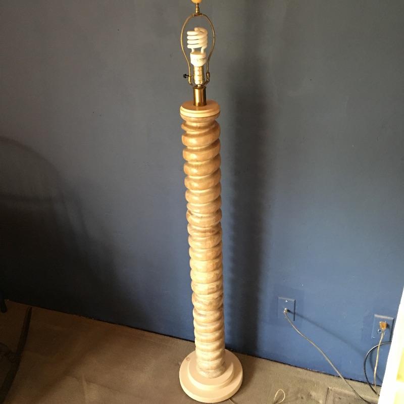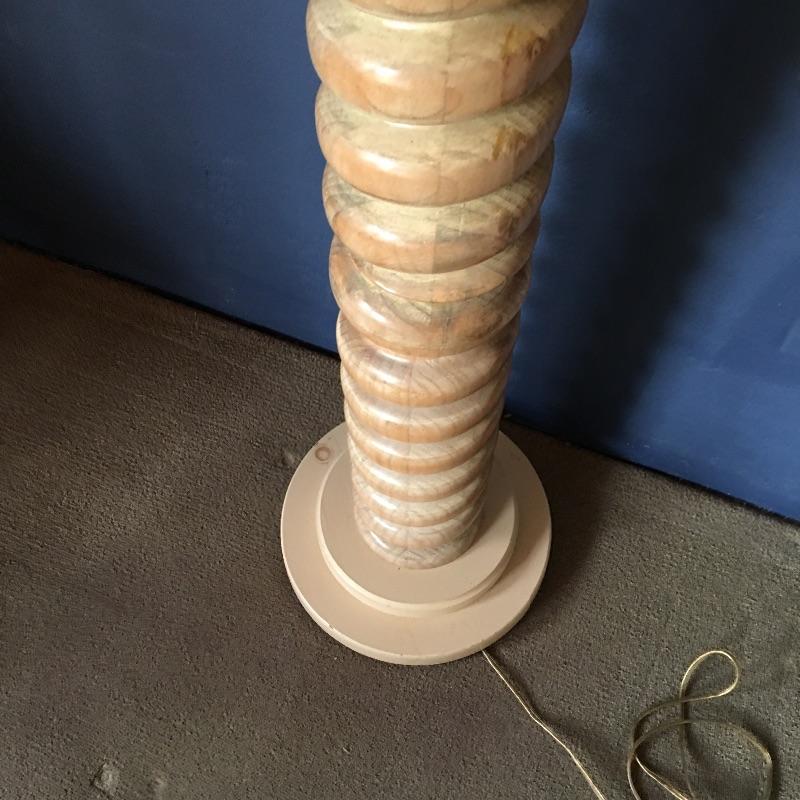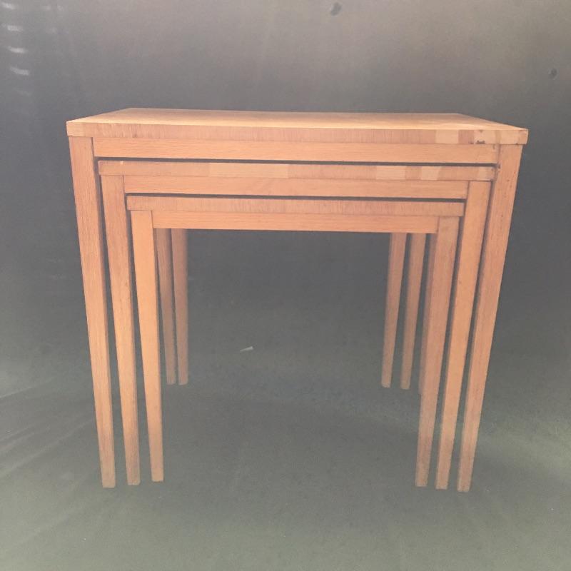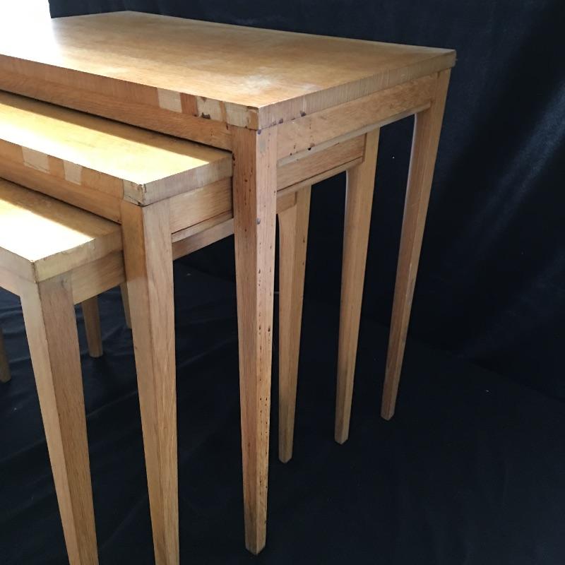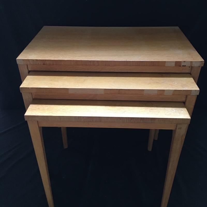 Trio of wooden nest tables and a wooden floor lamp. Tables have veneer chipping off and the tops have some defects, see pictures. A little bit of talent and hard work and you can breath new life into these nesting tables. Largest table measures 16” x 26” x 24”. Lamp stands 61" tall.