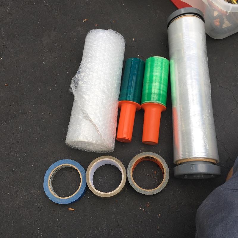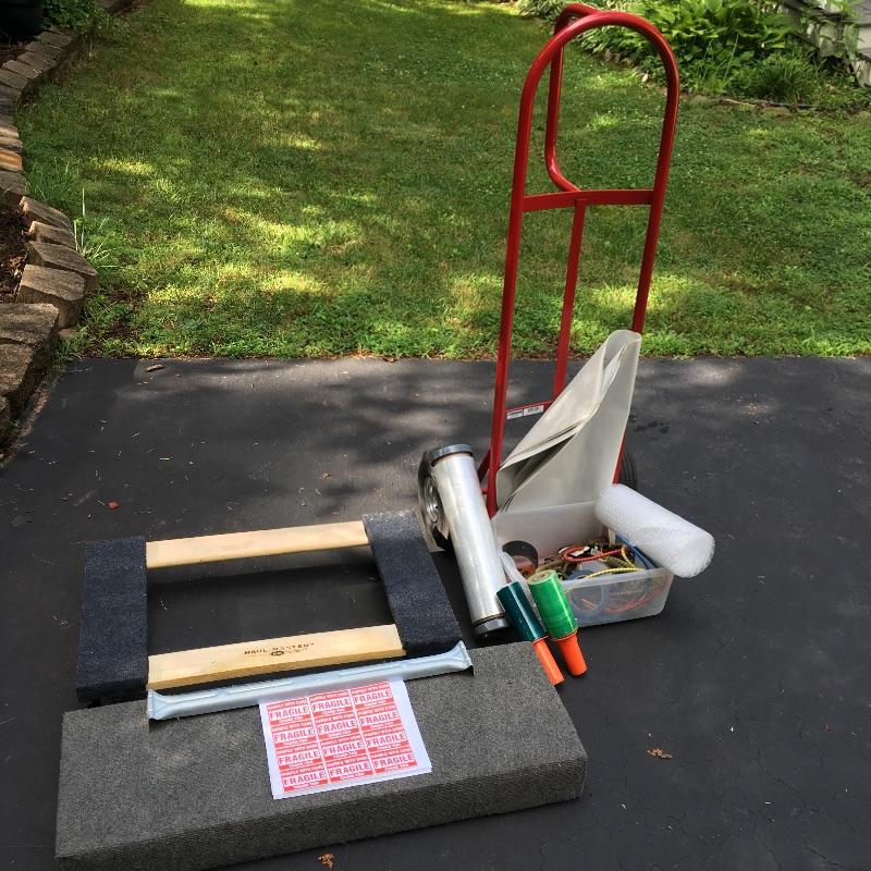 Get ready for your next move with these always handy to have moving and pack essentials that include Milwaukee hand truck, Haul - Master dolly, bungee cords, bubble wrap, tape, plastic wrap, hanging pole for moving box and a carpeted wooden box and more.