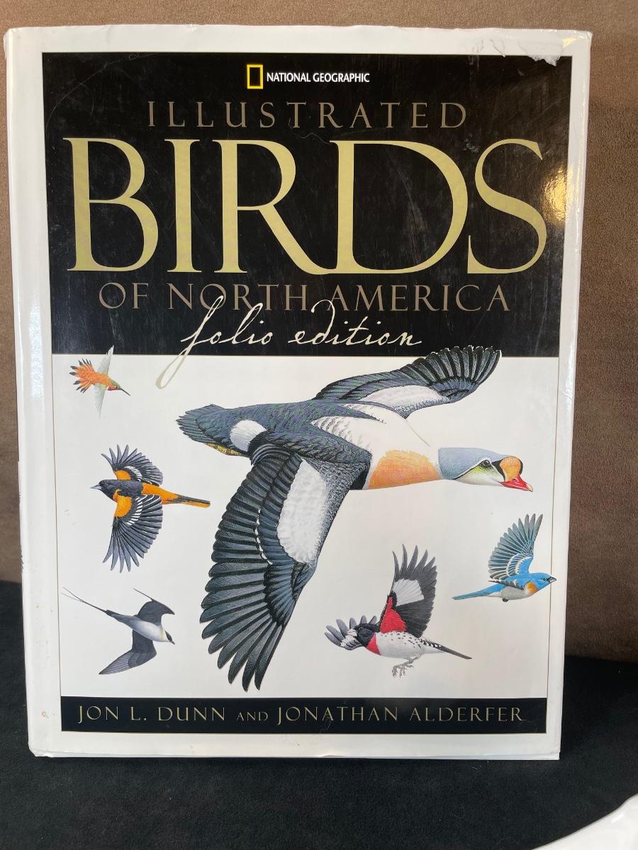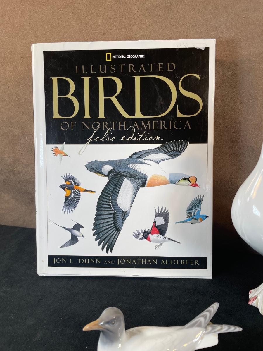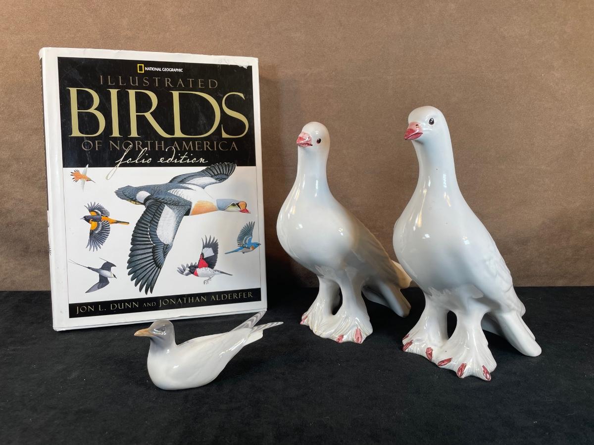 Pair of Ceramic birds (10") marked "Italy RC 1418" and a coffee table book "Illustrated Birds of North America"