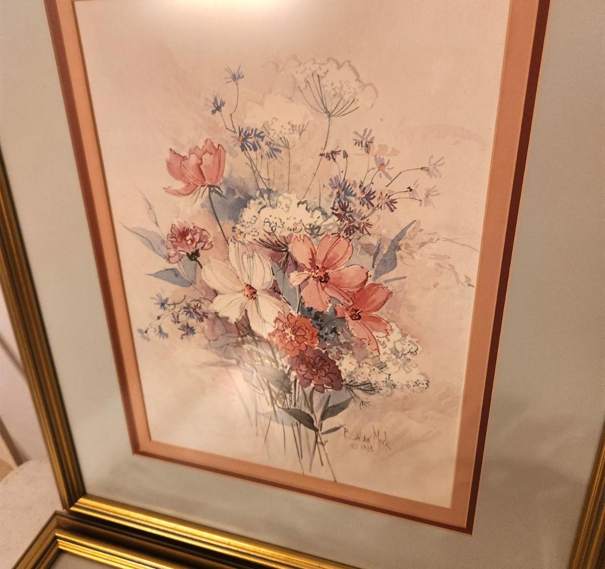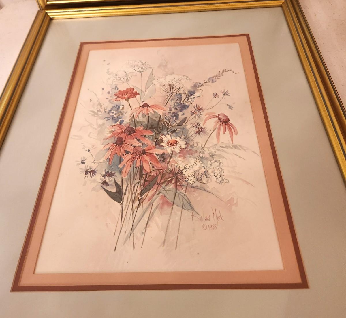 Nice pair of Brenda Mock (listed artist) floral prints - dated 1995 - Triple matted - soft colors - think Farmhouse decor. Each measures 20" x 24".
