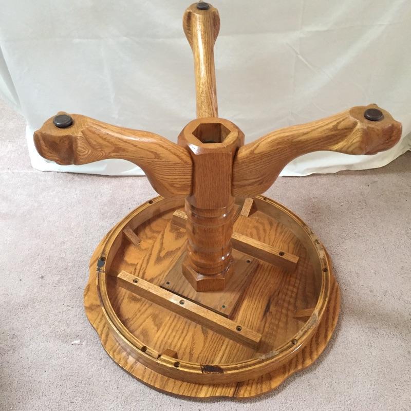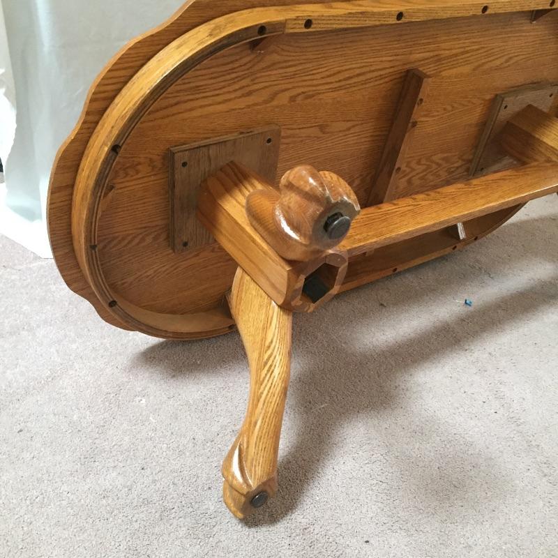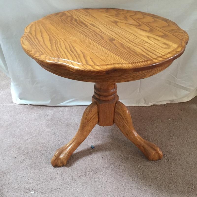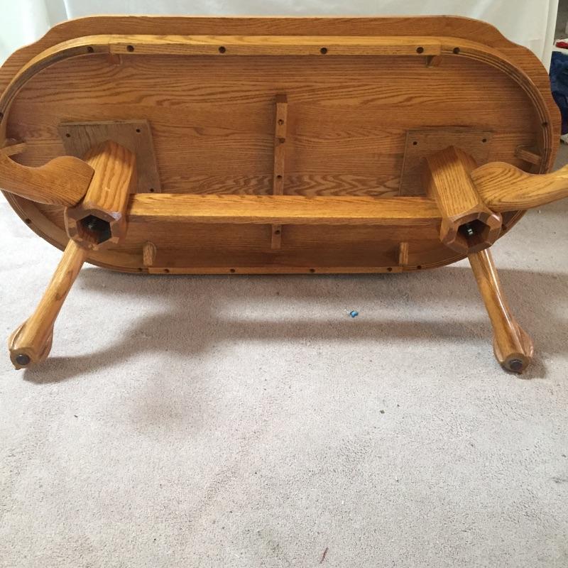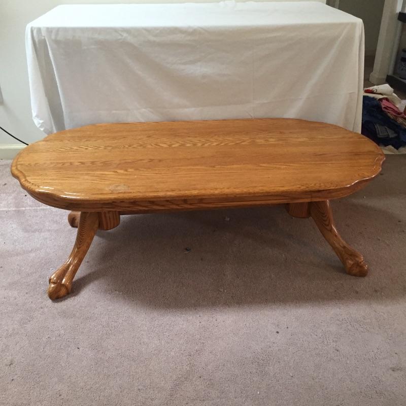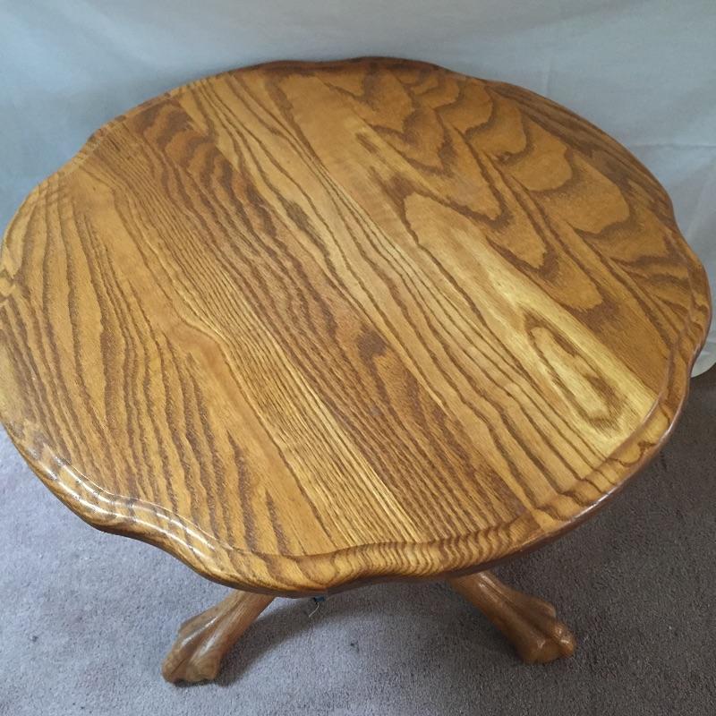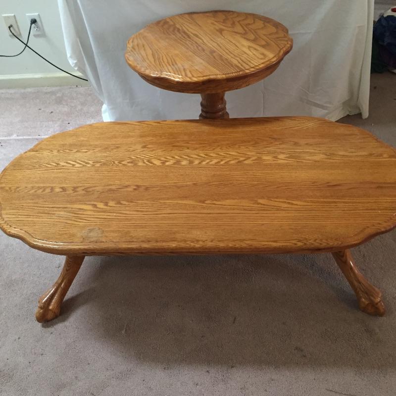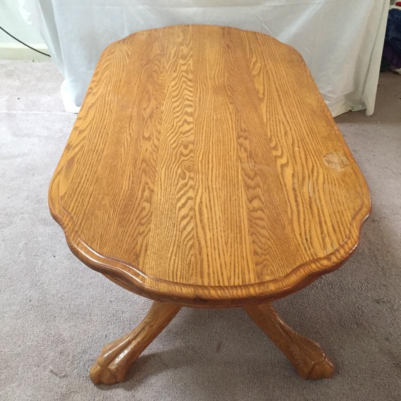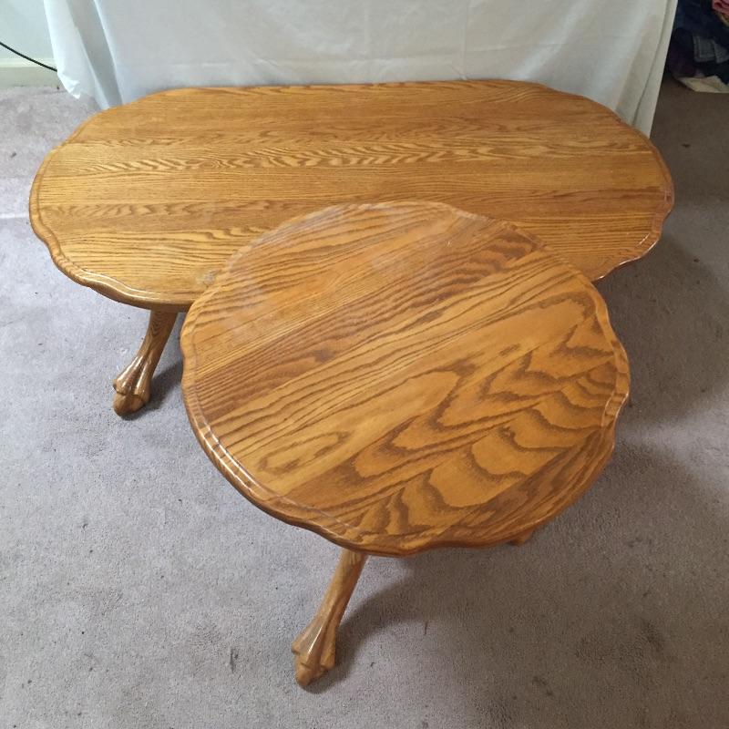 Lovely pine coffee table and side table. Both have claw feet details. Coffee table has some defects - See Pictures. Large Table measures 48” x 24” x 15.75” small table measures 24” D 22” tall.