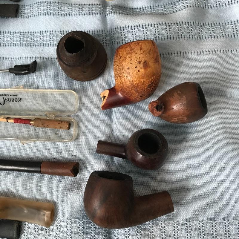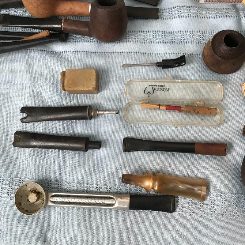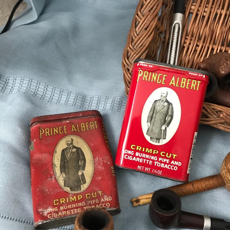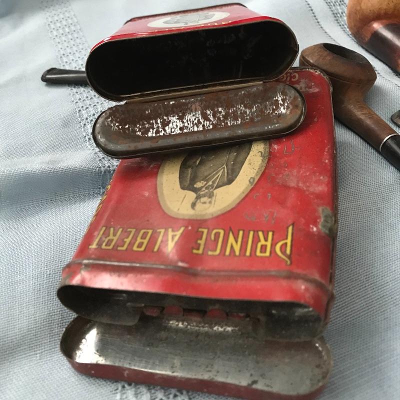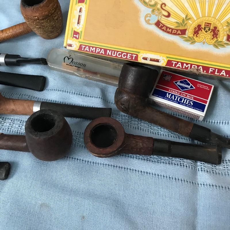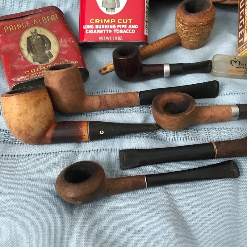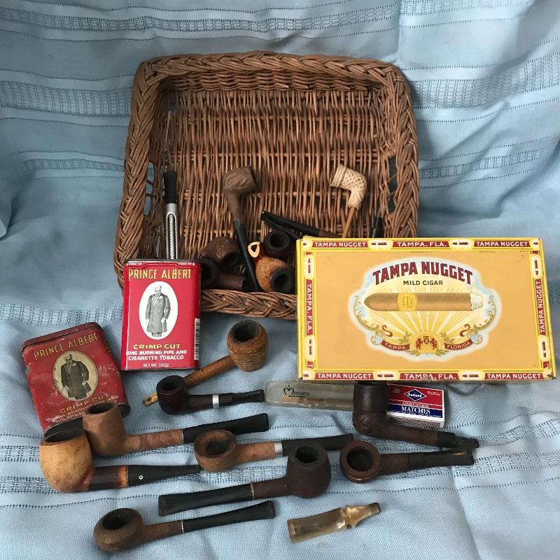 Large collection of pipes and pipe parts! Two vintage Prince Albert tobacco tins, and a Tampa Nugget cigar box. Shipping available.