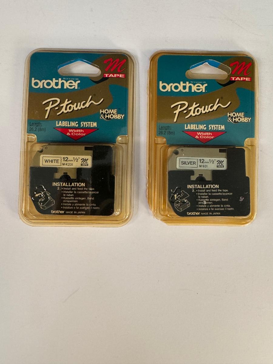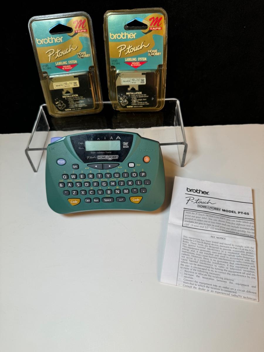 Includes brother P-touch Home & Hobby Label Maker Model PT-65(power cord missing) works with 6 AA batteries, has 1 white 12mm 1/2” M tape in machine that’s been partially used, and with 1 brand new white 12mm 1/2” M tape and 1 brand new silver 12mm 1/2” M tape.