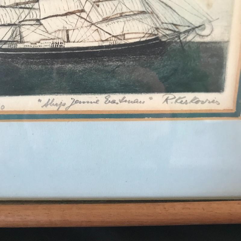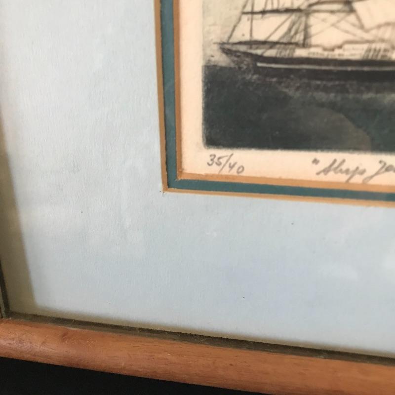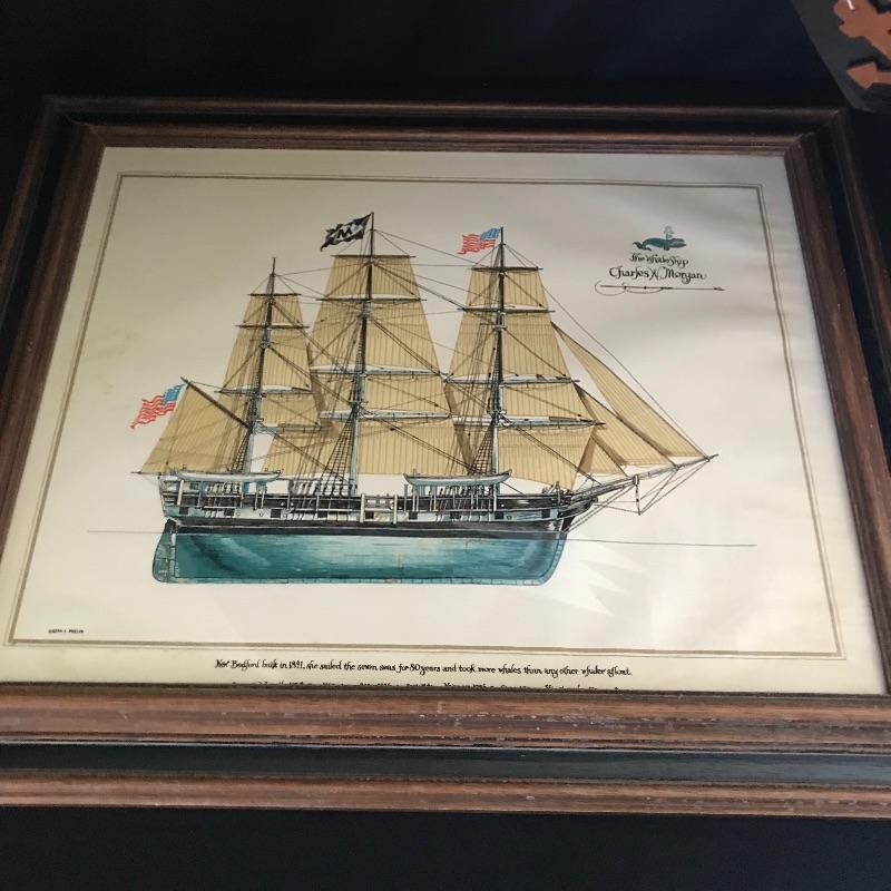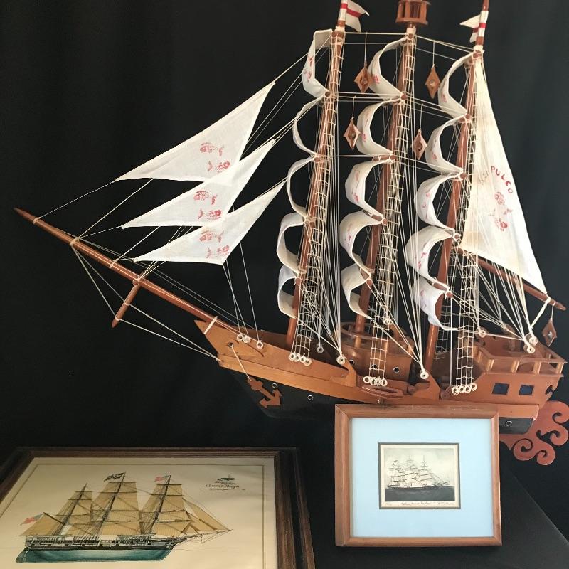 Lot includes large model ship with great detail and “Acapulco” on a sail. Approx. 43” x 10” x 40”. Lot also includes WhaleShip by Charles Morgan print (approx. 24” x 20”) and signed and numbered “Ship Jennie Eastman” 35/40 by artist Ruth Kerkovious. See pics. Local pickup only.