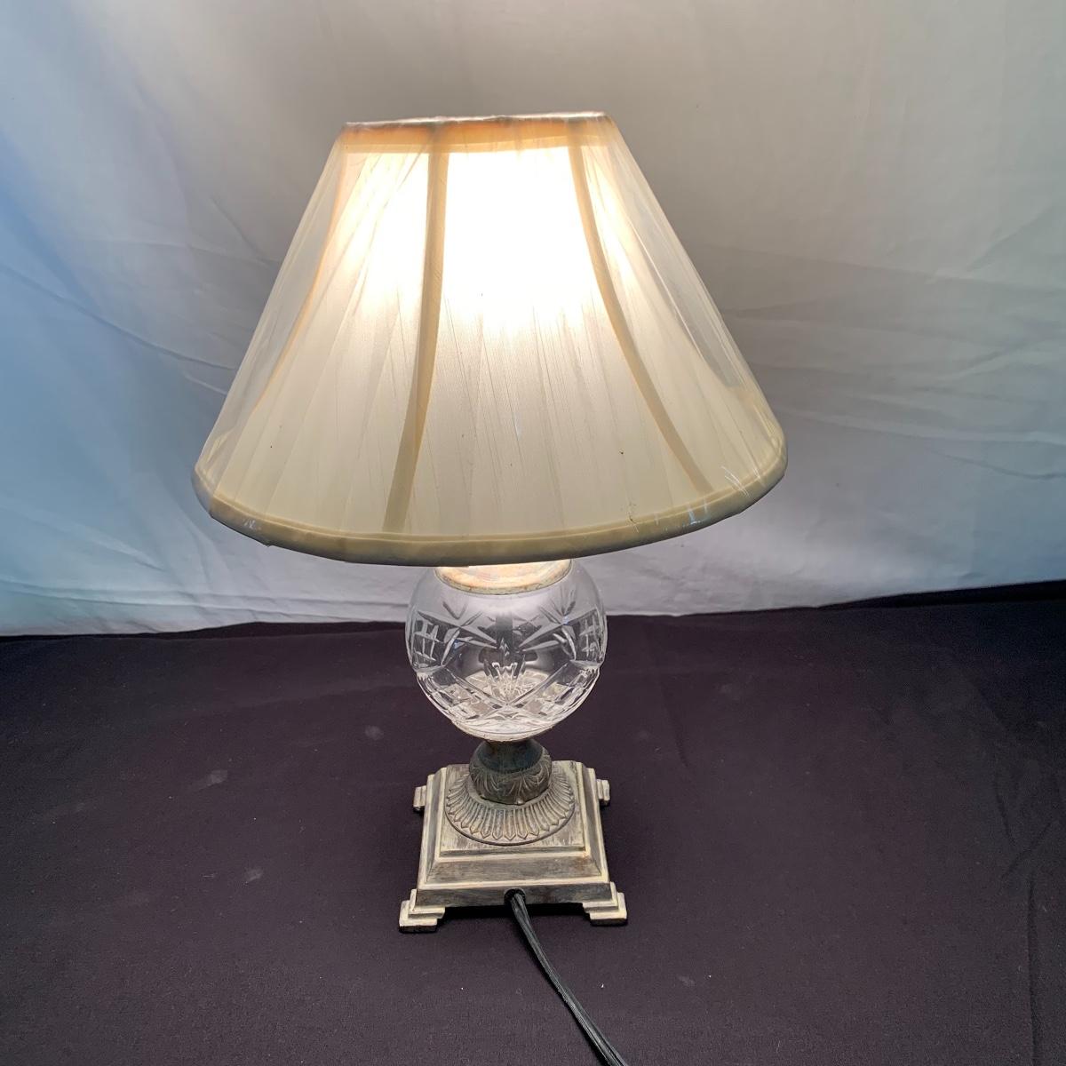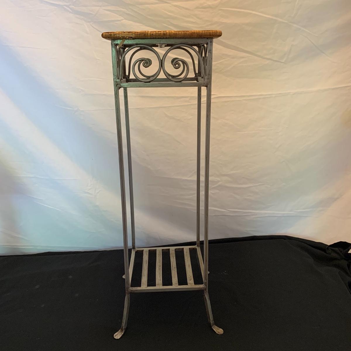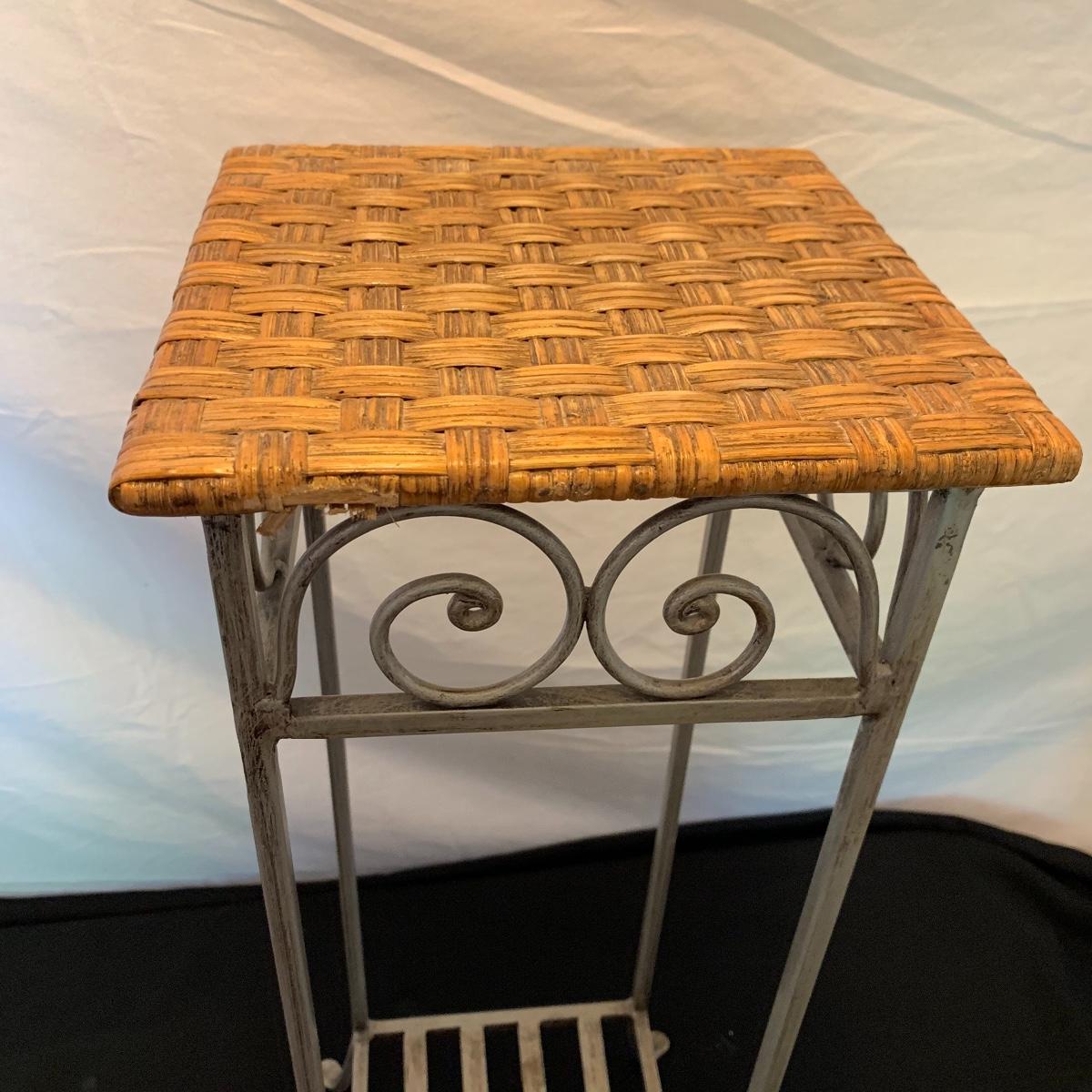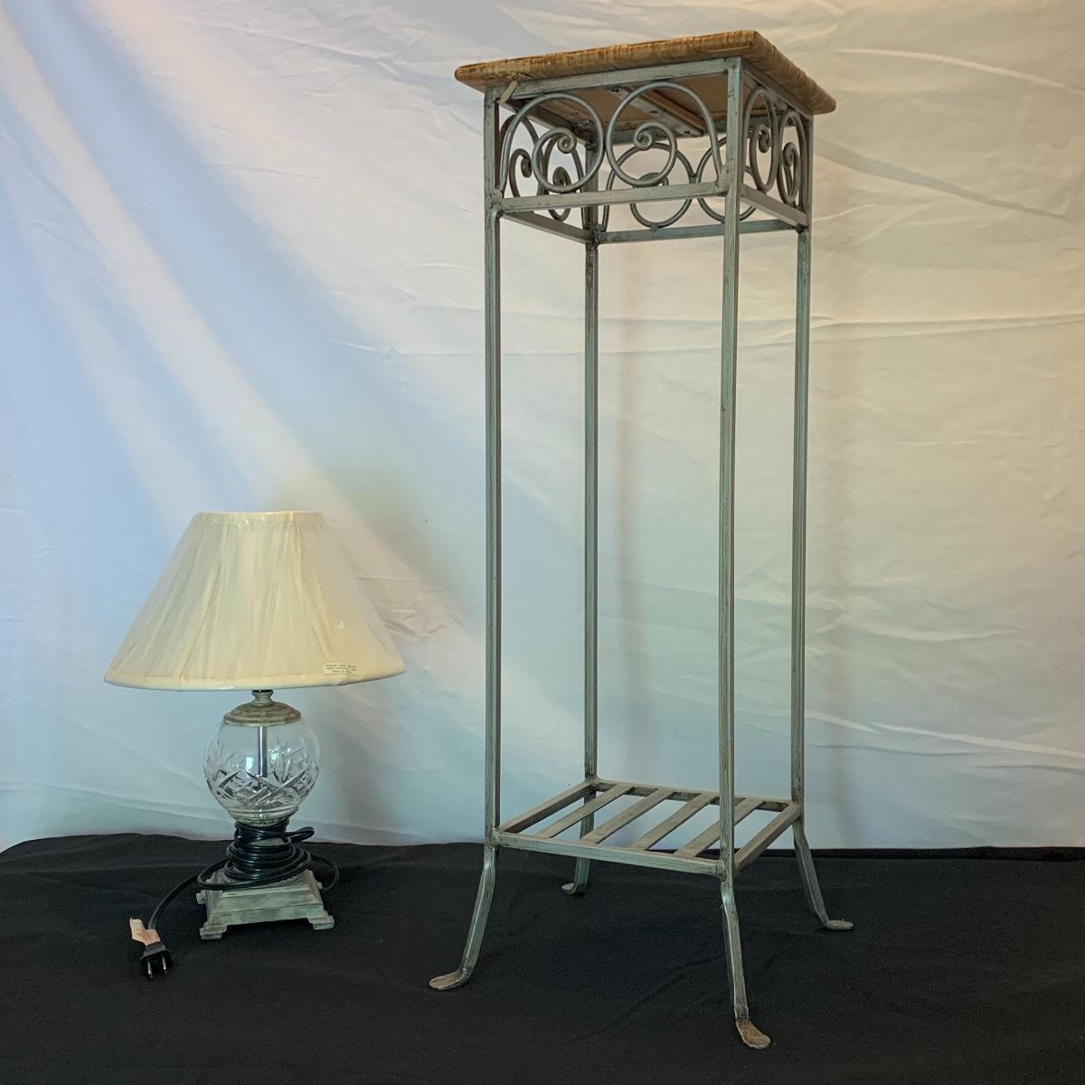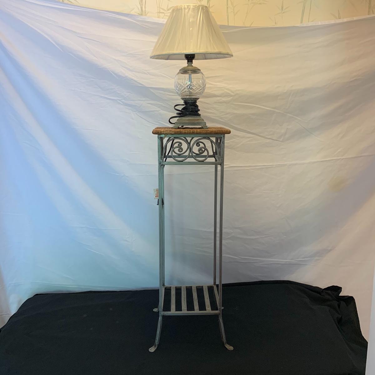 The small metal stand with a brown woven wicker-like surface measures 10” x 10” x 30”. It has a little shelf near the bottom of the stand. Also included is a small lamp with a glass body and a metal base. The lamp shade is still in plastic and appears in new condition. The lamp functions. Local pick up