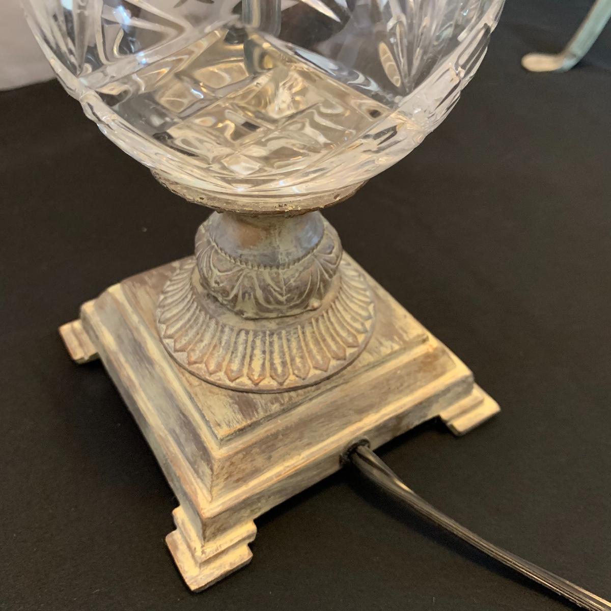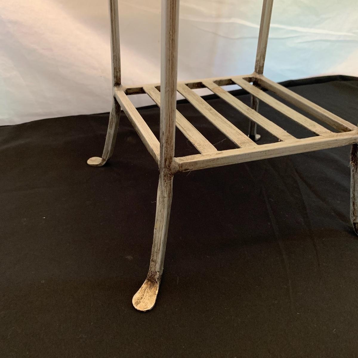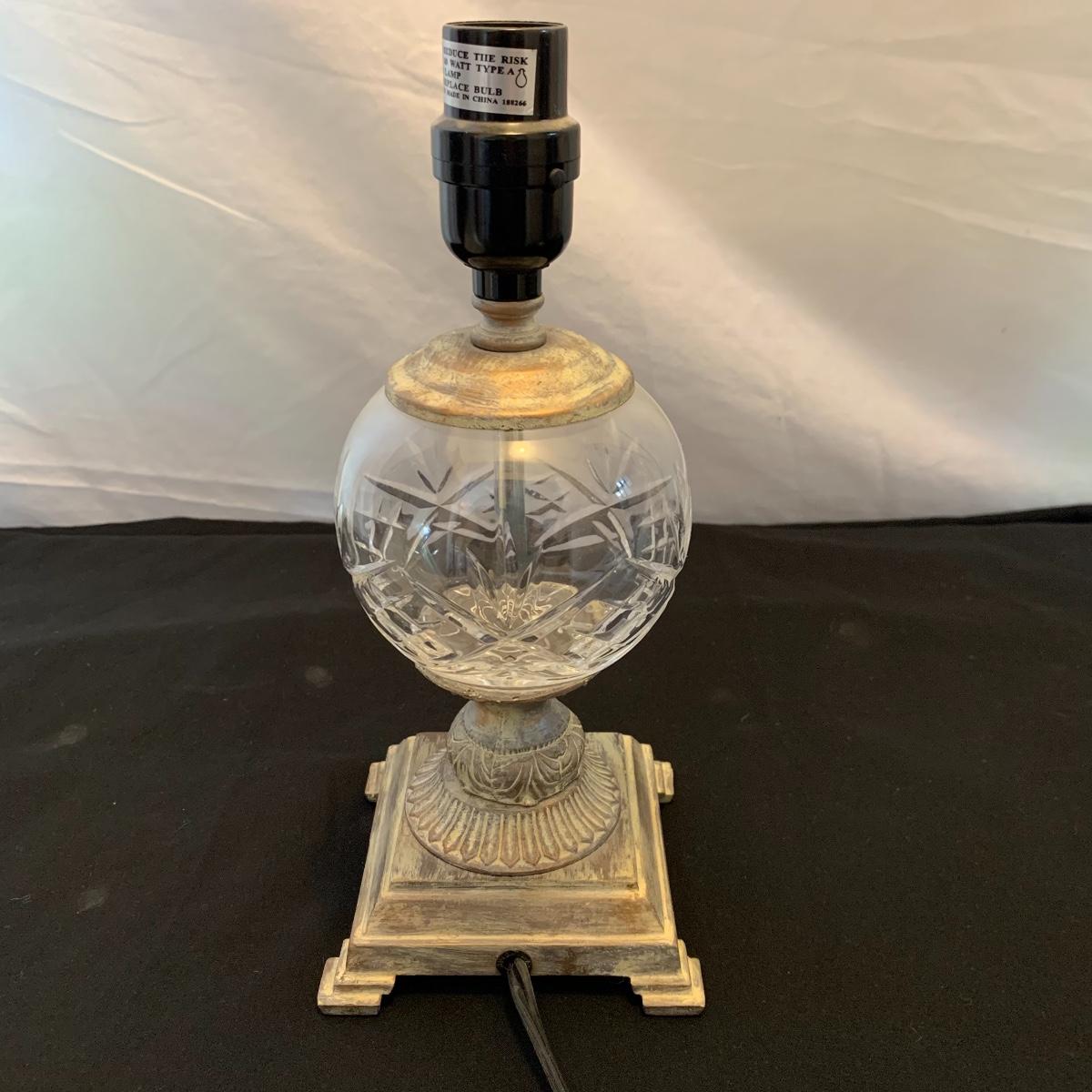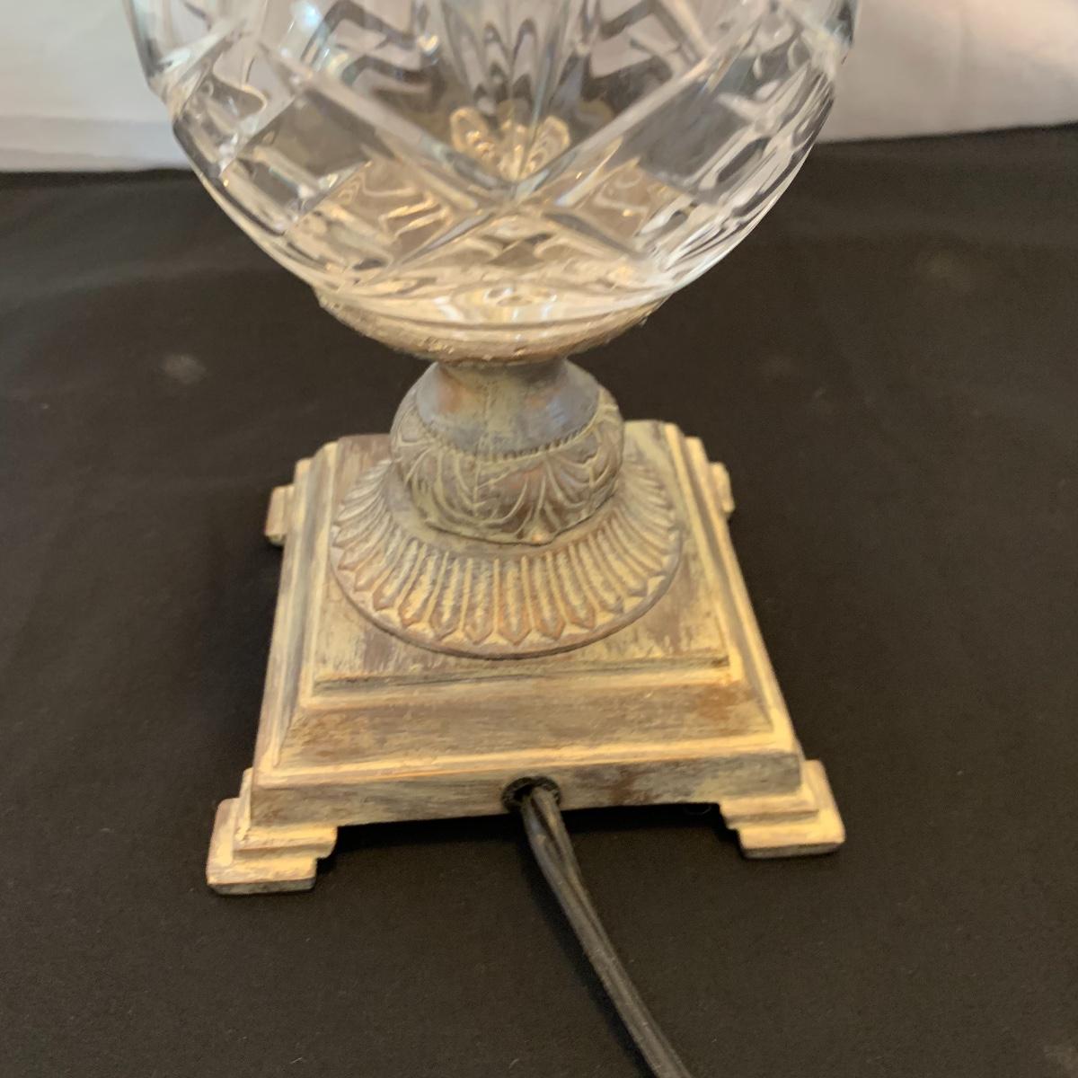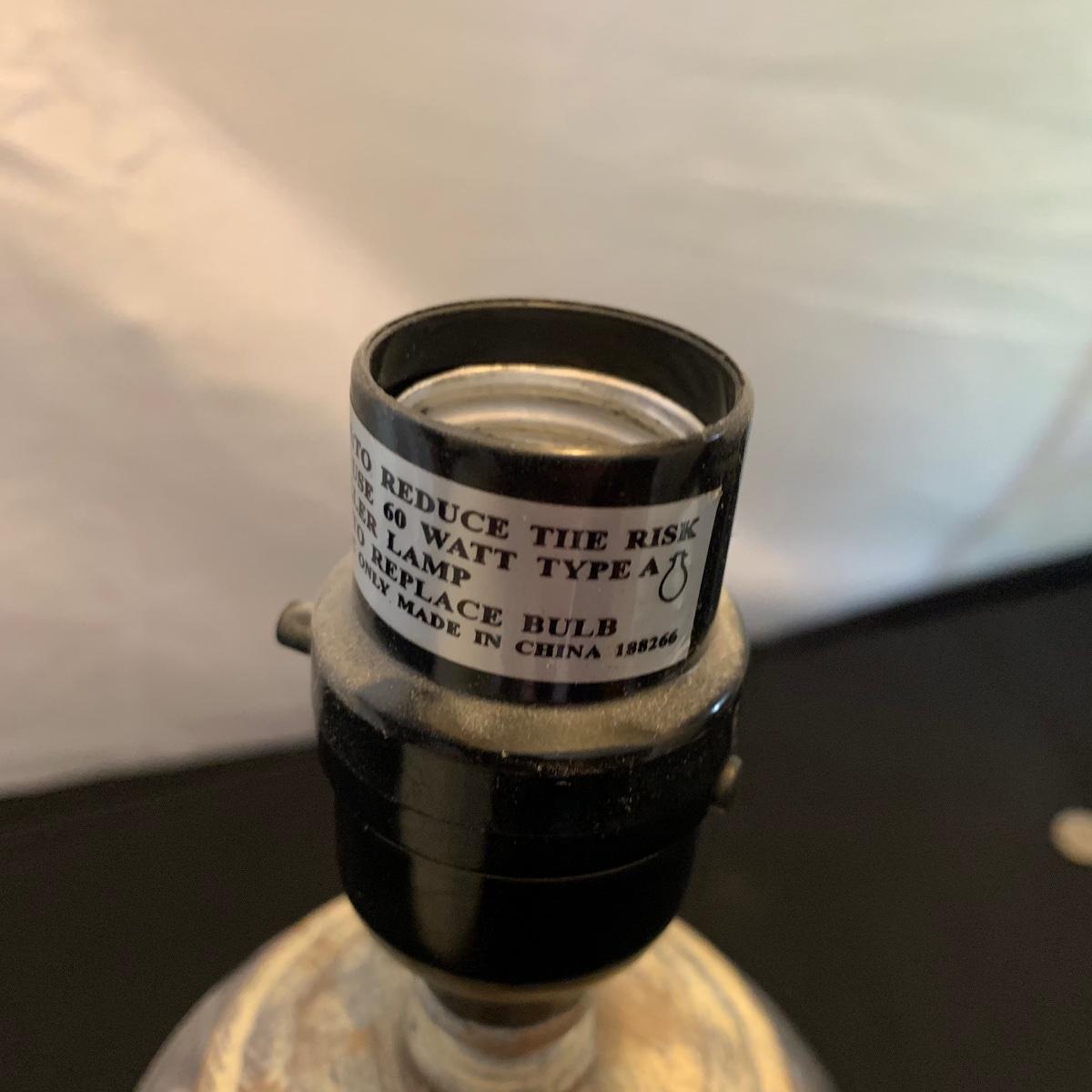 The small metal stand with a brown woven wicker-like surface measures 10” x 10” x 30”. It has a little shelf near the bottom of the stand. Also included is a small lamp with a glass body and a metal base. The lamp shade is still in plastic and appears in new condition. The lamp functions. Local pick up