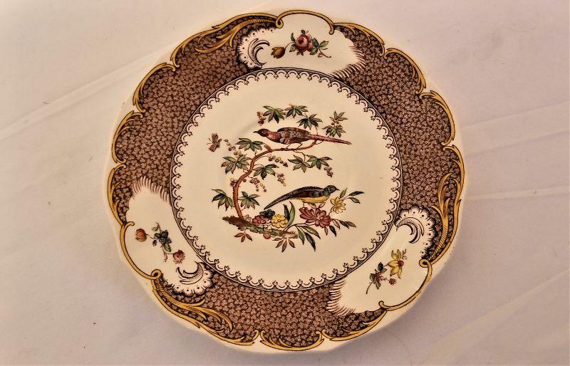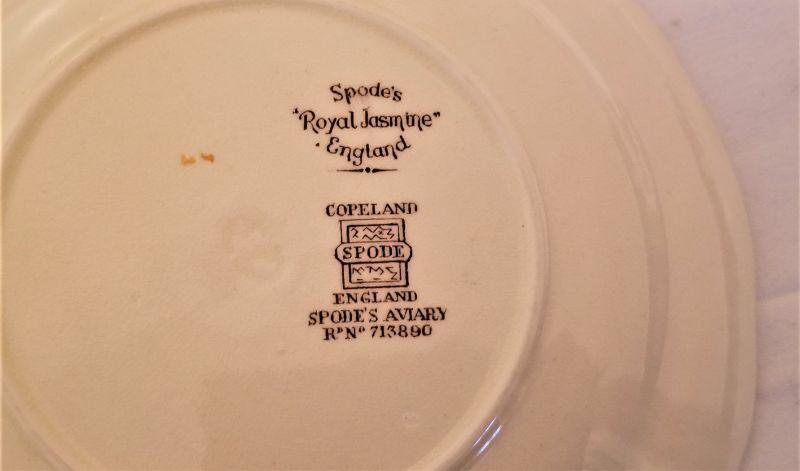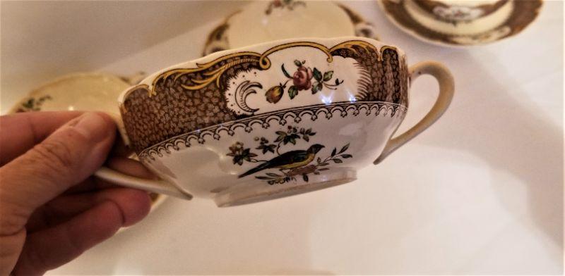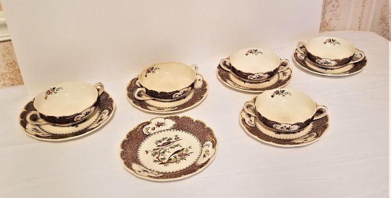 You get five matching Spode Cream Soup bowls with matching underplates, plus one additional underplate. Spode's Aviary "Royal Jasmine" pattern - these have the registration mark "713890", which dates them to 1925. A couple of the bowls have some age-related crazing to the inside of the bowls. Each is 7.25" across and 2" tall.