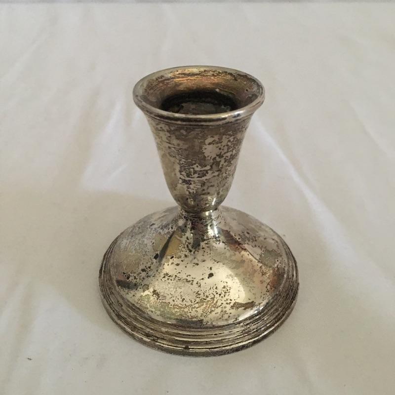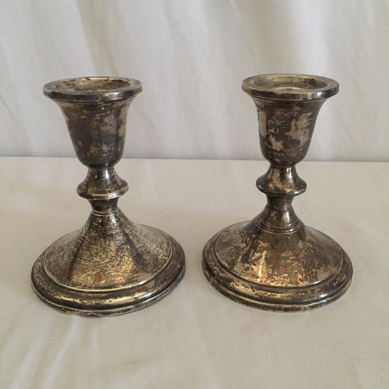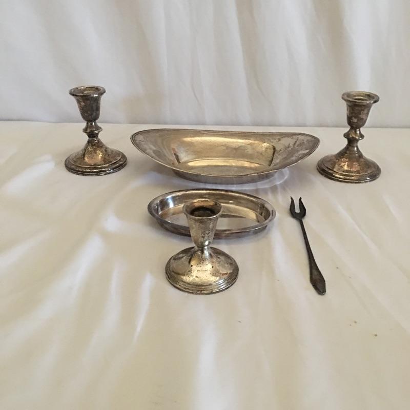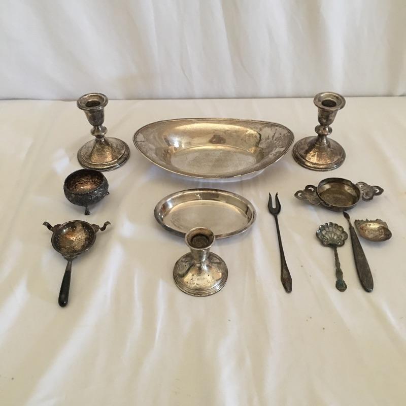 Nice selection of sterling silver and more. This lot includes three Sterling silver candleholders, one tray, a spoon and a fork that are marked sterling silver. The others look to be silver but are not stamped.