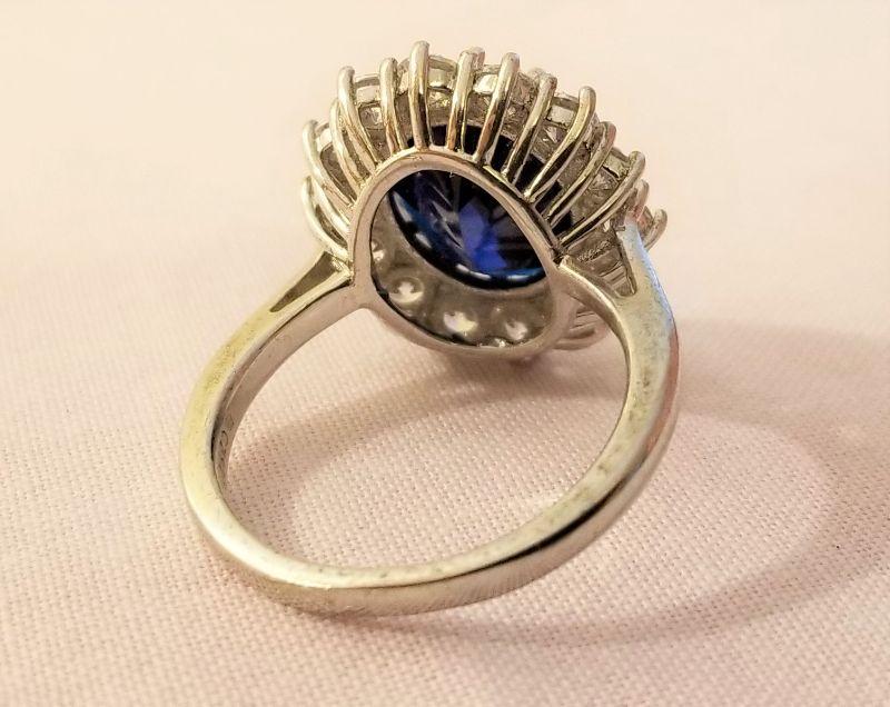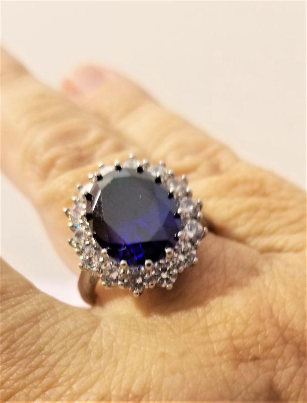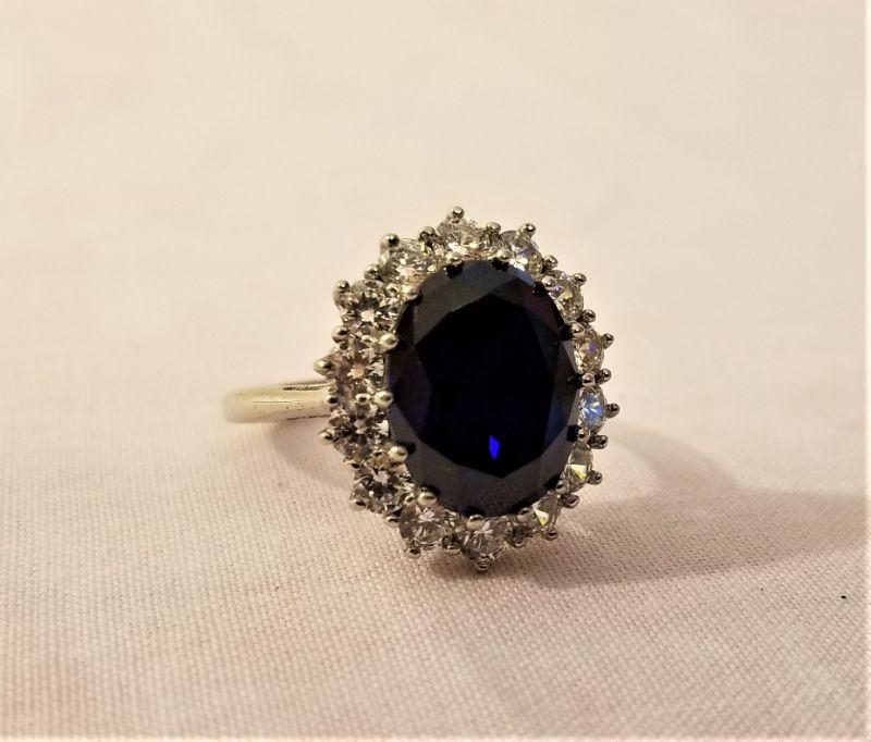 Nice costume ring - sterling silver set with a faux sapphire surrounded by CZs. Probably an 80's copy of Lady Di's engagement ring. Size 9. About 3/4" tall. Good condition - very pretty.