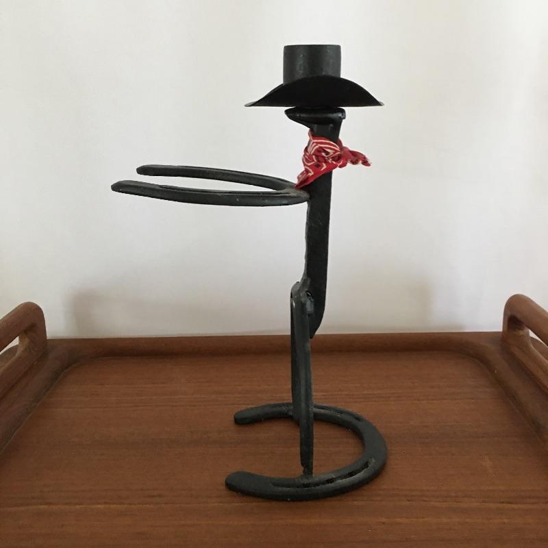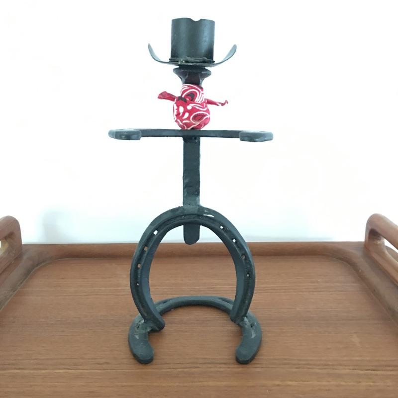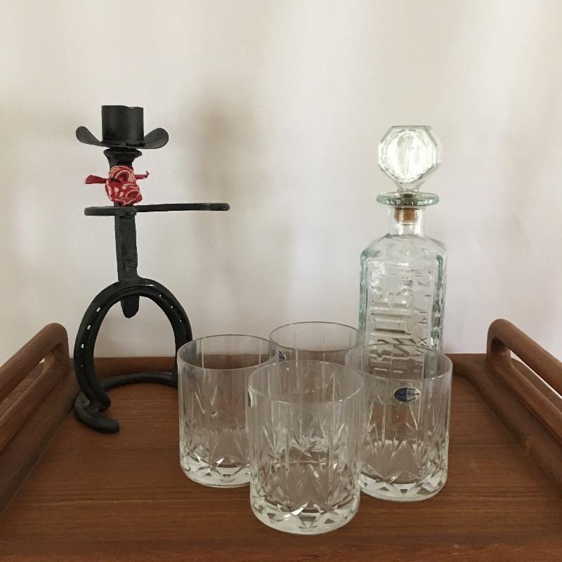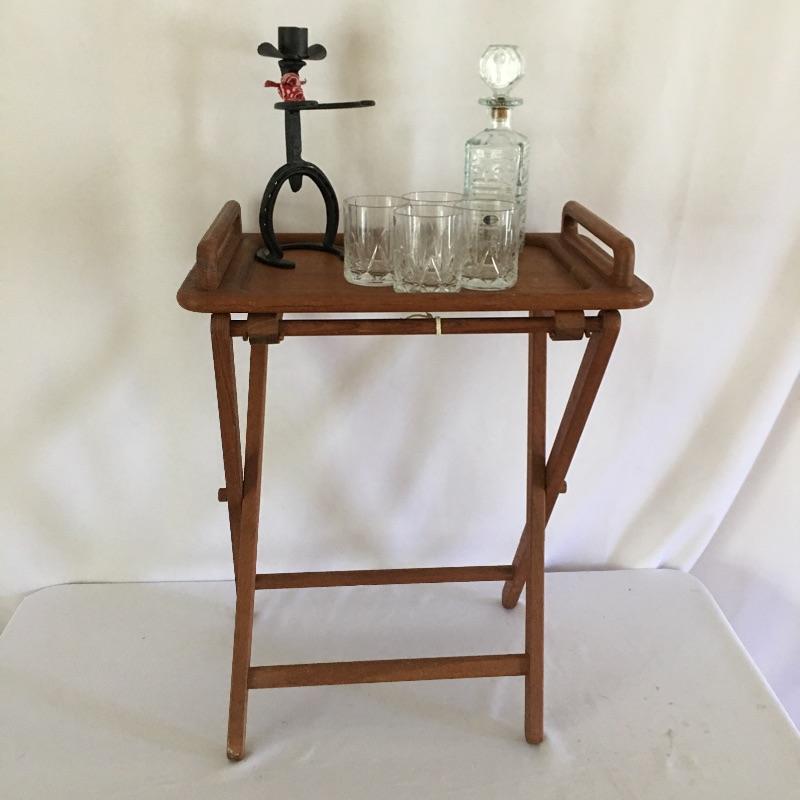 Add some classy rustic decor to your next beverage! Lot includes folding teak stand and tray, four lead crystal glasses, Walker decorative license plate bourbon bottle. We’ve added a iron cowboy made out of horseshoes, railroad spike to up the ante. Stand and tray measure 14” x 22” x 28”. A great stand to use as a portable bar or whatever else you can think of.